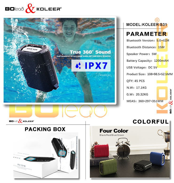 KOLEER 시리즈 S31 방수 블루투스 스피커 야외 휴대용 승마 카드 서브 우퍼 미니 스피커