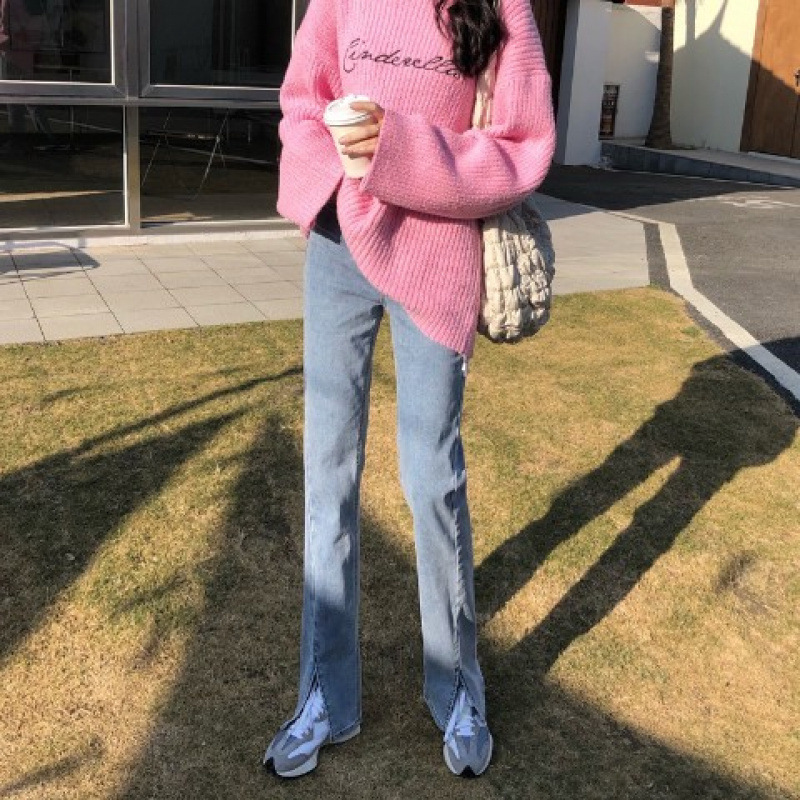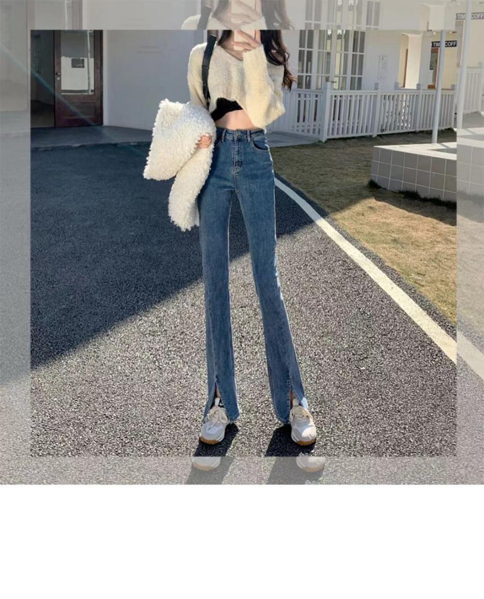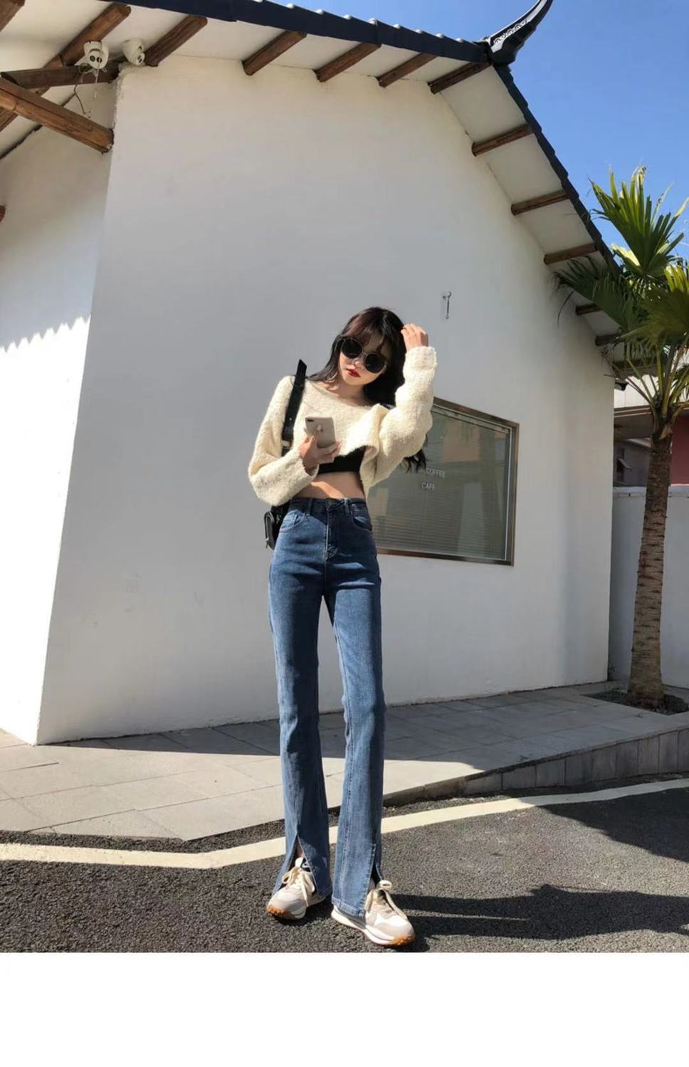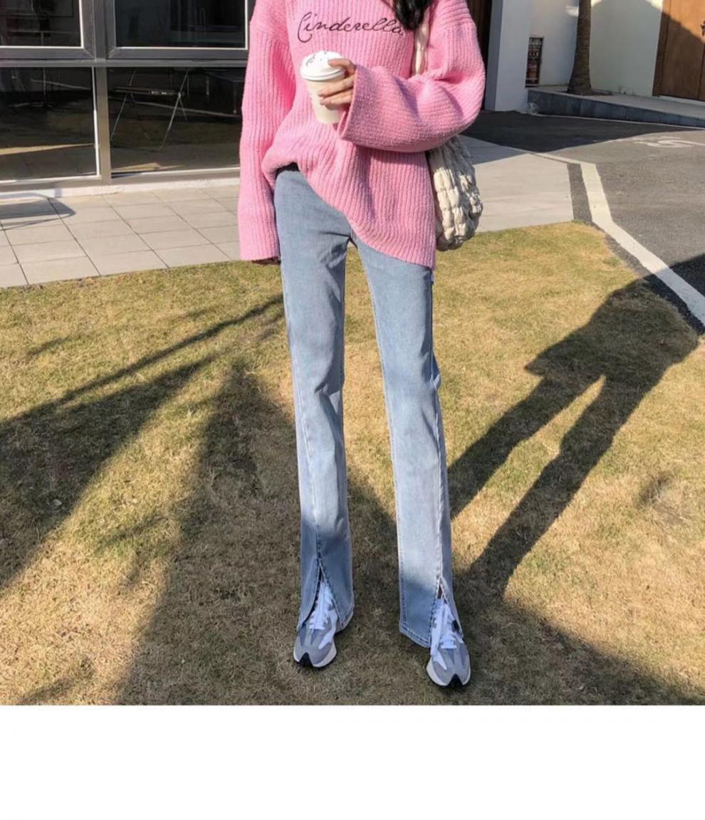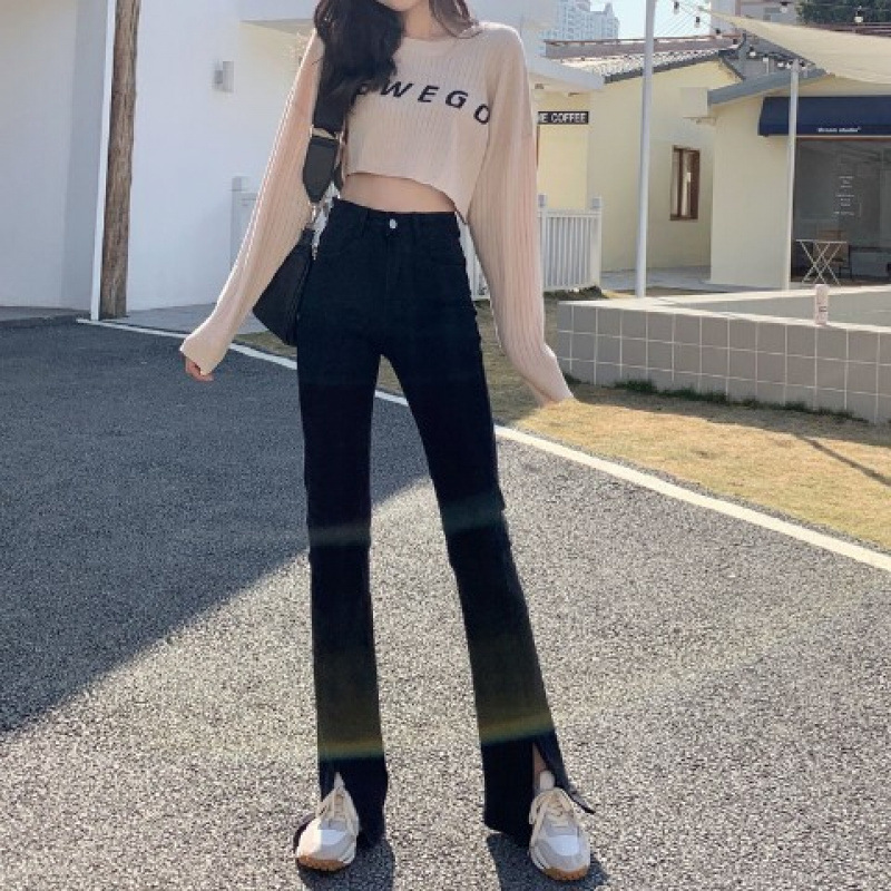 높은 허리 스트레치 드래핑 팬츠 약간 쪼개진 여성용 느슨한 슬리밍 넓은 다리 스플릿 트렌디 벤트 플라 드 팬츠스토어 가기