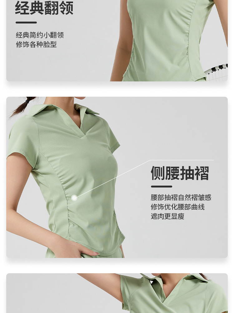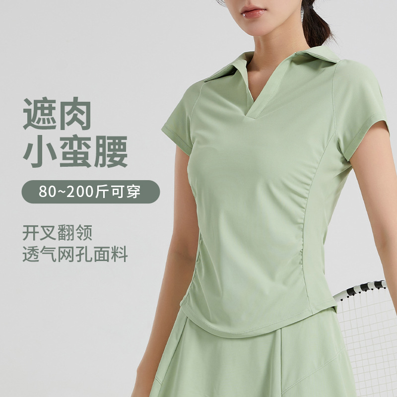 폴로 칼라 반팔 티셔츠 여성 여름 2025 디자인 센스 주름 허리 핫 소녀 어깨 상단 국경 요가 옷스토어 가기