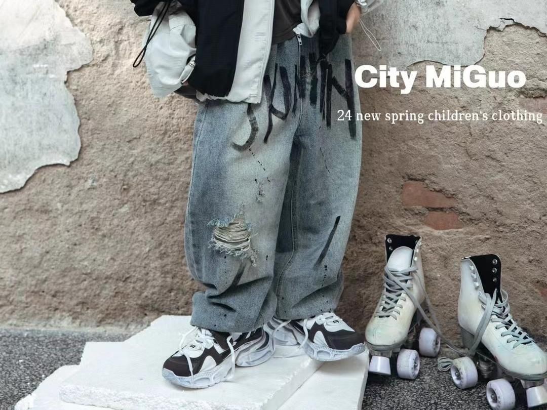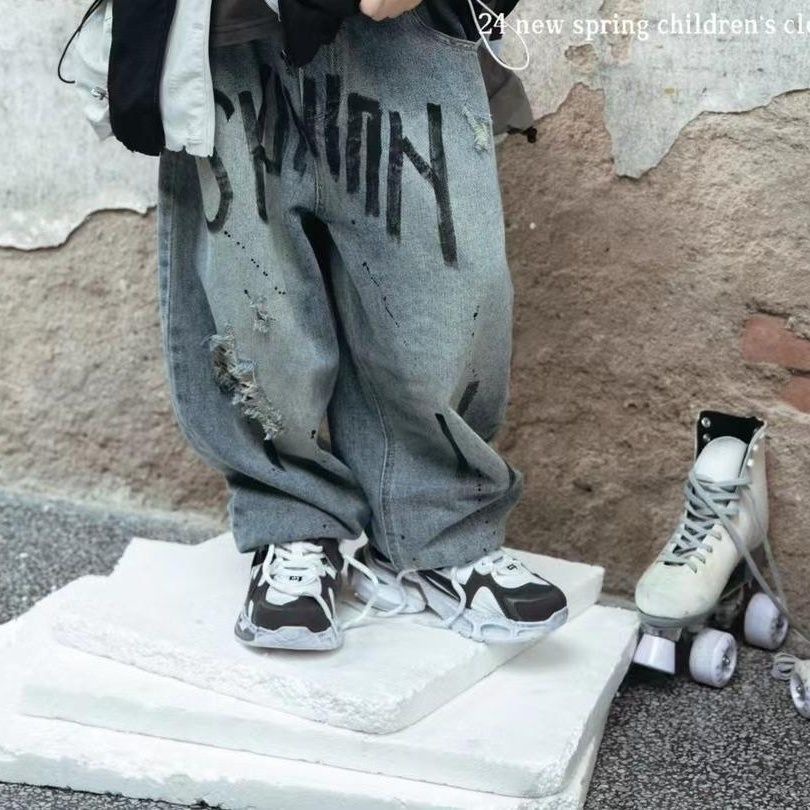 봄과 가을 남녀 아동복 청바지 아기의 서양식 어린이 맞춤형 유행 브랜드 한국식 낙서 편지 찢어짐 아빠 바지스토어 가기
