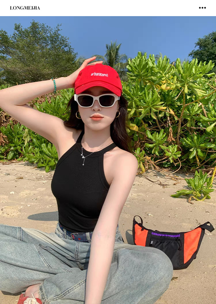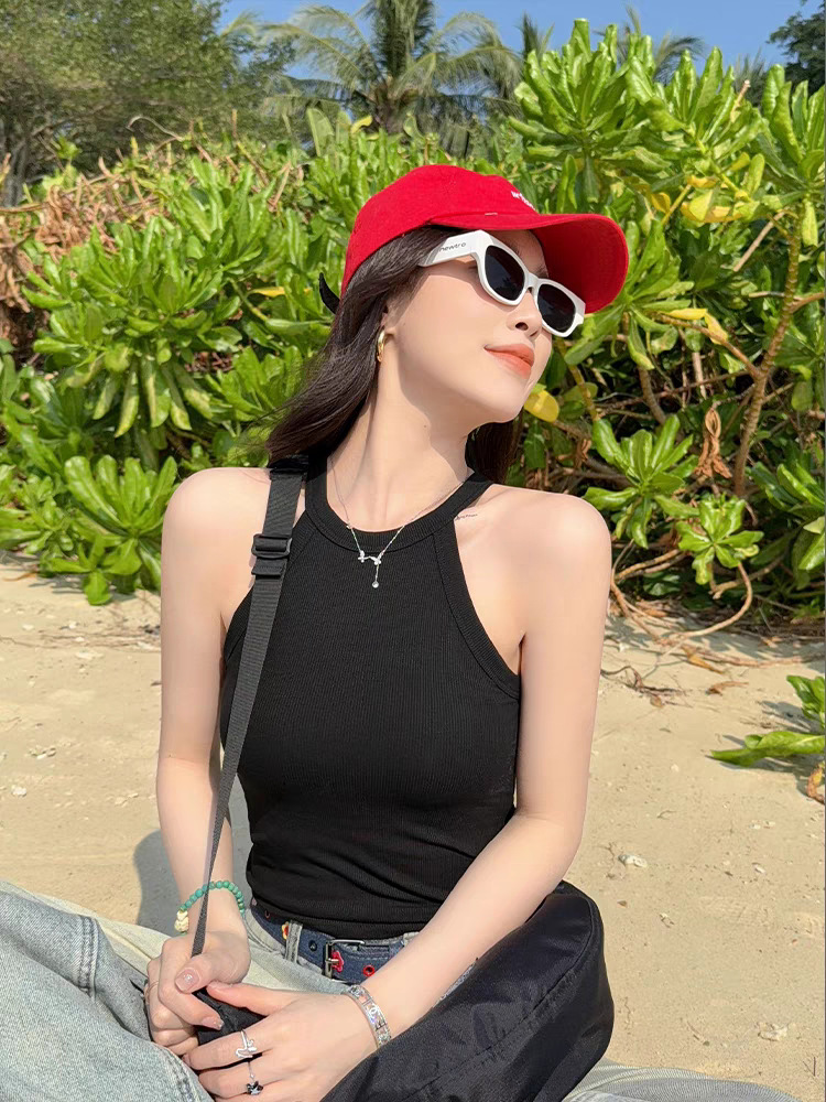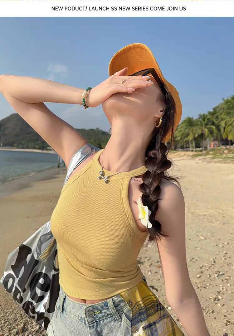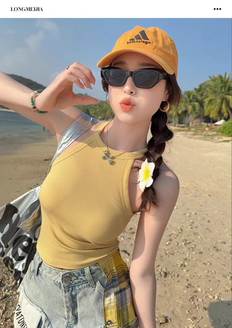 니트 홀터 카미 솔 여성의 여름 밝은 노란색 2025 새로운 복장 민소매 보텀 없음 가슴 패드 최고 국경스토어 가기