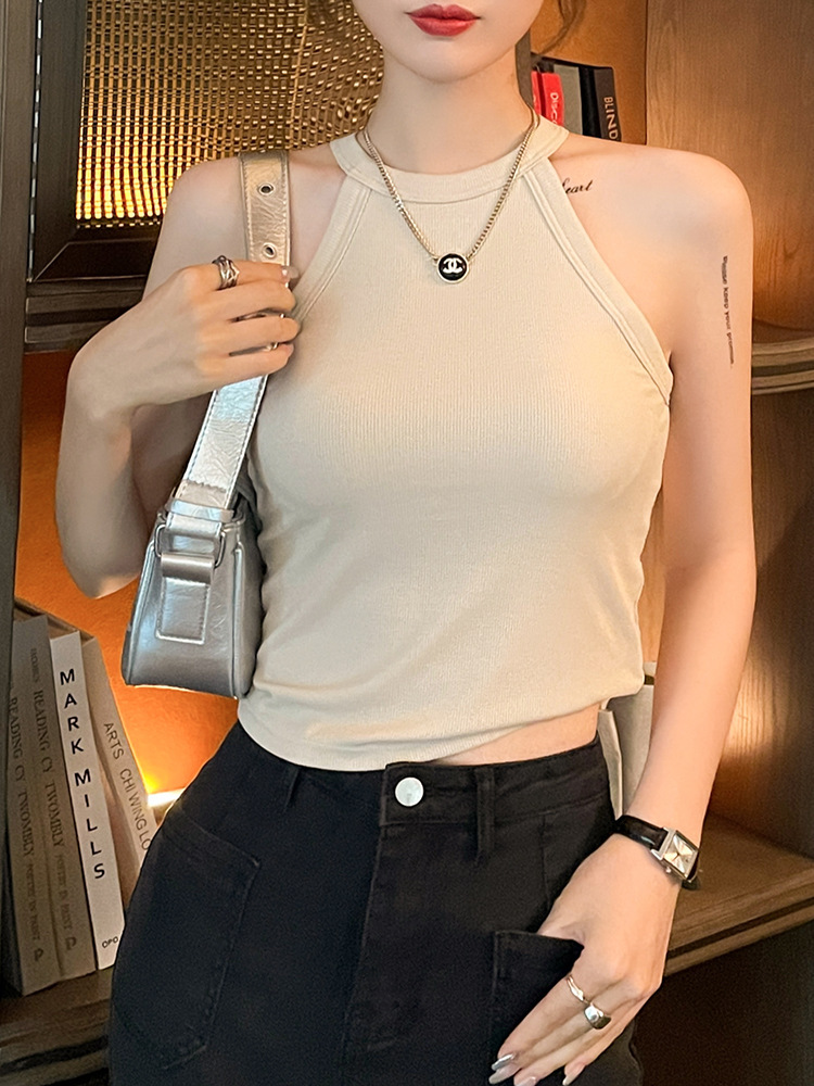 니트 홀터 카미 솔 여성의 여름 밝은 노란색 2025 새로운 복장 민소매 보텀 없음 가슴 패드 최고 국경