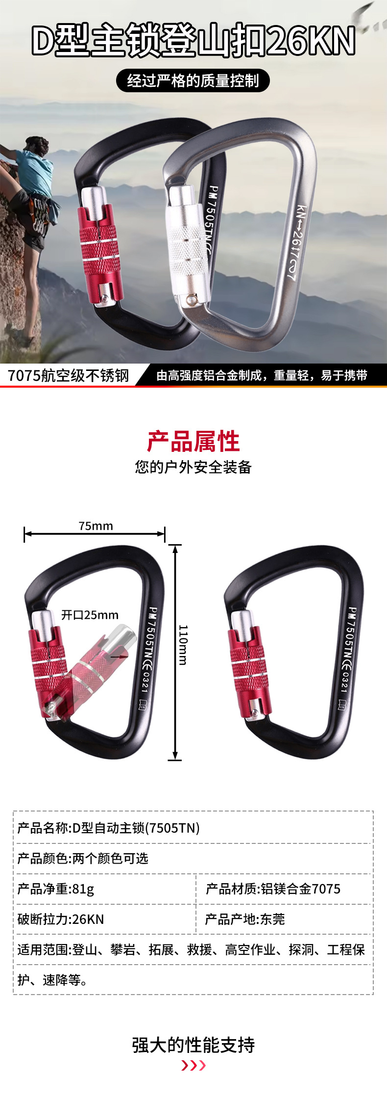 새로운 공장 야외 등산 및 암벽 등반 자동 잠금 D 형 메인 잠금 카라비너 에어 요가 교수형 후크 26KN