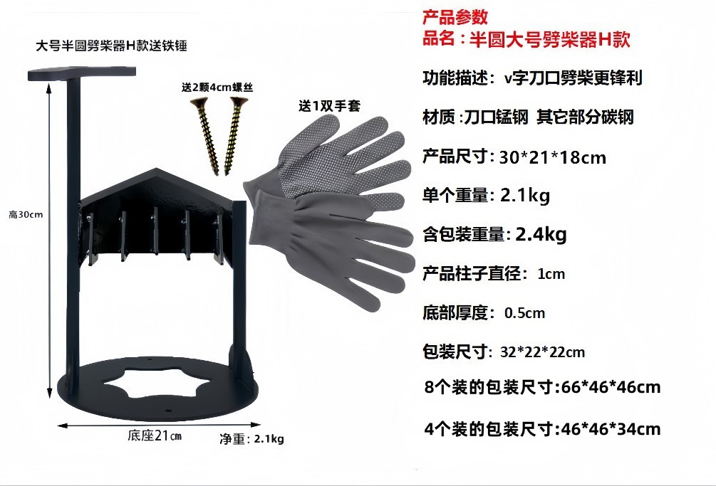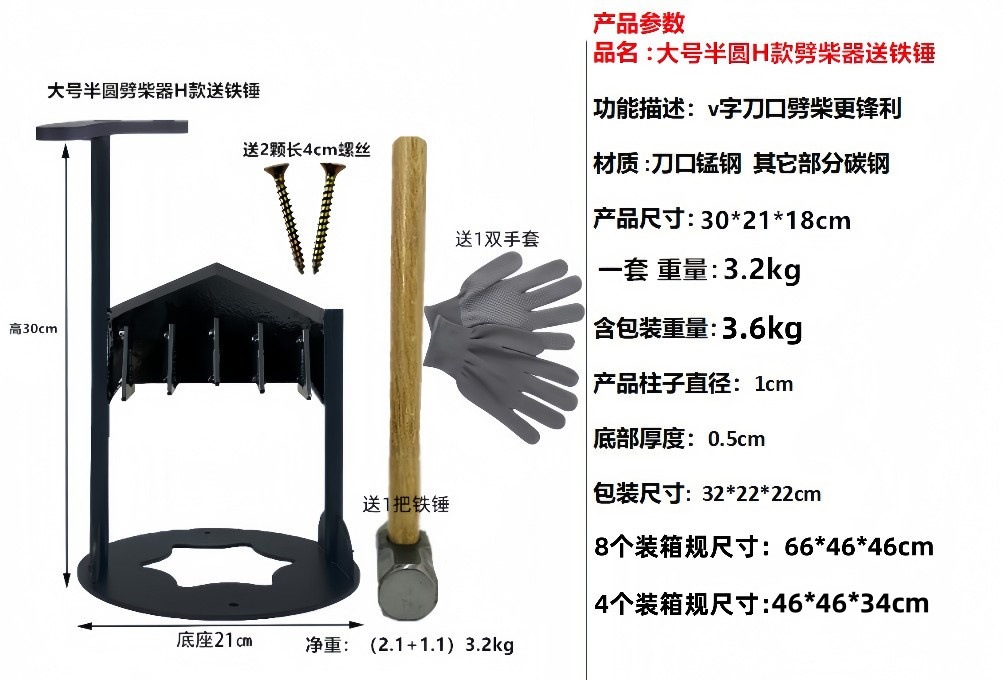• 반원형 H형 대형 목재 쪼개는 도구에는 망치 세트가 함께 제공됩니다.