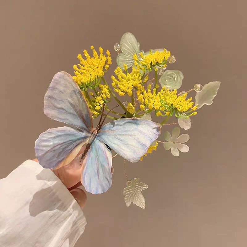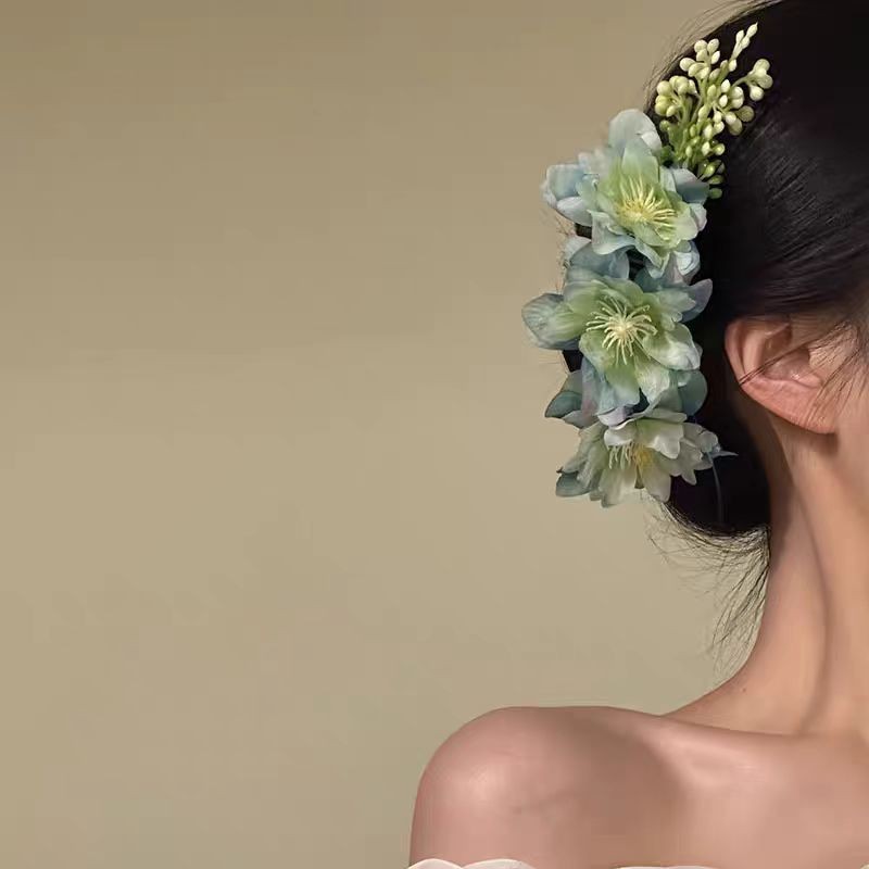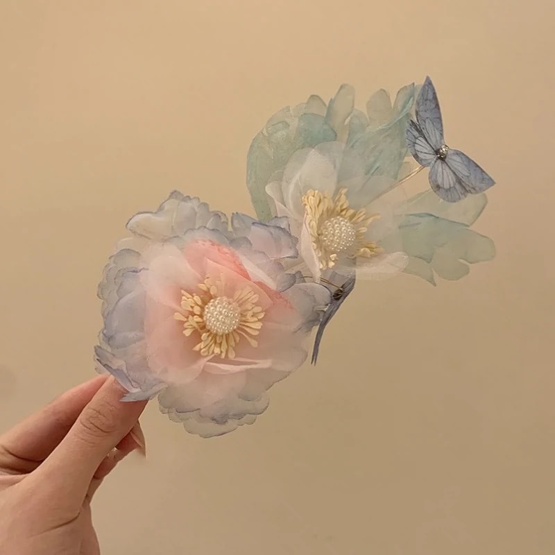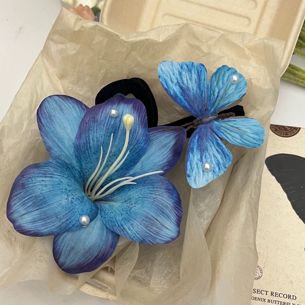 • 나비 블루 그린 빅 플라워 헤어 클립