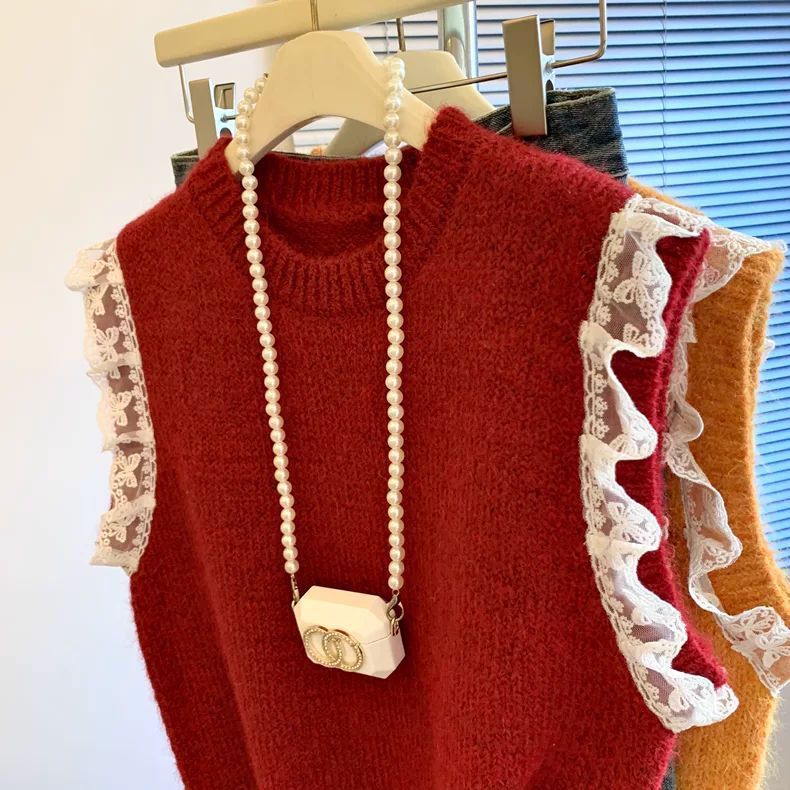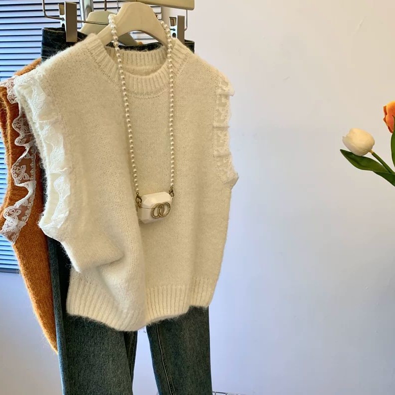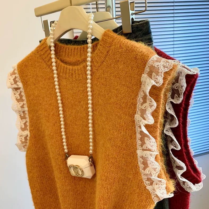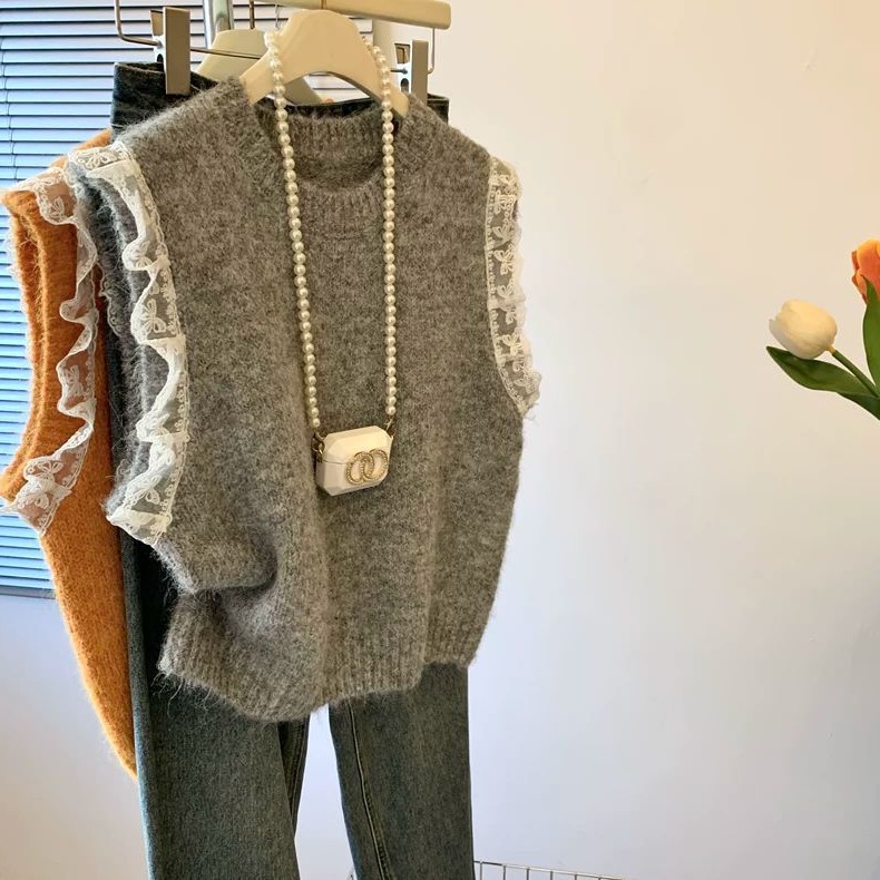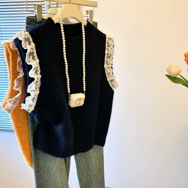 독특한 한국 스타일 레이스 바느질 니트 조끼 여성의 가을과 겨울 새로운 디자인 감각은 민소매 탑스토어 가기