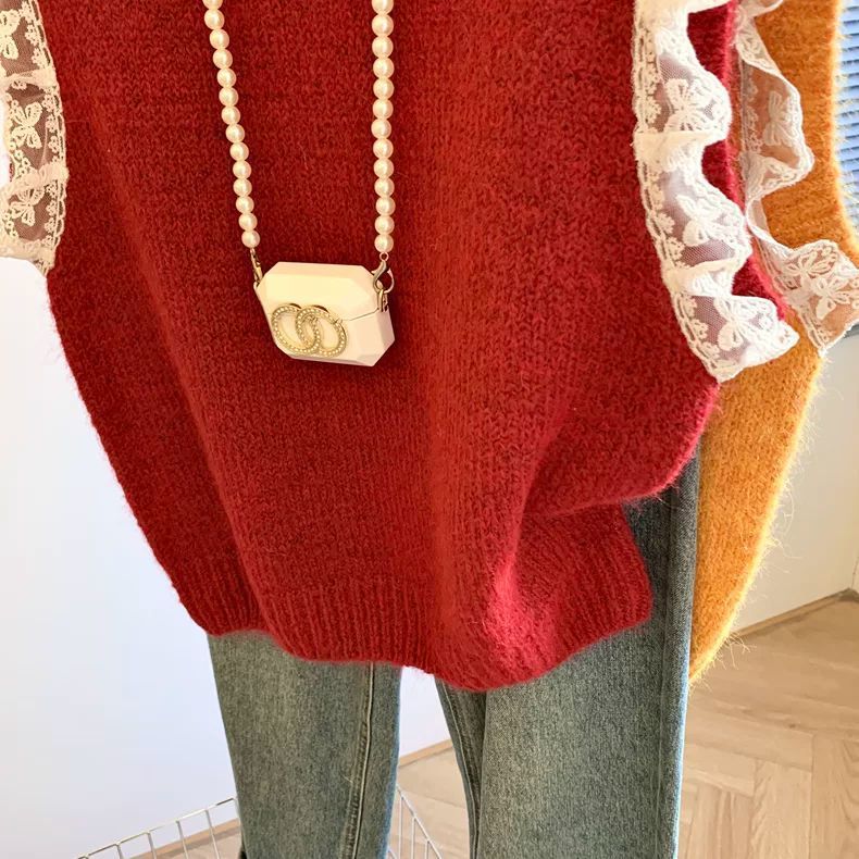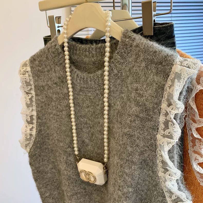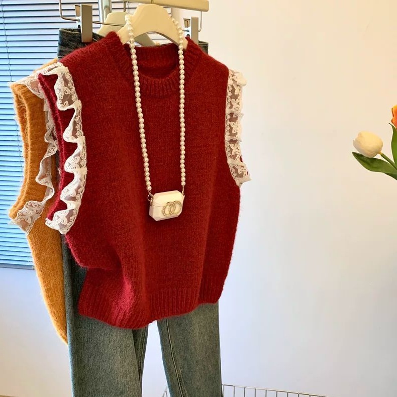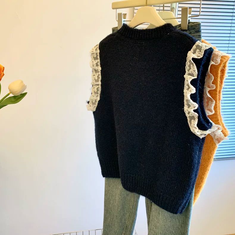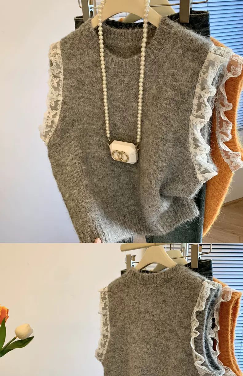 독특한 한국 스타일 레이스 바느질 니트 조끼 여성의 가을과 겨울 새로운 디자인 감각은 민소매 탑스토어 가기