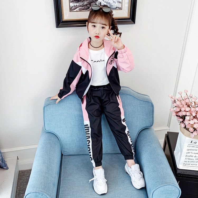 소녀 봄 원피스 세트 2025 새로운 어린이 소녀 봄과 가을 후드 편지 컬러 분할 스포츠 레저 투피스 세트스토어 가기