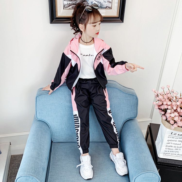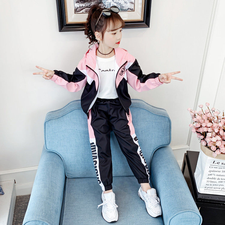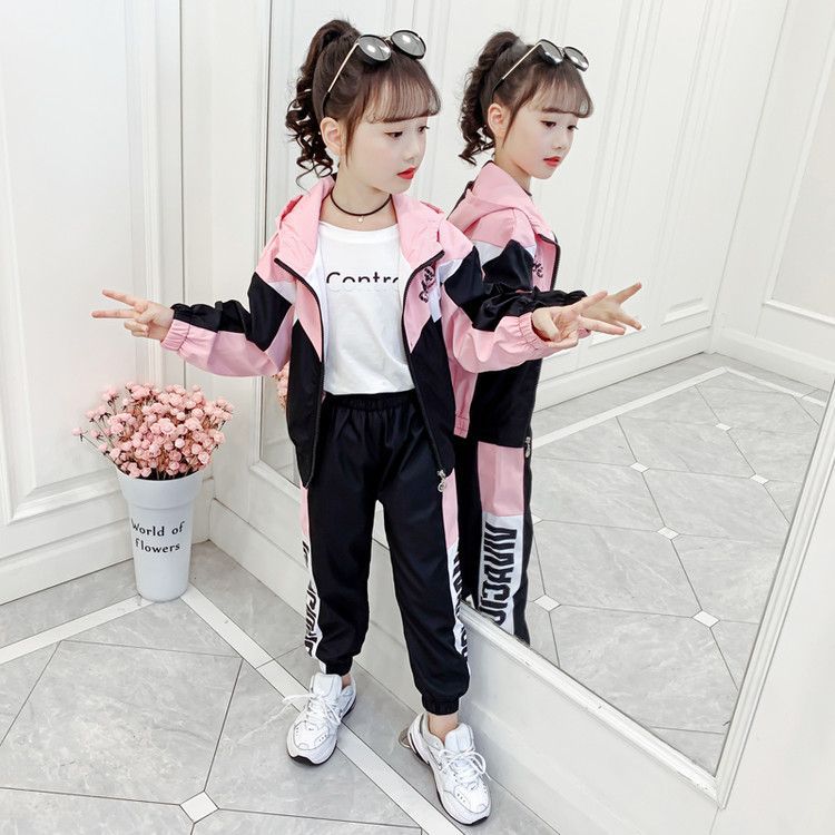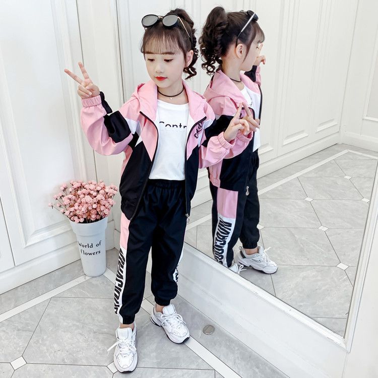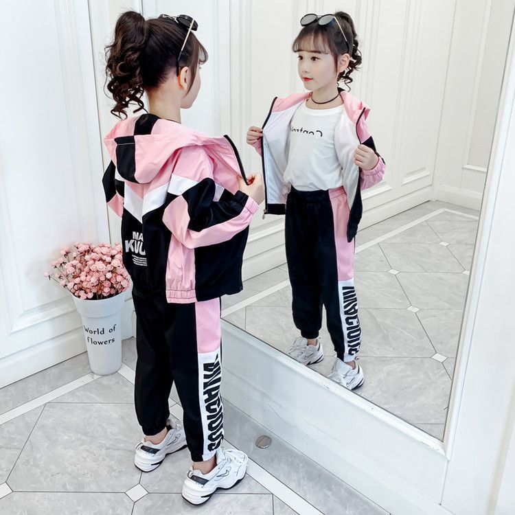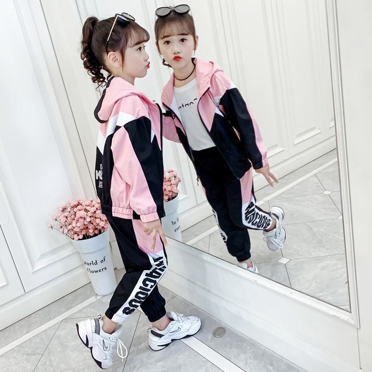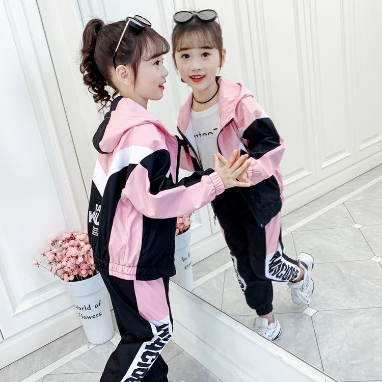 소녀 봄 원피스 세트 2025 새로운 어린이 소녀 봄과 가을 후드 편지 컬러 분할 스포츠 레저 투피스 세트