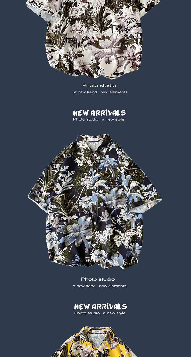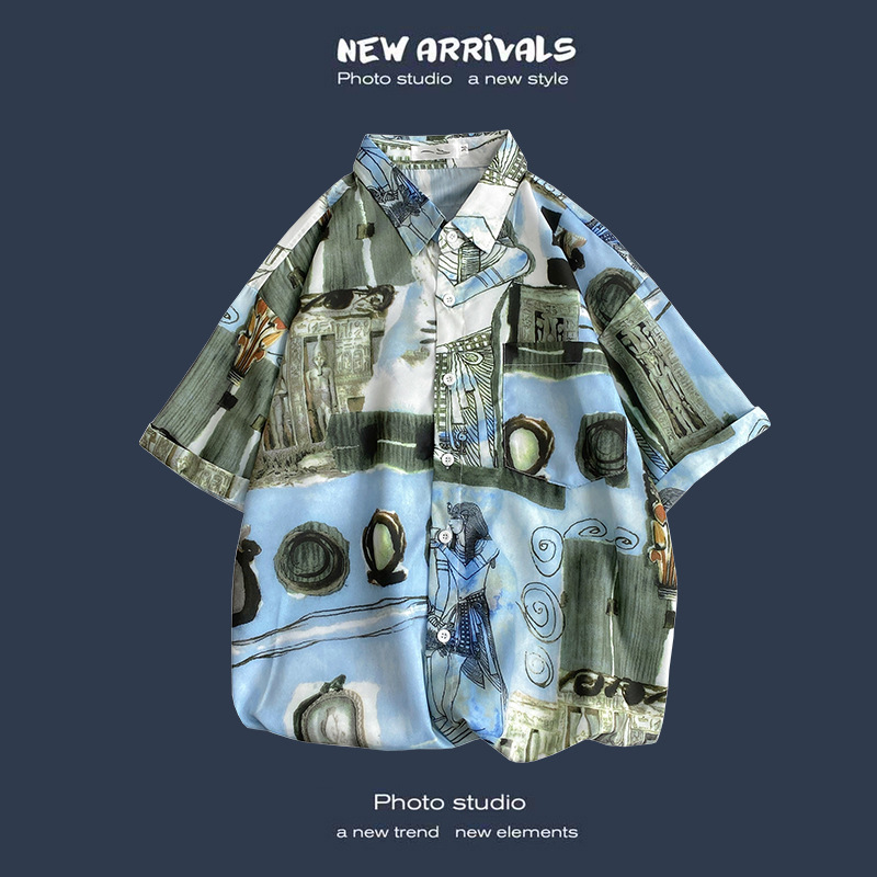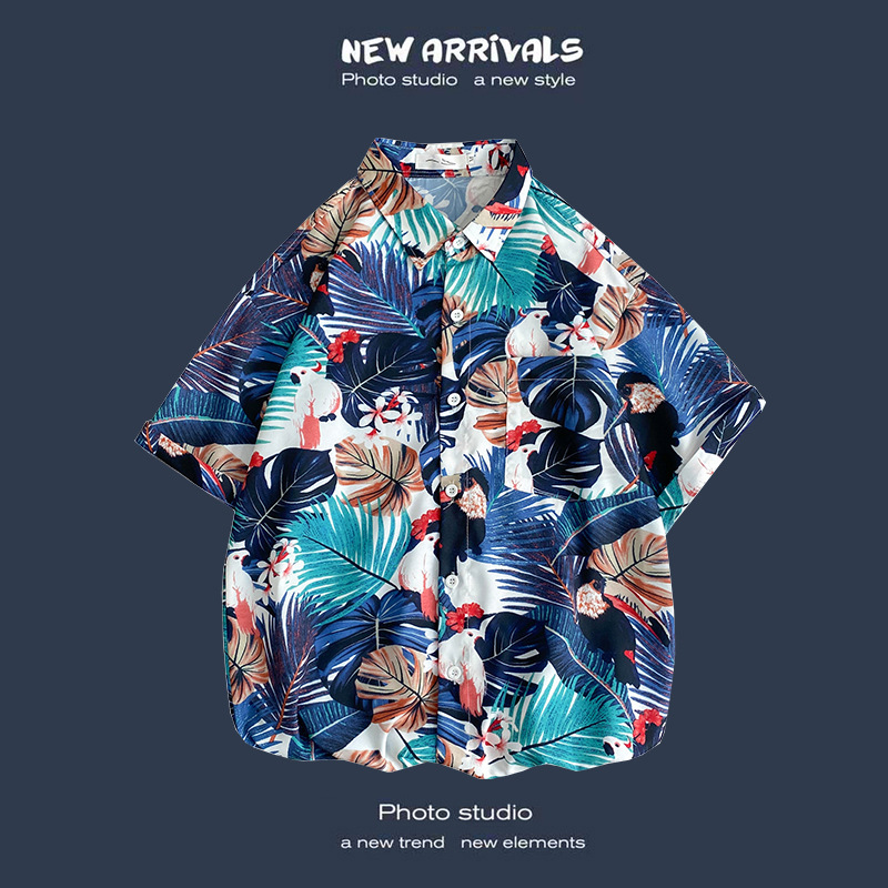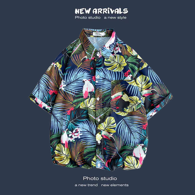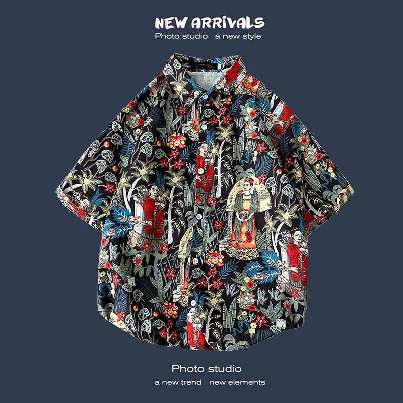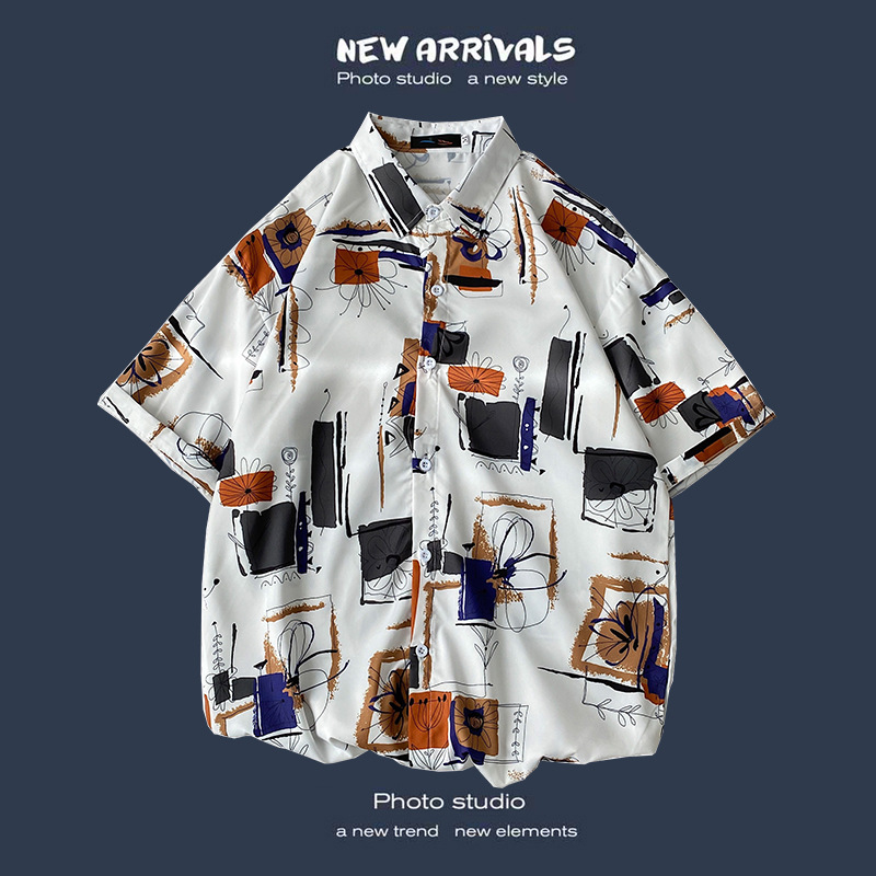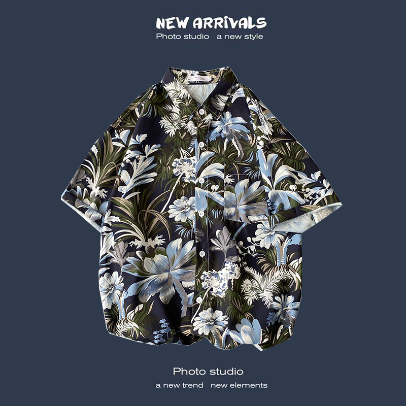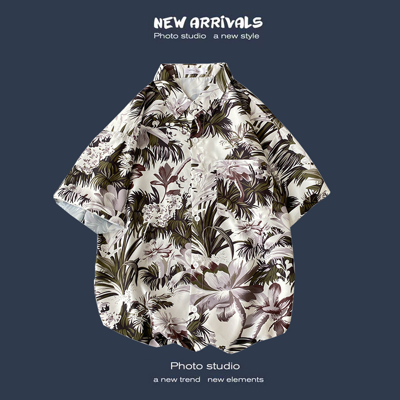 여름 새로운 한국 스타일 Ins 홍콩 스타일 레트로 꽃 얇은 커플 셔츠 탑 느슨한 반팔 셔츠 남성 트렌디스토어 가기