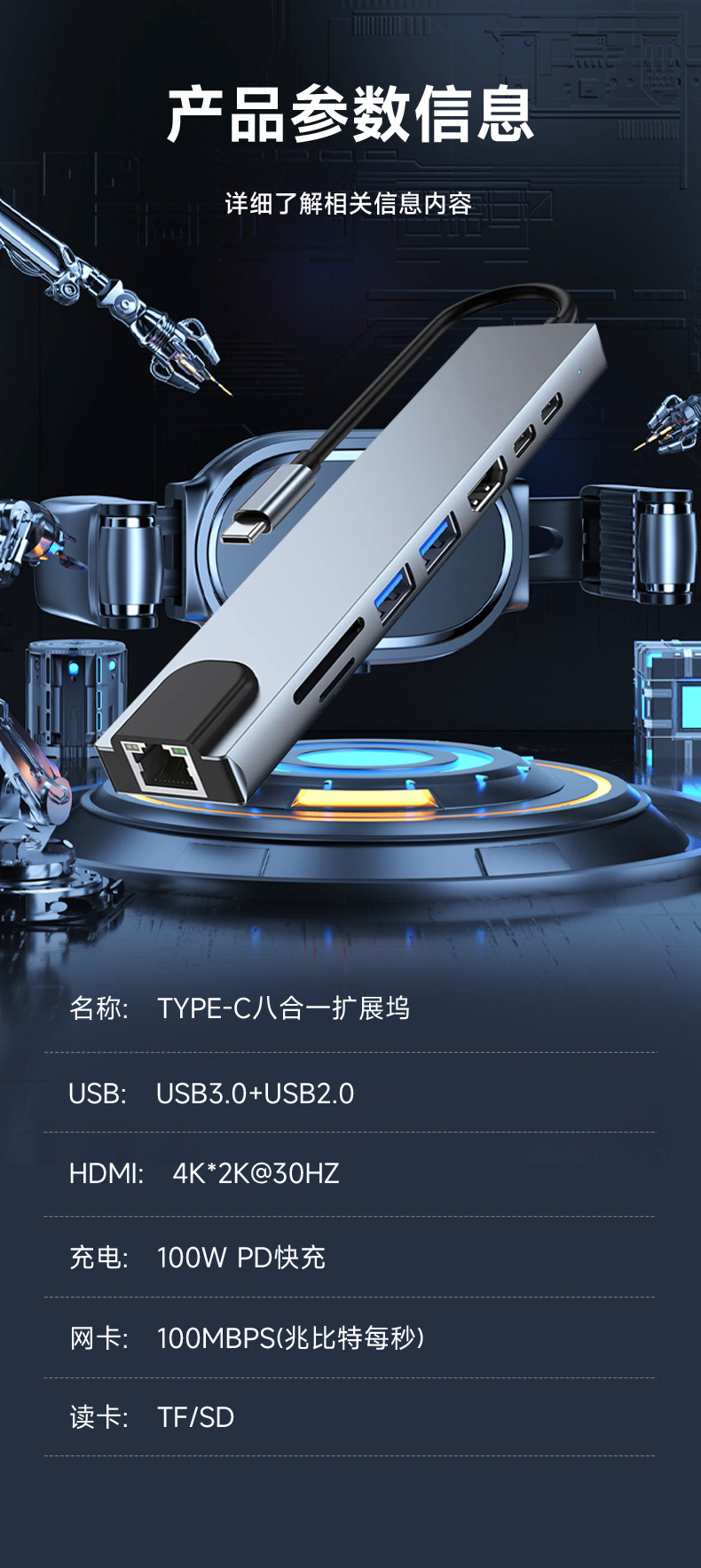 크로스보더 타입C to HDMI 확장 도크 디지털 컴퓨터 게임기 허브 USB to 허브 8-in-1 네트워크 카드스토어 가기