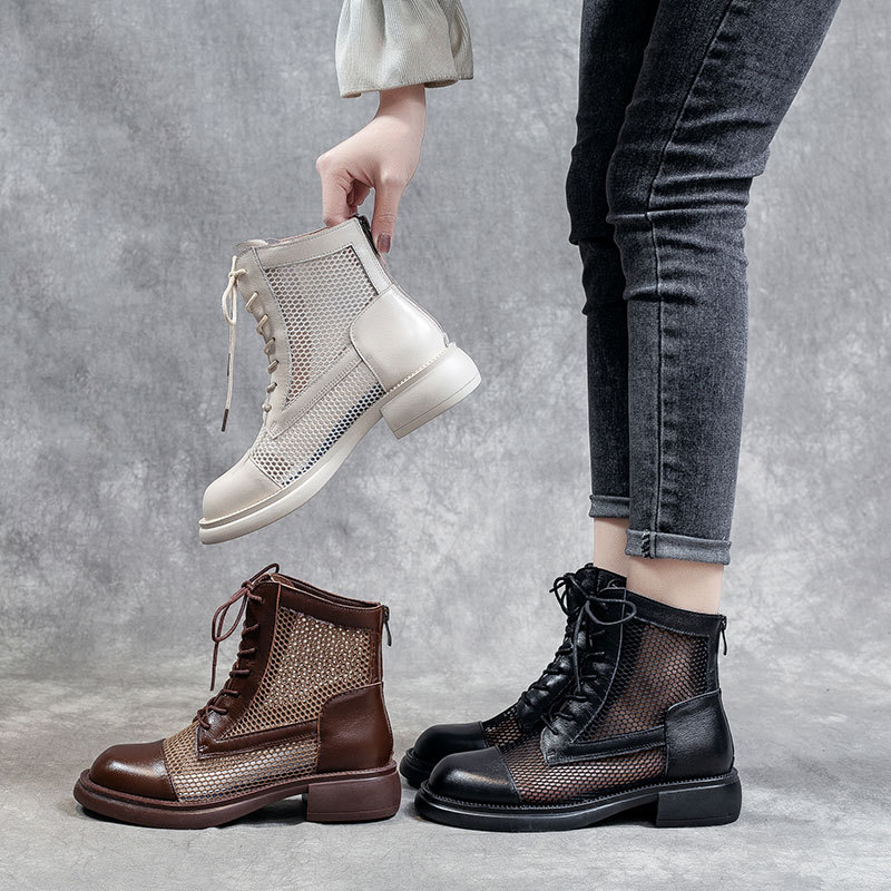 공장 도매 첫 번째 레이어 소 가죽 메쉬 마틴 부츠 여성 홀 부츠 여름 두꺼운 힐 여성 부츠 통기성 로우 부츠