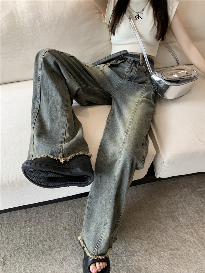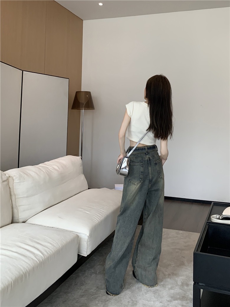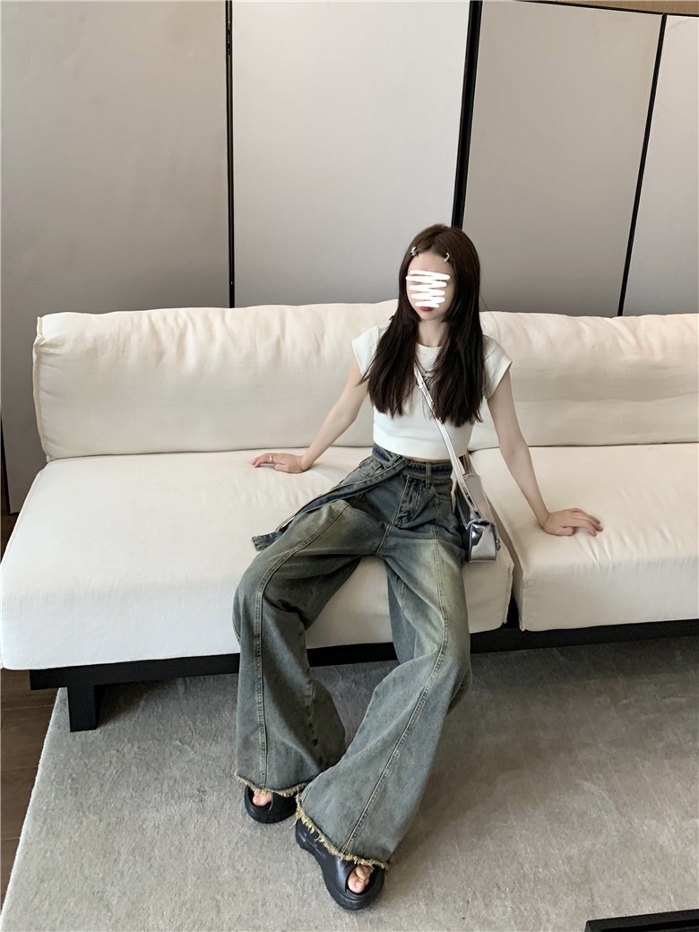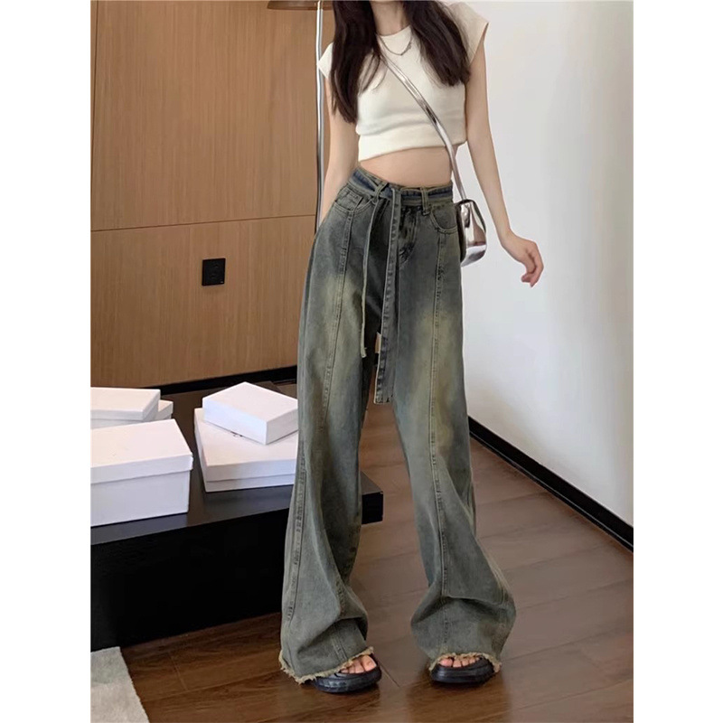아메리칸 레트로 청바지 여성 여름 구식 작은 높은 허리 랩 느슨한 바지 넓은 다리 바지스토어 가기