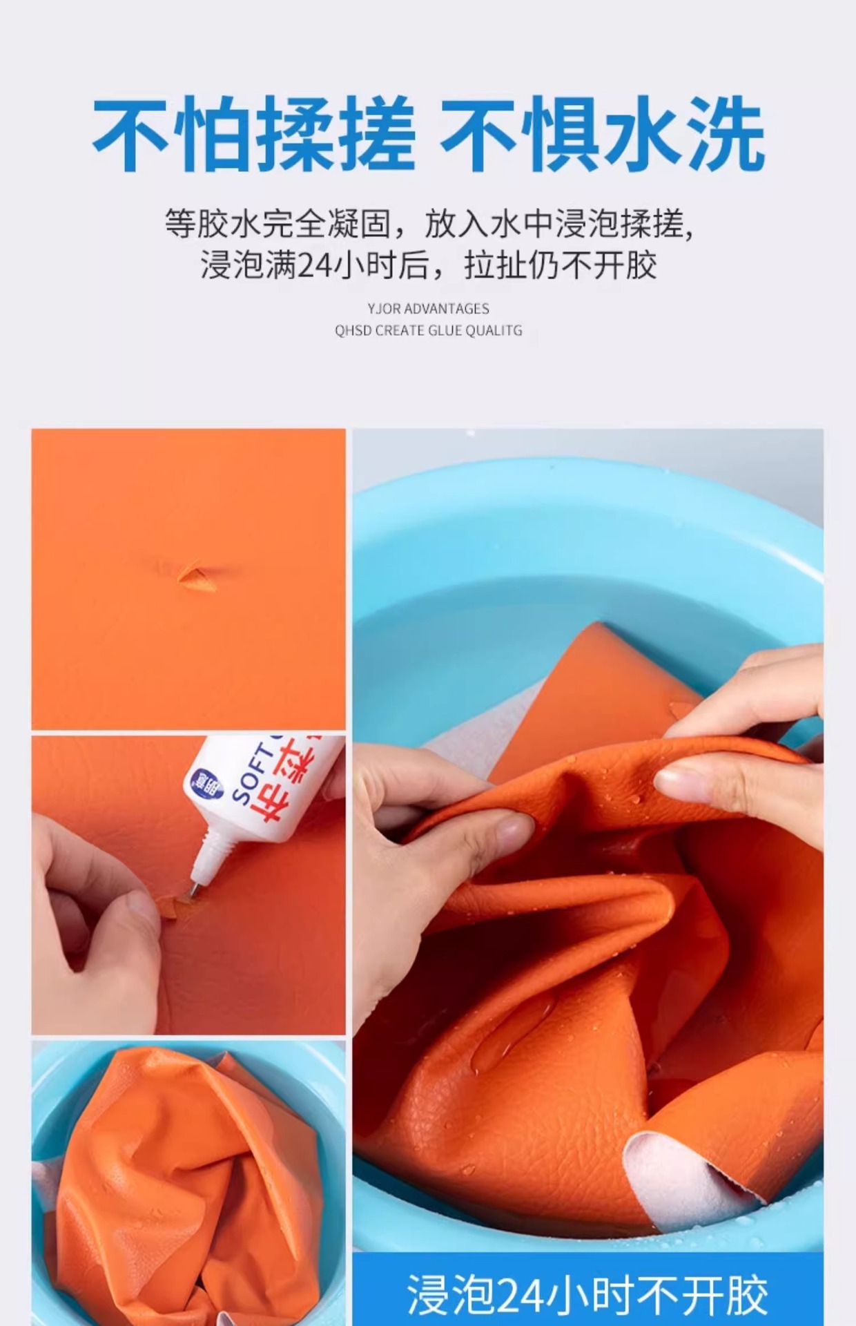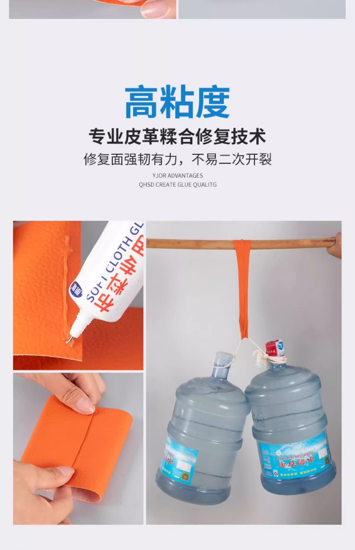 가죽 접착제는 가죽 표면, 직물 및 의류를 손상시키지 않습니다. 특수 흔적 없는 부드러운 접착제, 강력하고 투명하며 세탁 가능합니다.
