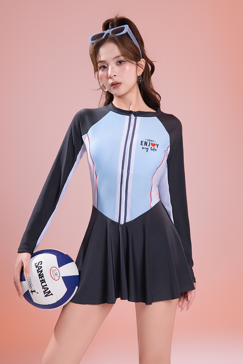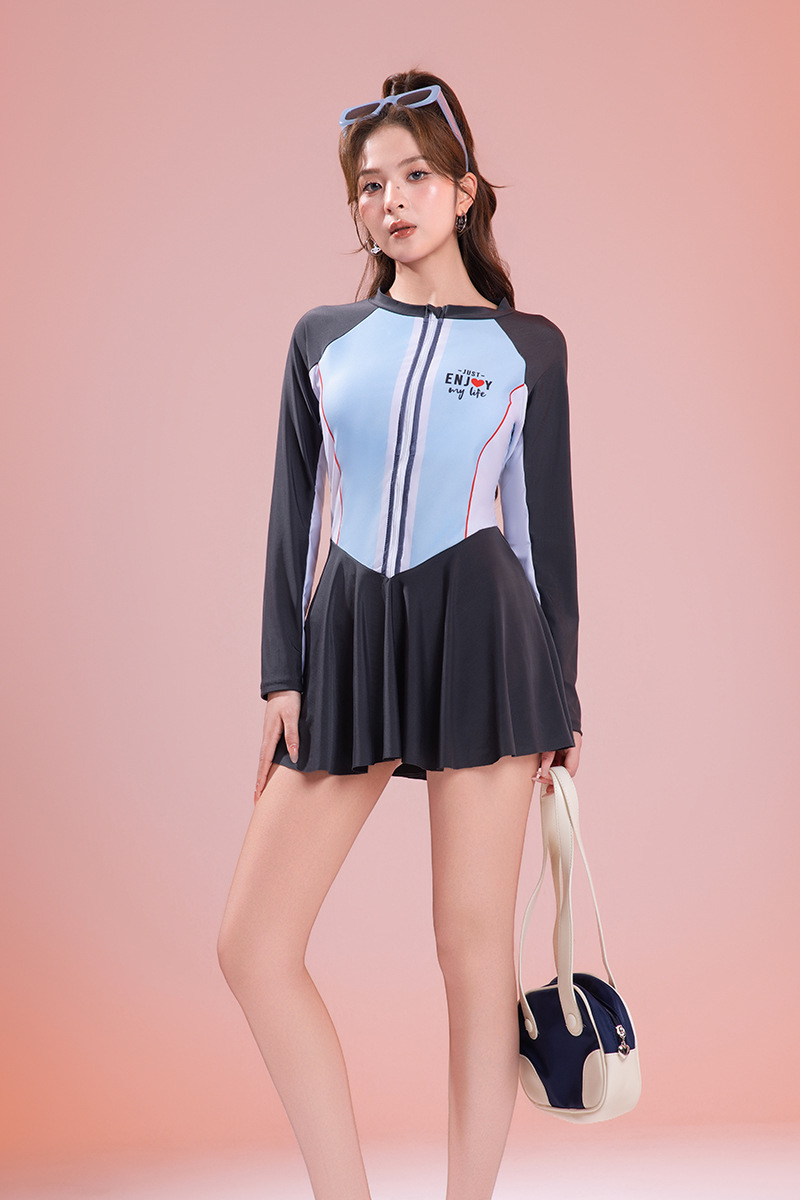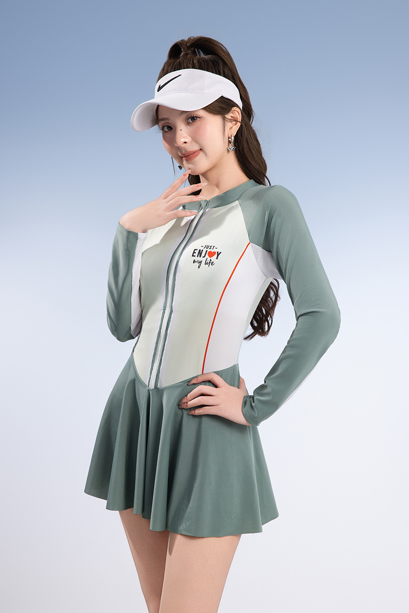 2025 새로운 수영복 여성 원피스 스커트 온천 휴가 보수적 인 선 스크린 긴팔 수영복 폴리 에스테르 빠른 건조 핫 세일스토어 가기