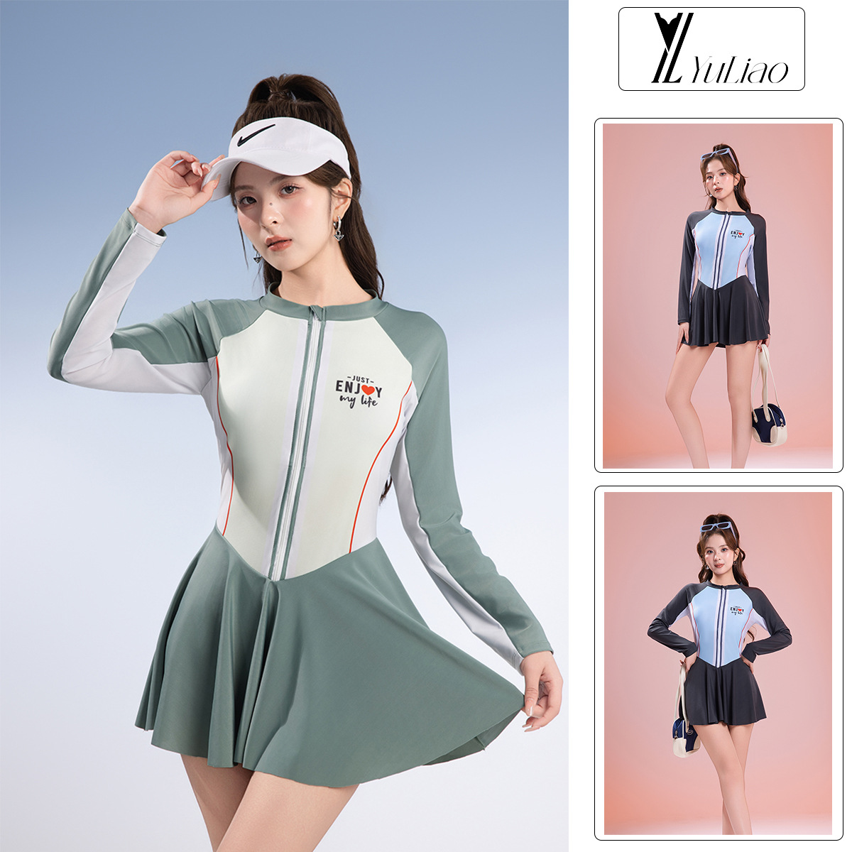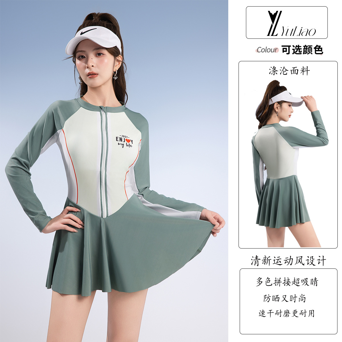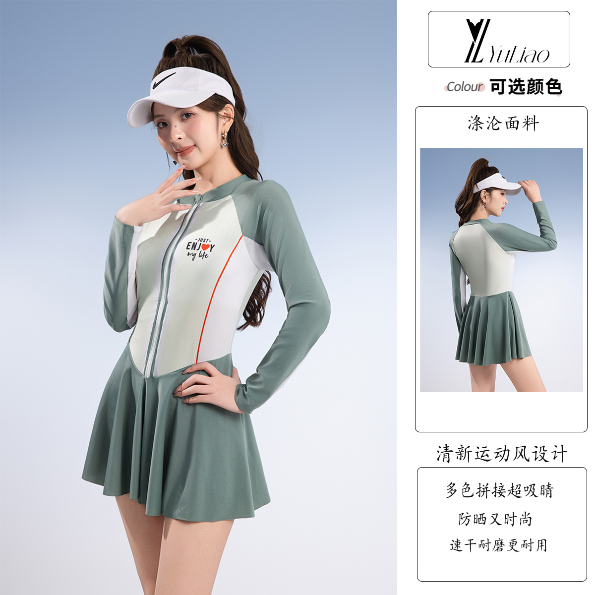 2025 새로운 수영복 여성 원피스 스커트 온천 휴가 보수적 인 선 스크린 긴팔 수영복 폴리 에스테르 빠른 건조 핫 세일스토어 가기