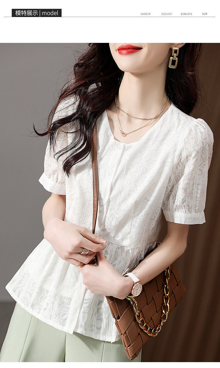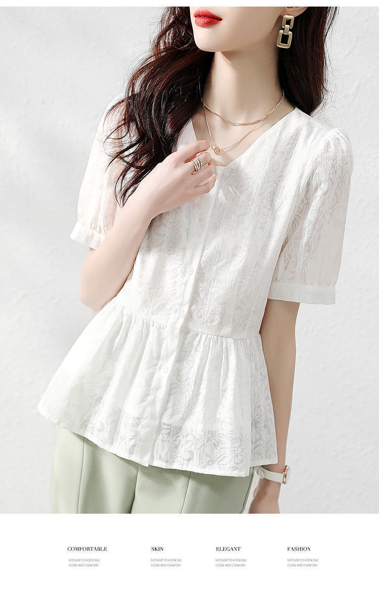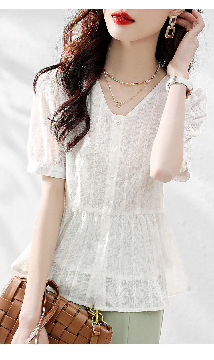 반팔 레이스 셔츠 여성 2023 여름 새로운 우아한 우아한 통근 패션 캐주얼 느슨한 한국식 V 넥 셔츠스토어 가기