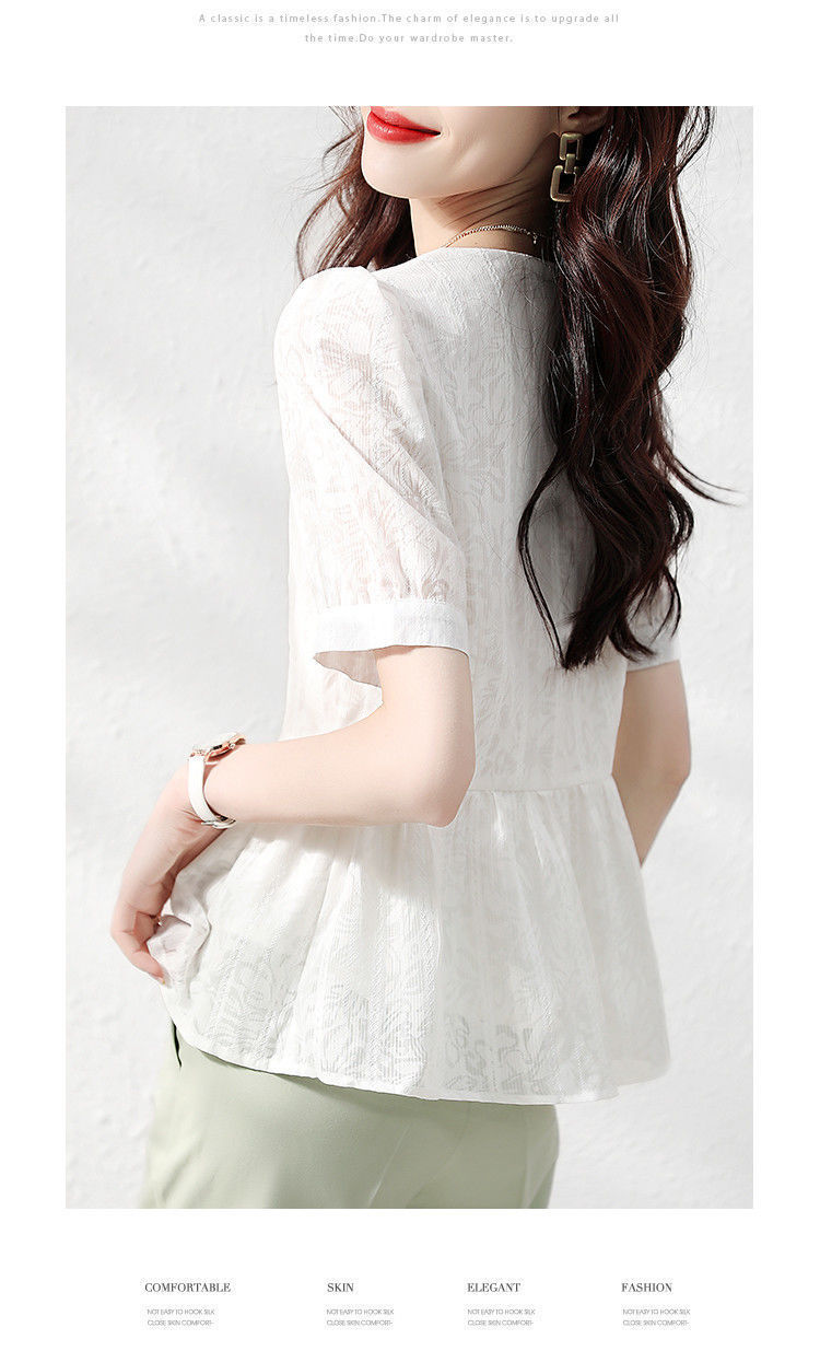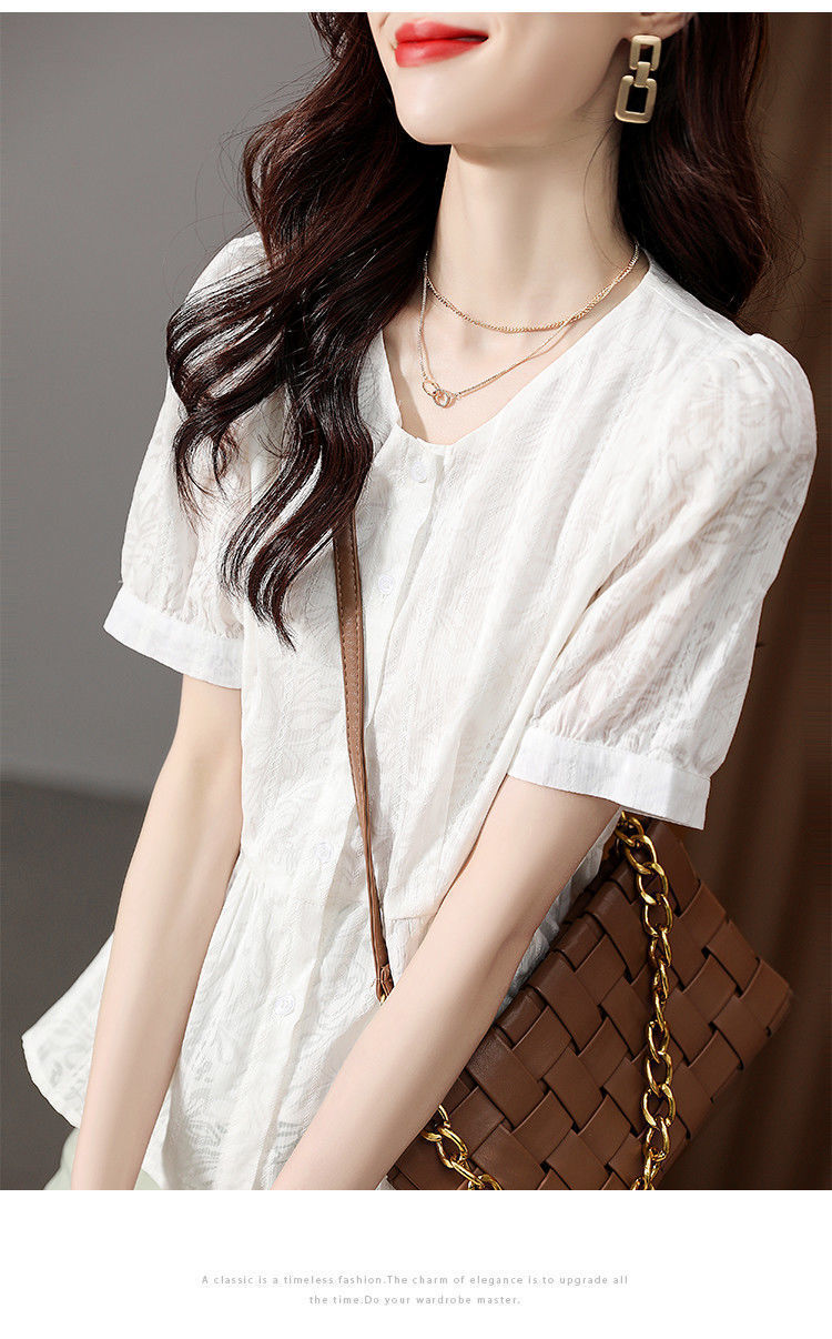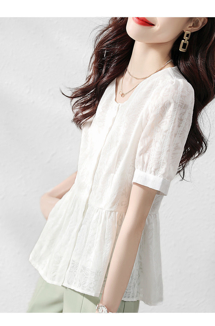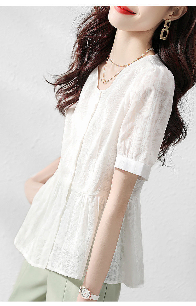 반팔 레이스 셔츠 여성 2023 여름 새로운 우아한 우아한 통근 패션 캐주얼 느슨한 한국식 V 넥 셔츠스토어 가기