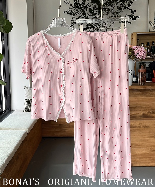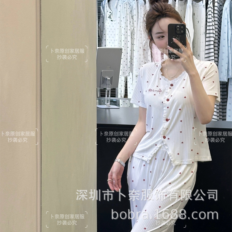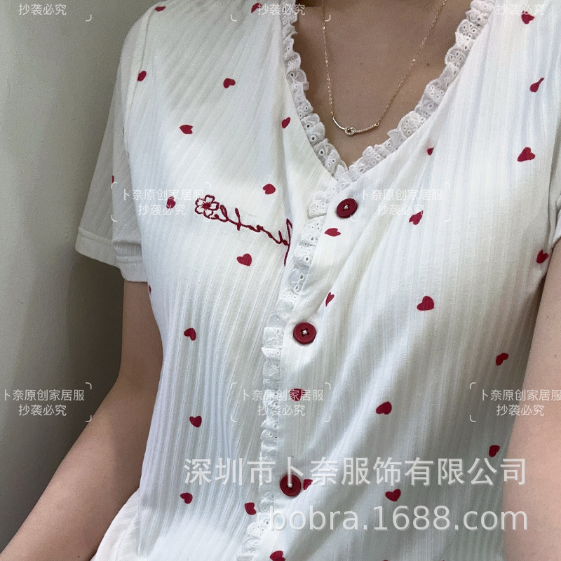 봄과 여름 새로운 오리지널 프랑스 스위트 홈 의류 파자마 여성의 사랑은 가슴 패드와 자수 세트 카디건을 인쇄했습니다.스토어 가기