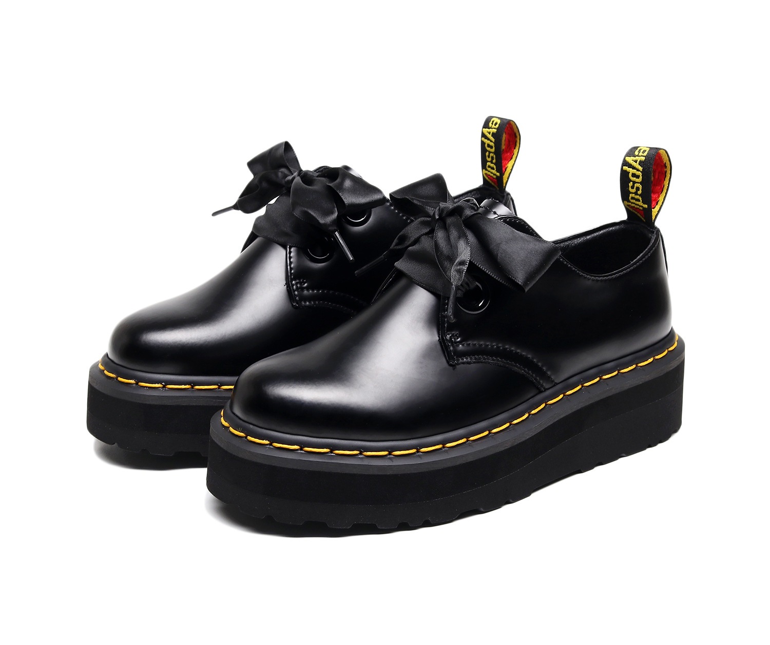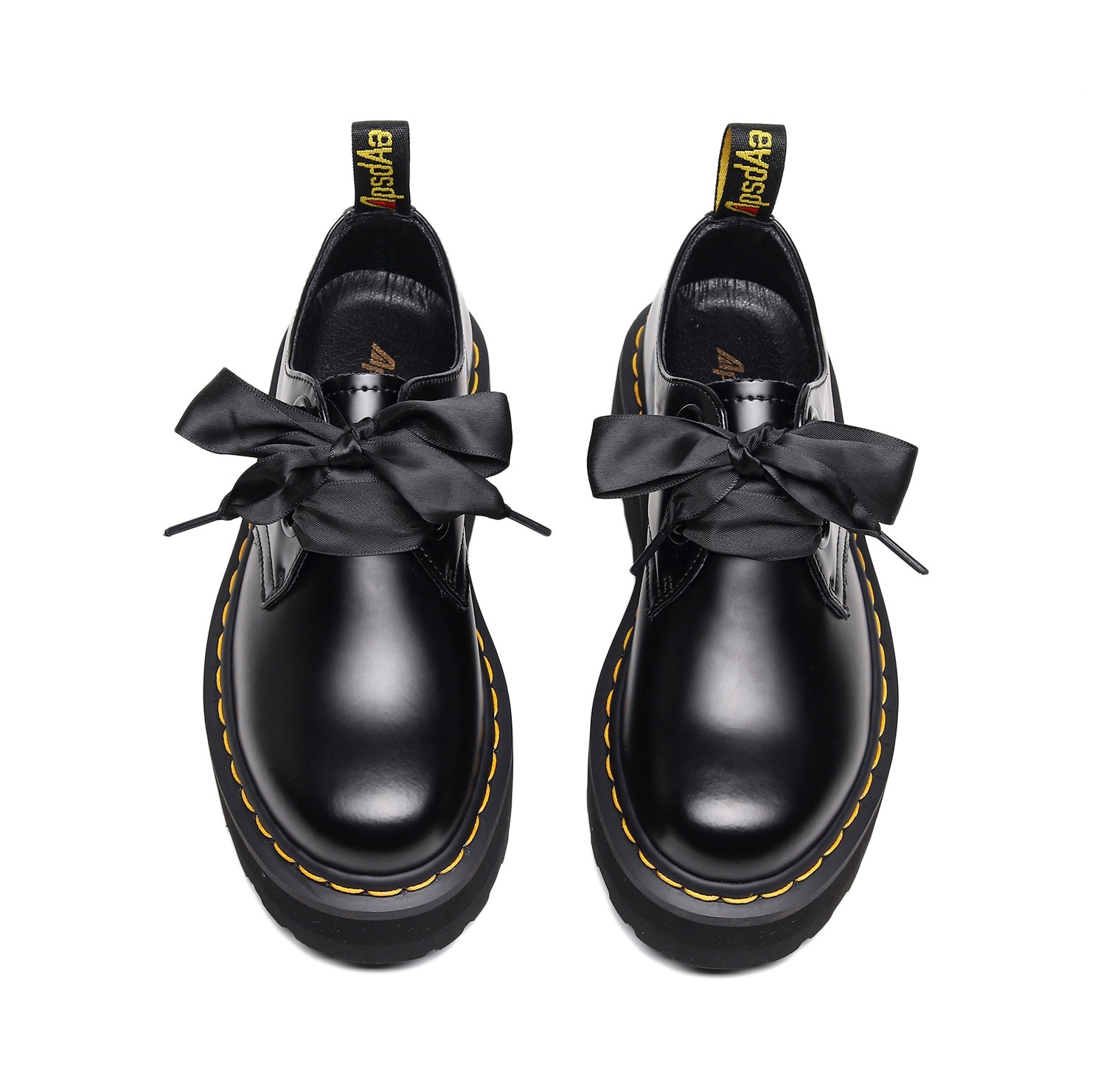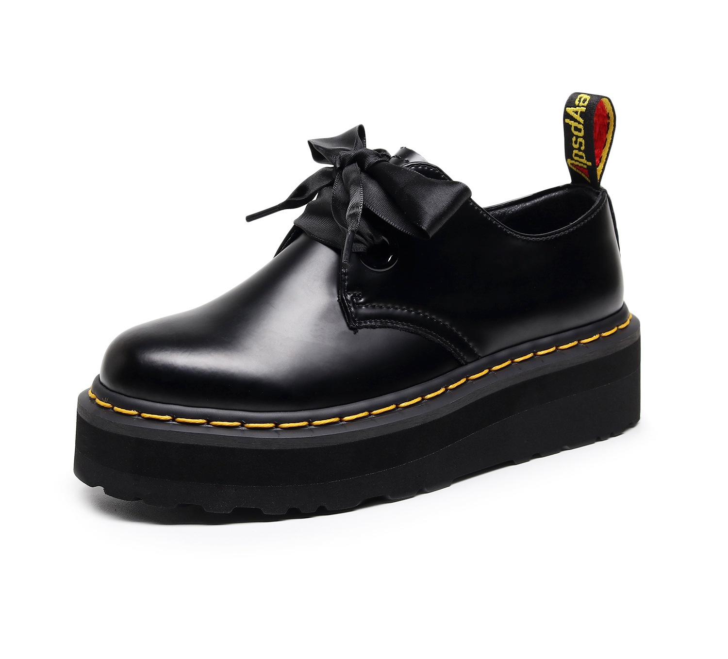 [발을 착용하지 마십시오] 라이트-2 홀 두꺼운 밑창 마틴 신발 블랙 로우 탑 가죽 신발 여성 리본 4 시즌 부츠스토어 가기