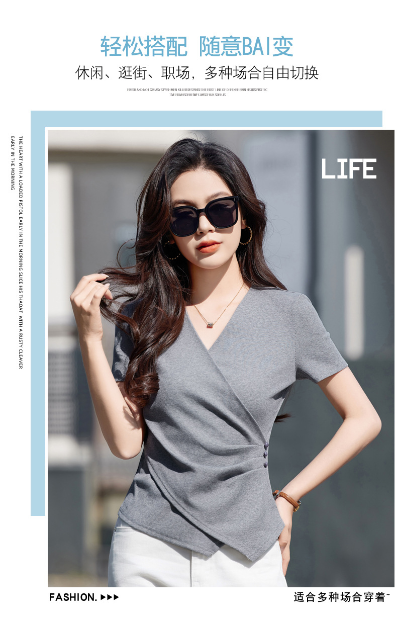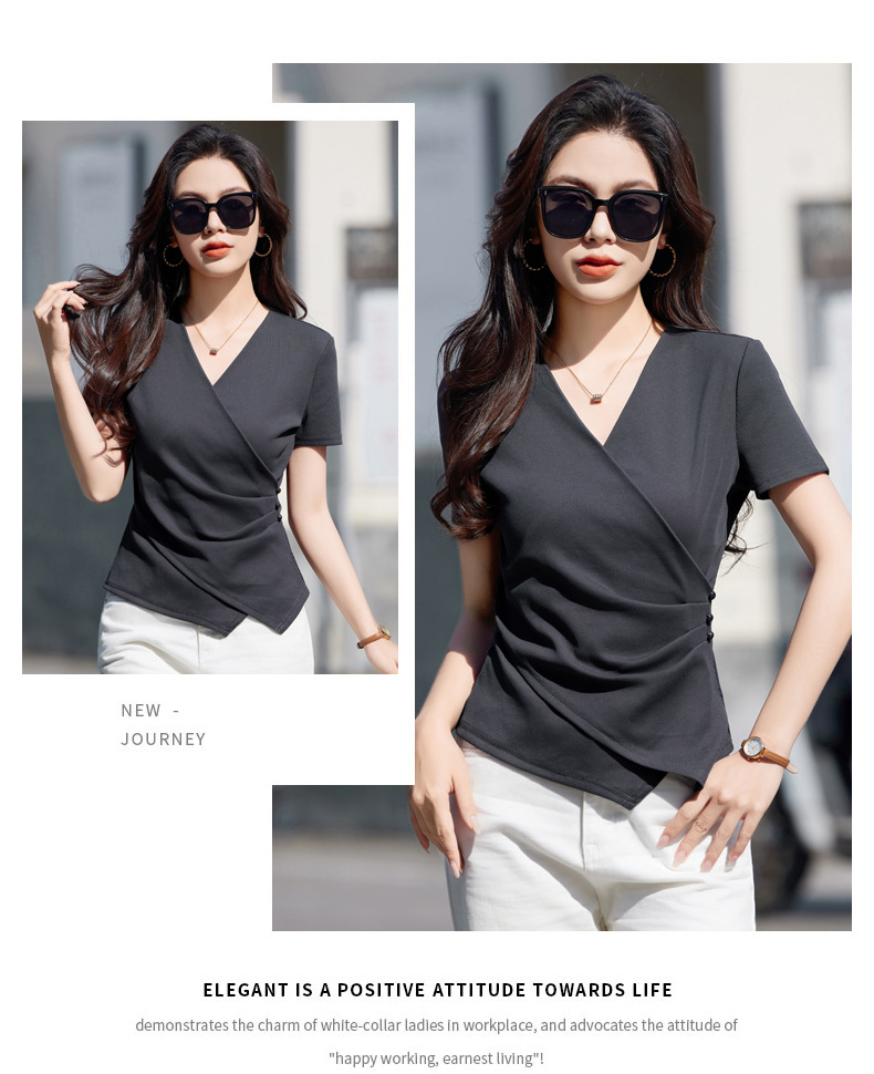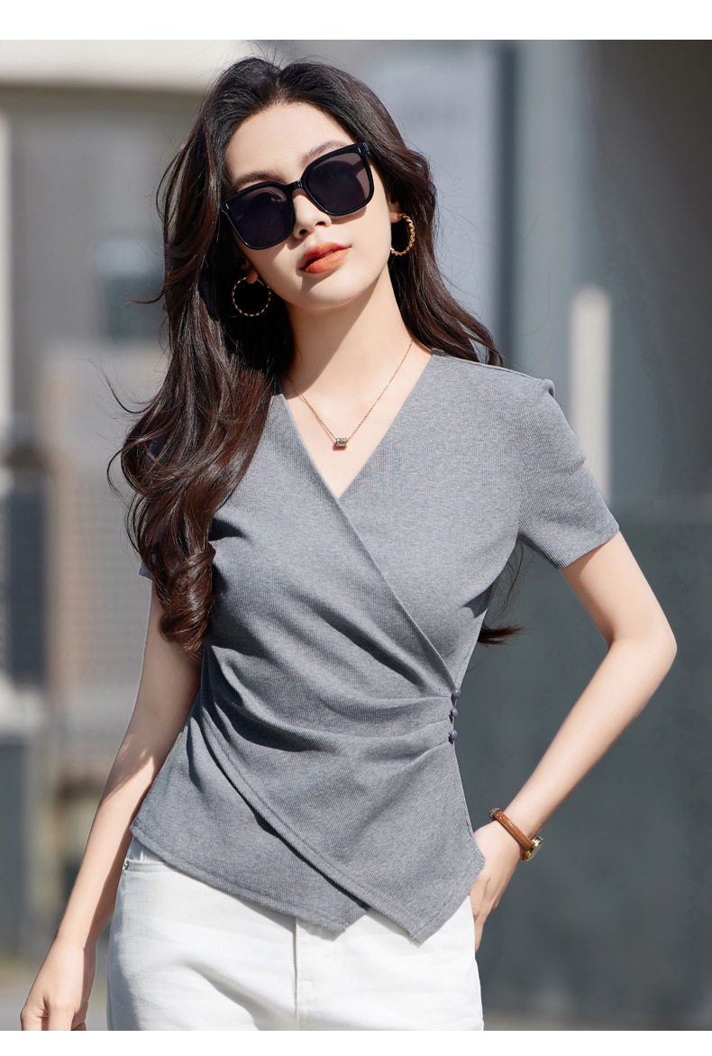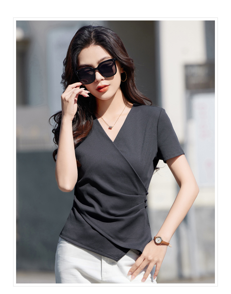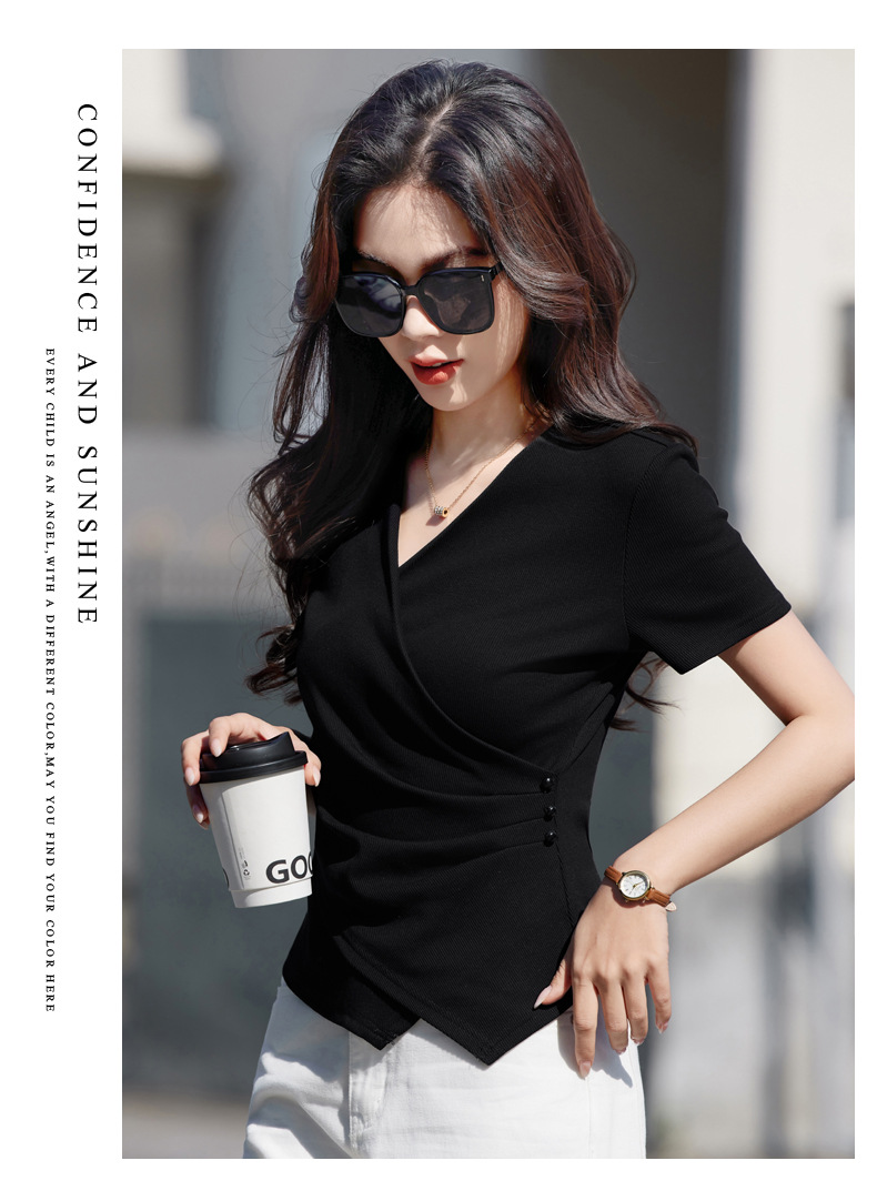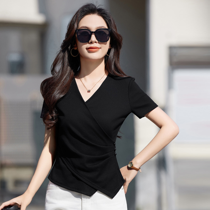 2025 년 여름 새로운 여성의 V-넥 반팔 티셔츠 슬림 핏 내부 배 덮는베이스 레이어 셔츠 웨스턴 스타일 작은 셔츠 탑