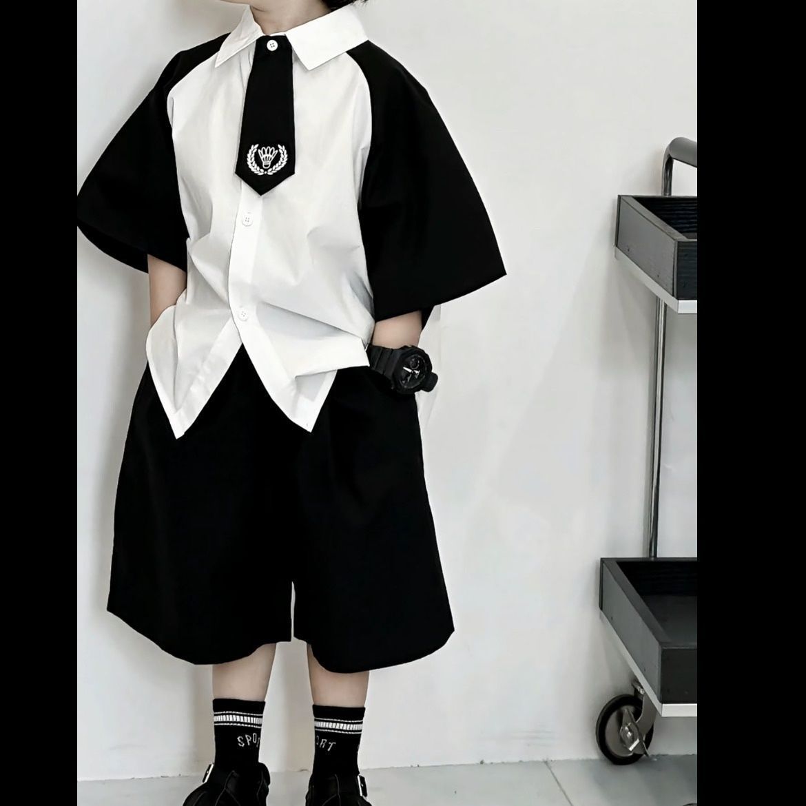 • 흑백 컬러블럭 반팔+블랙반바지 65a416