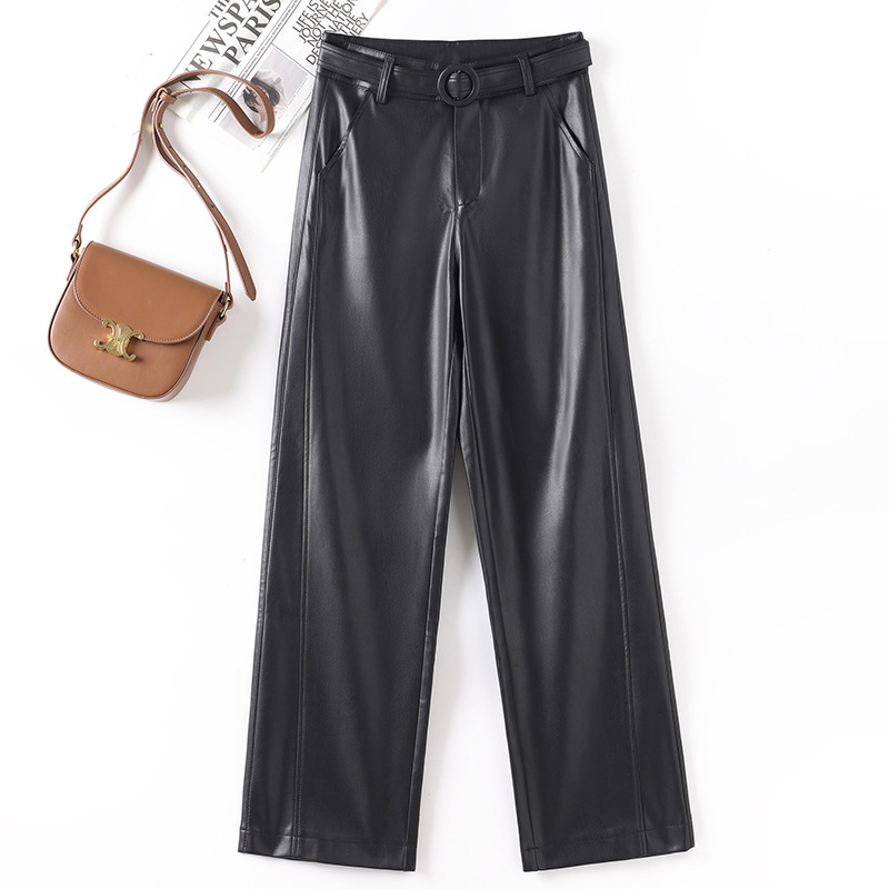 2025 봄 새 가죽 바지 여성 한국 스타일 플러스 사이즈 느슨한 여성 가죽 바지 캐주얼 올 매치 벨트 스트레이트 다리 바지 1905