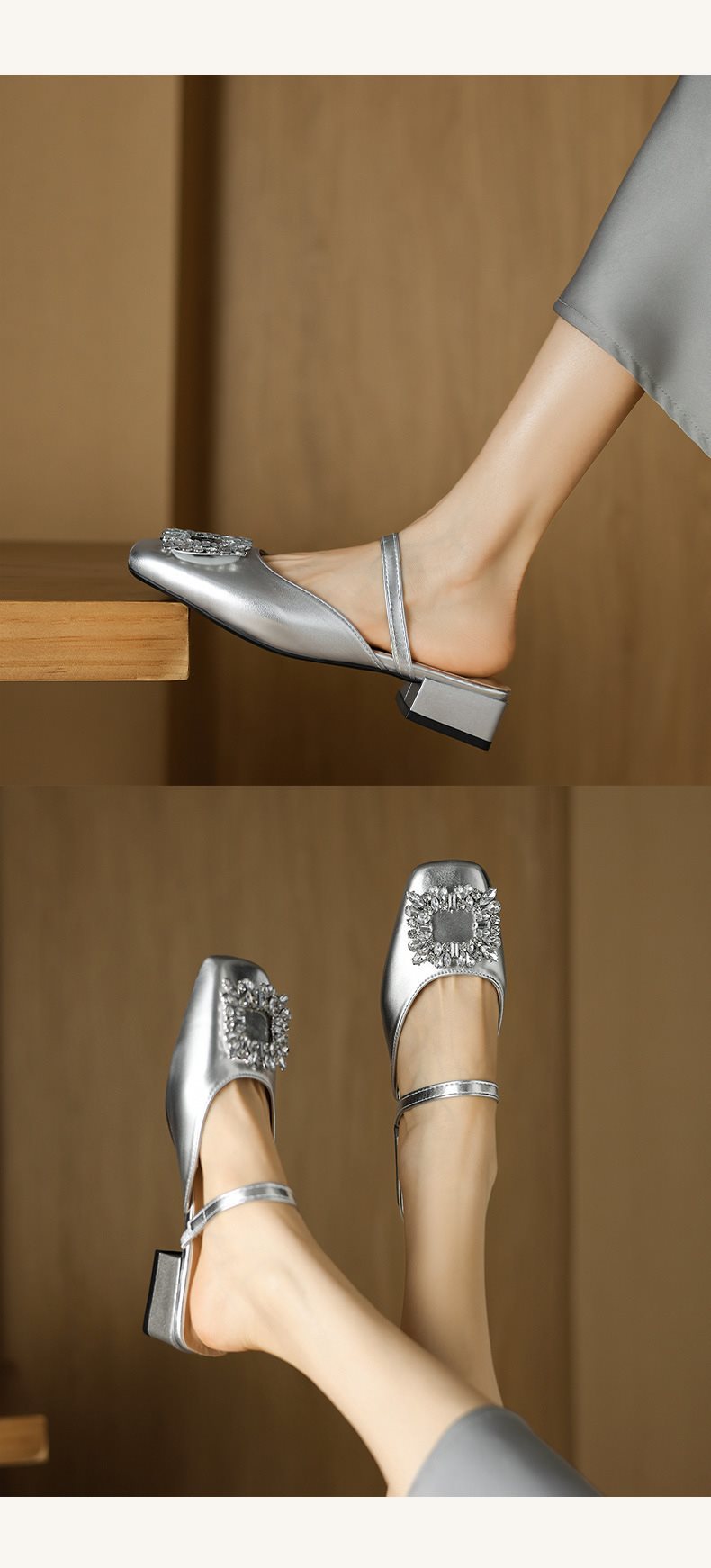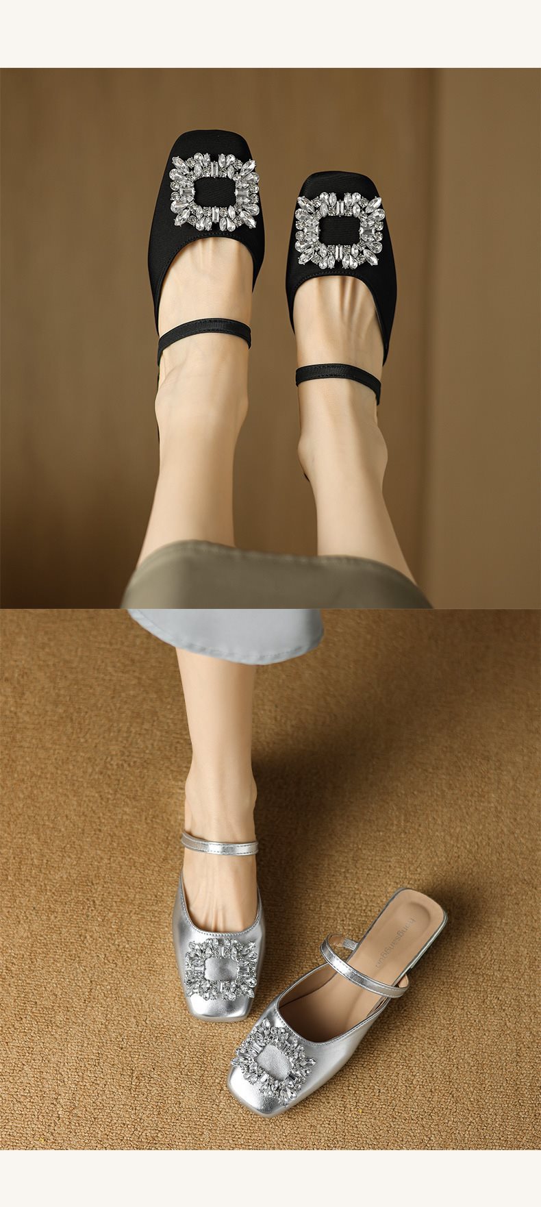 Chunky Heel 봄과 여름 광장 버클 스퀘어 헤드 새로운 프랑스 스타일 라인 스톤 2025 Baotou 하프 슬리퍼 여성 외부 착용 Mary Jane Sandals