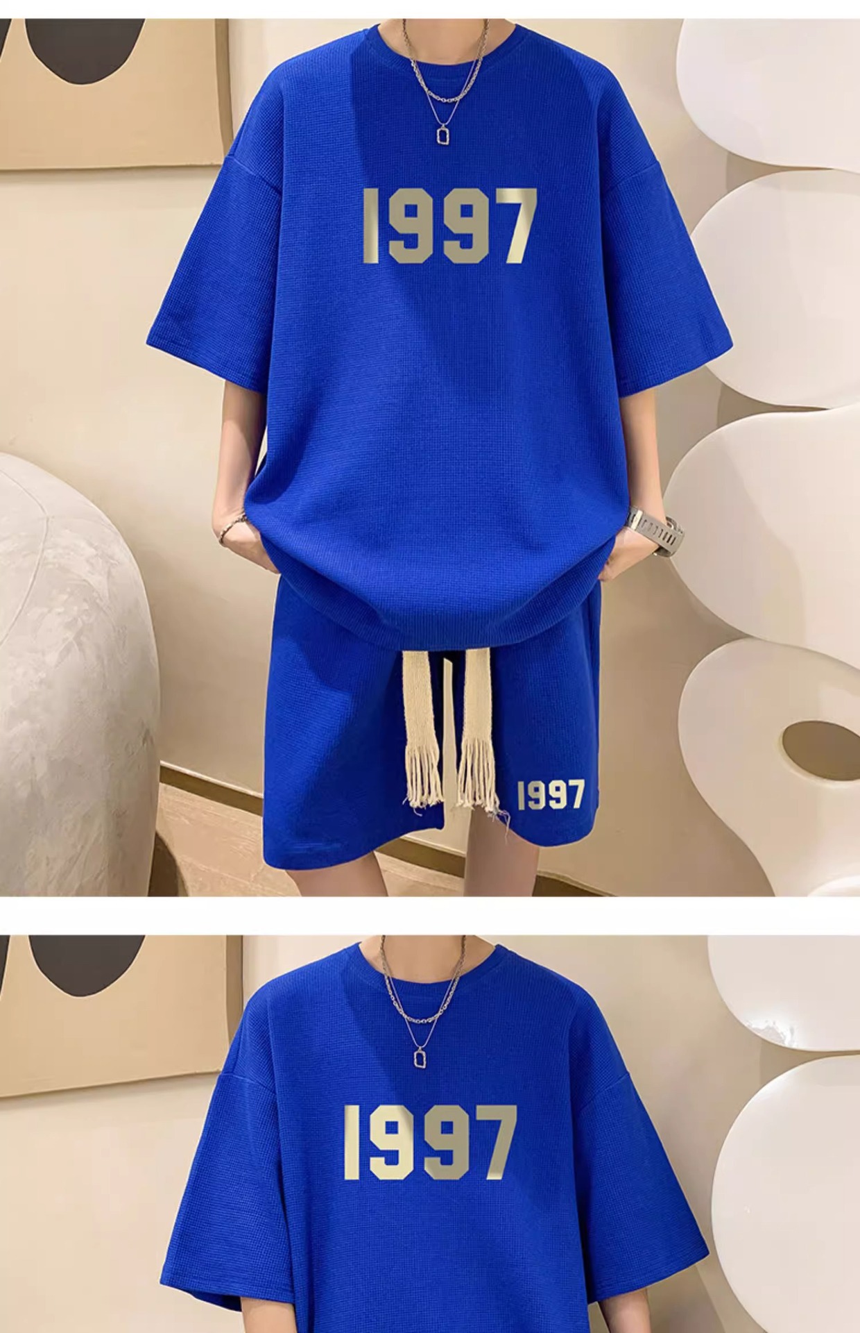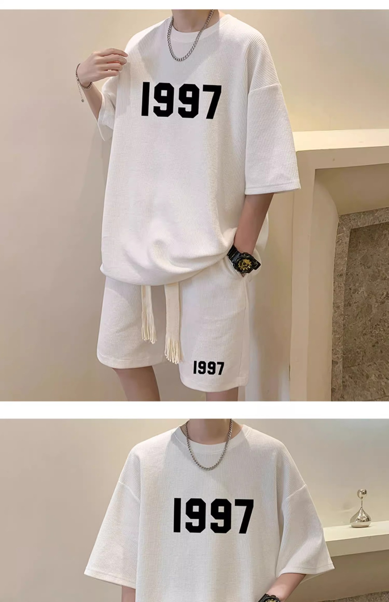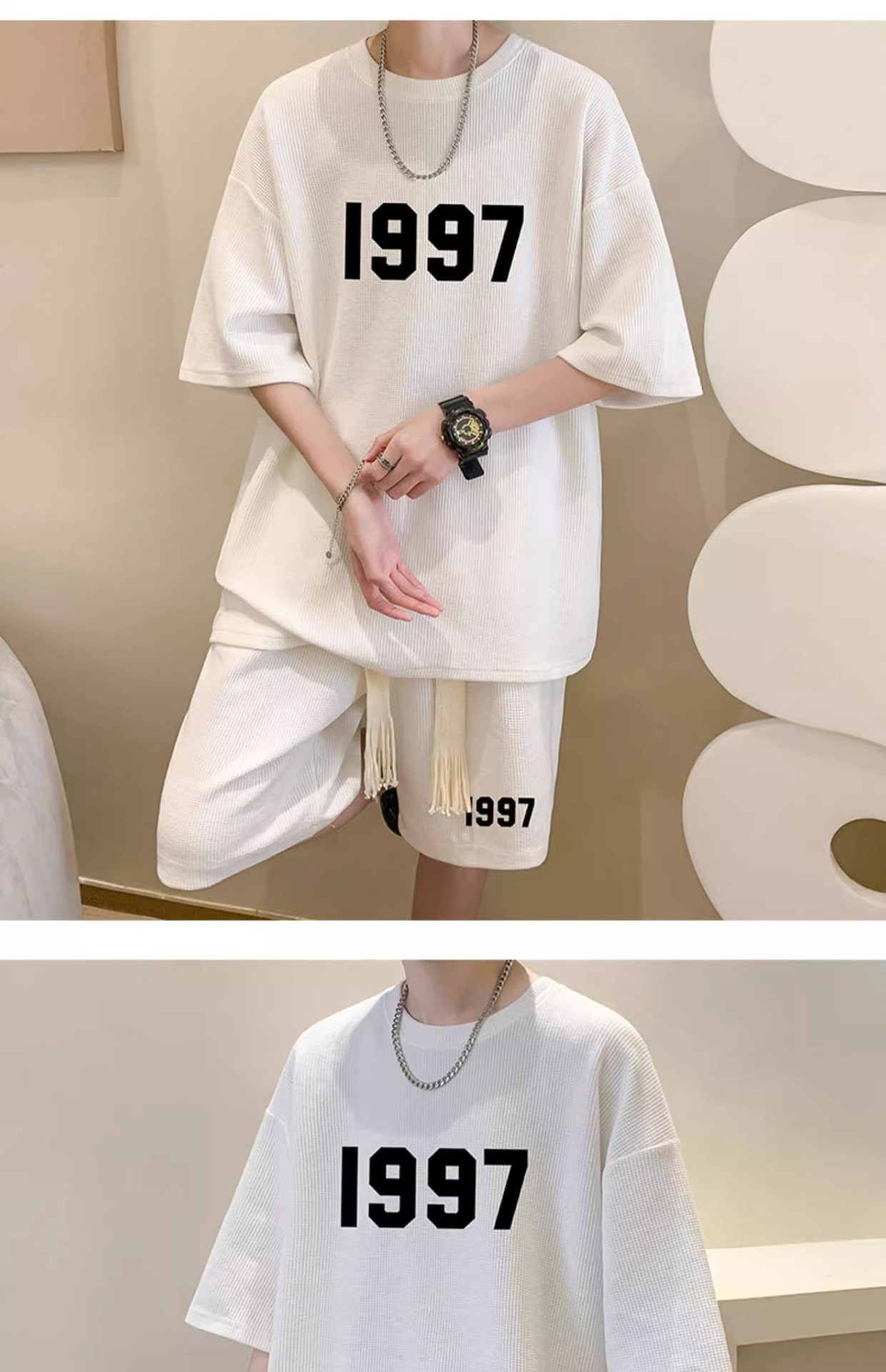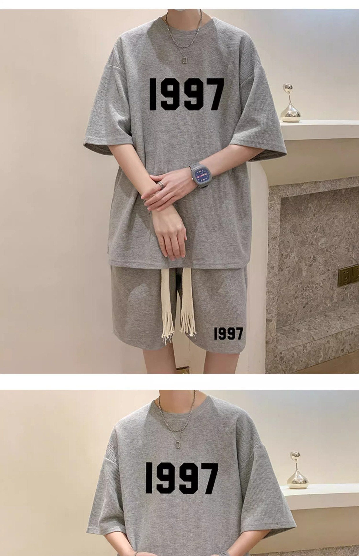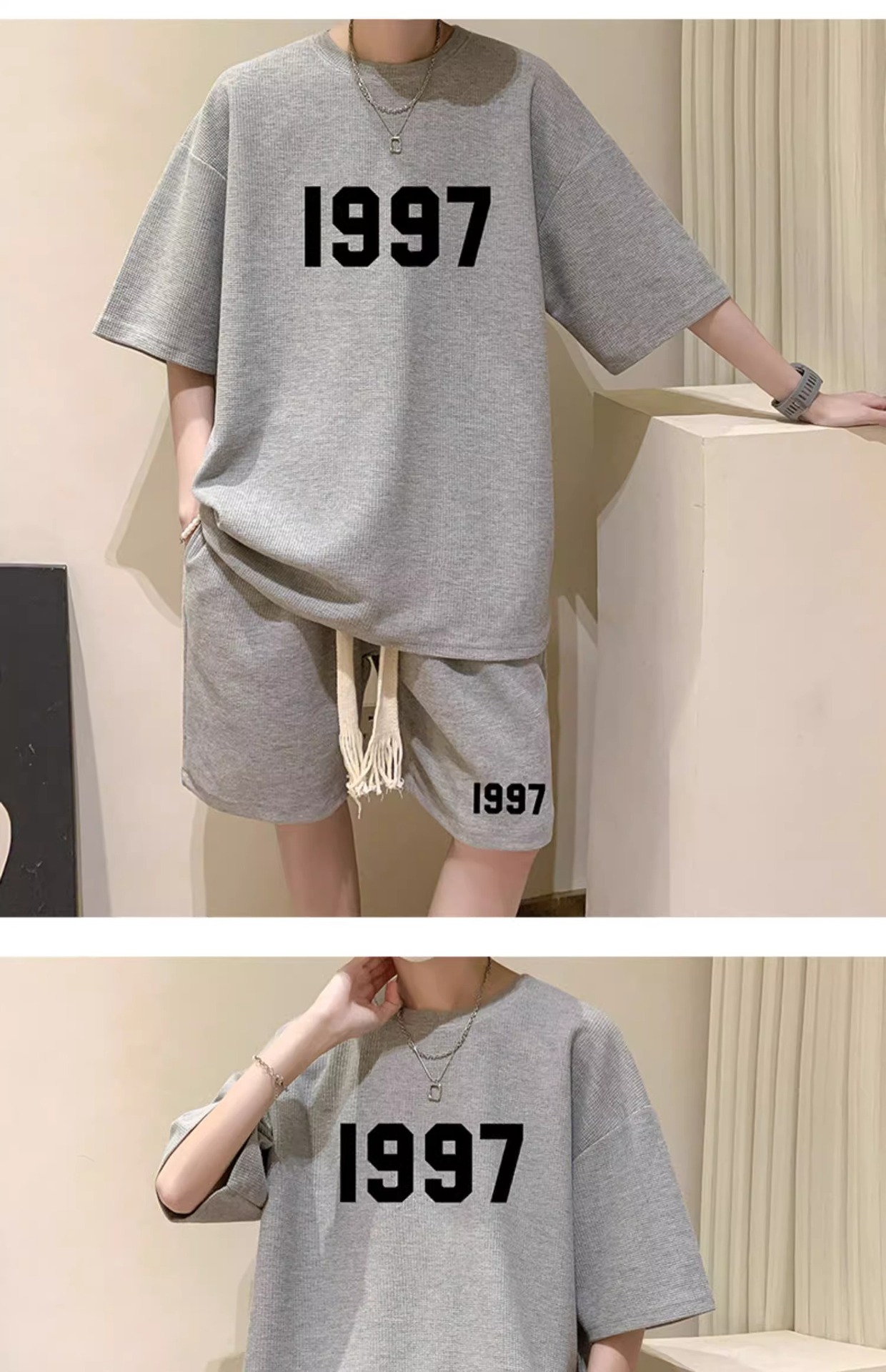 와플 반팔 티셔츠 남자 여름 스포츠 세트 느슨한 캐주얼 반바지 홍콩 스타일 Ins 트렌디 투피스 세트