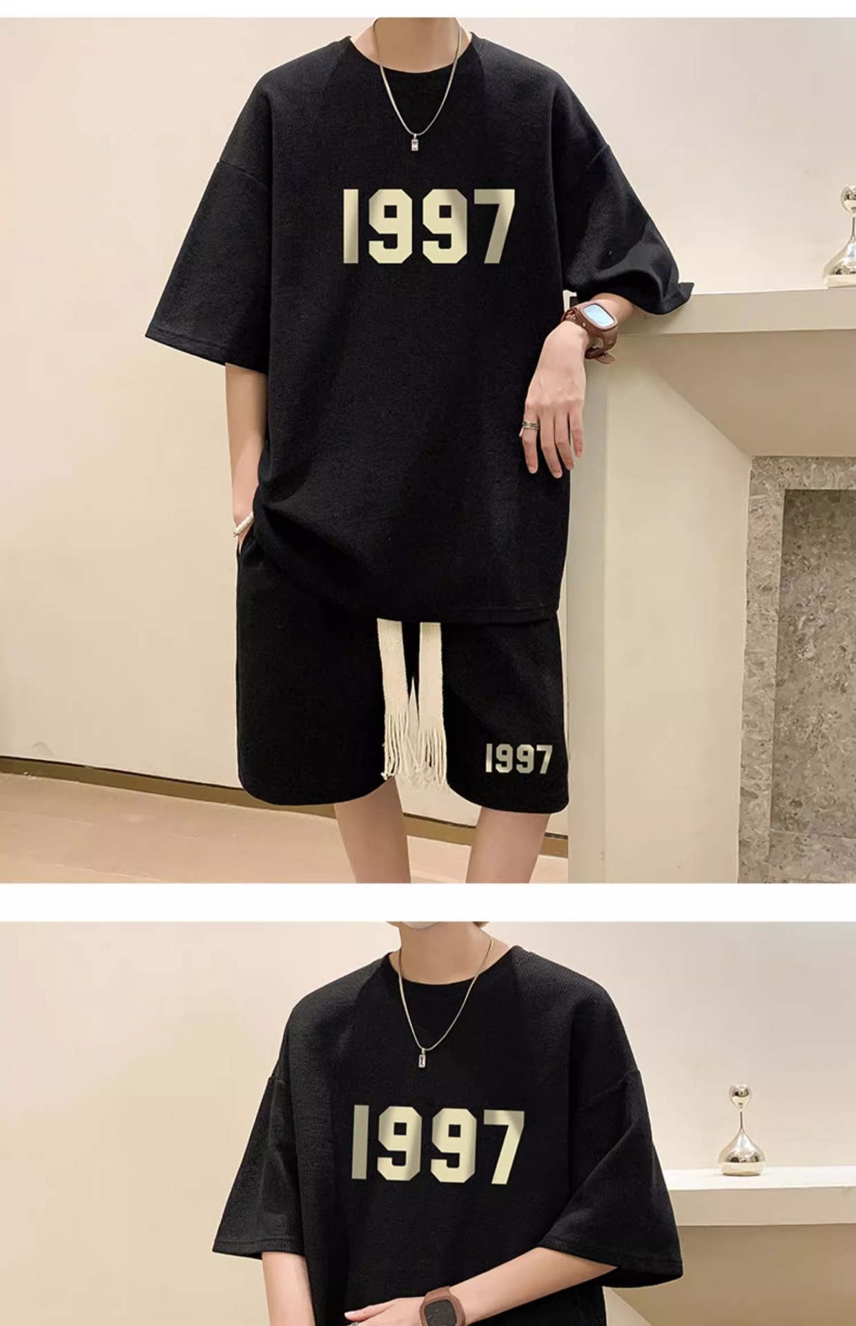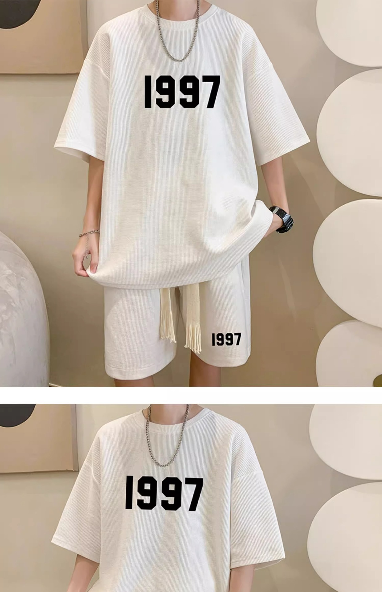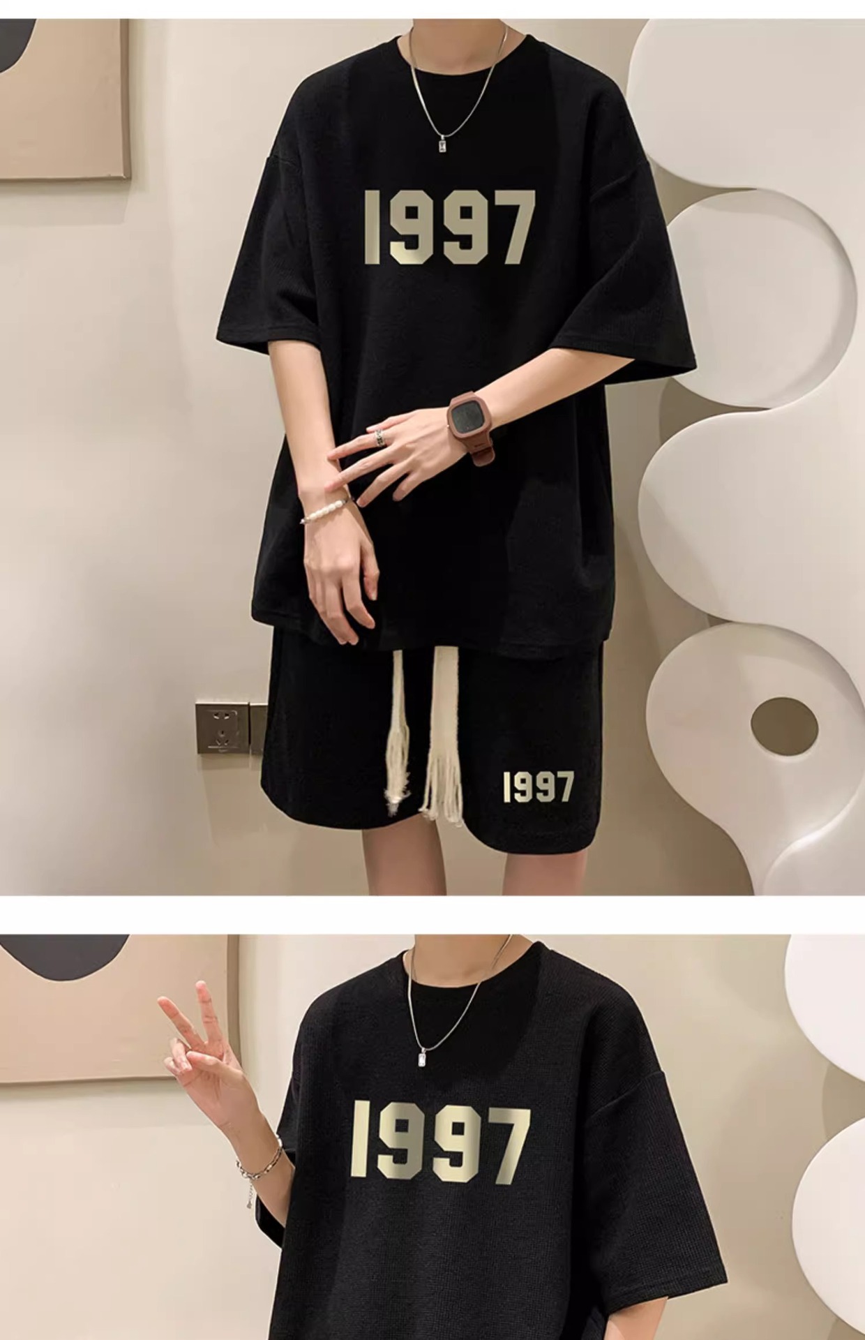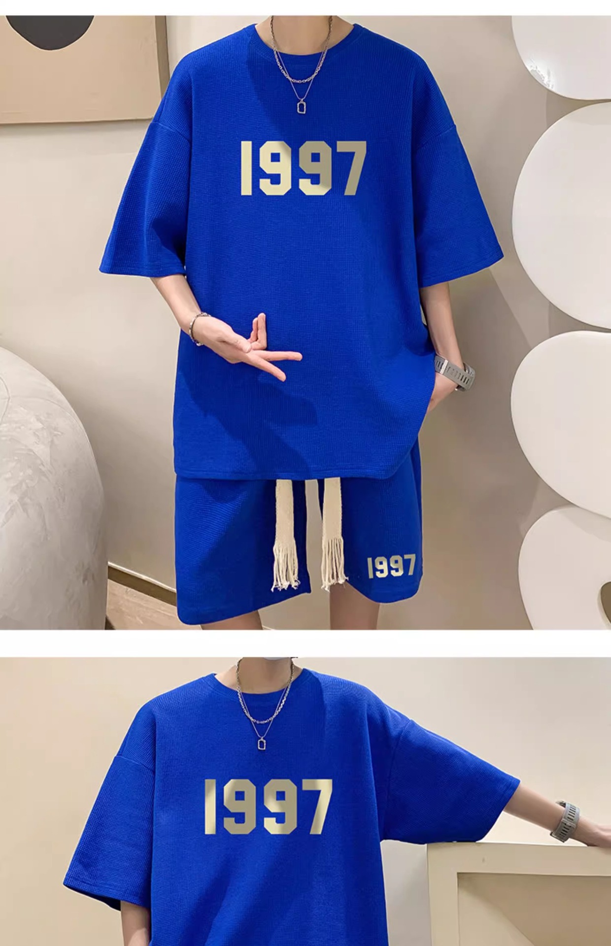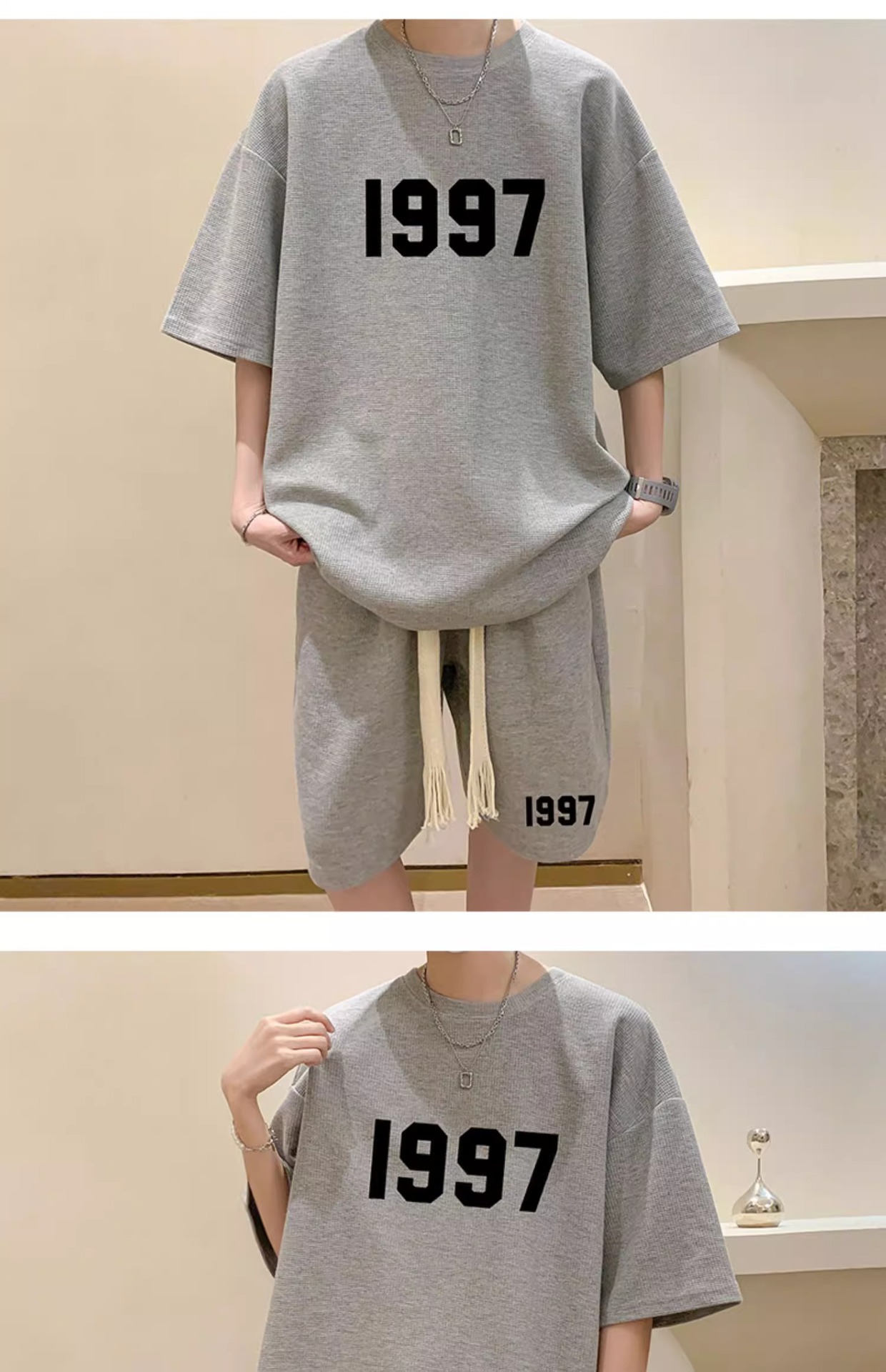 와플 반팔 티셔츠 남자 여름 스포츠 세트 느슨한 캐주얼 반바지 홍콩 스타일 Ins 트렌디 투피스 세트
