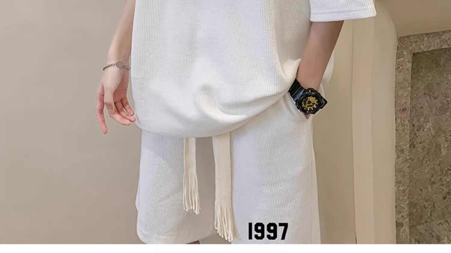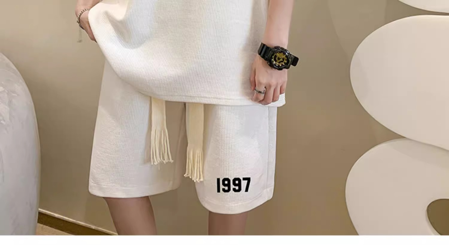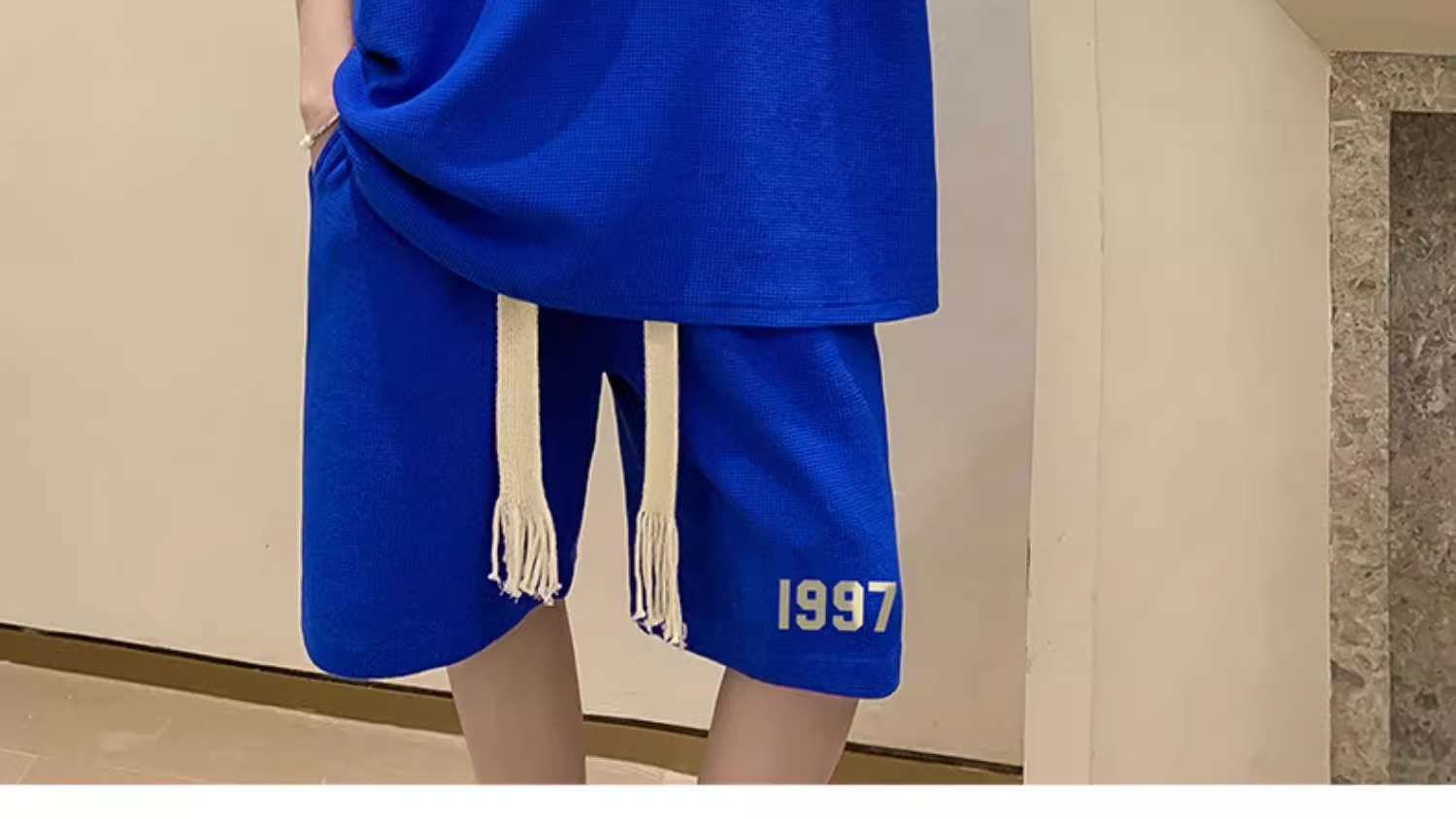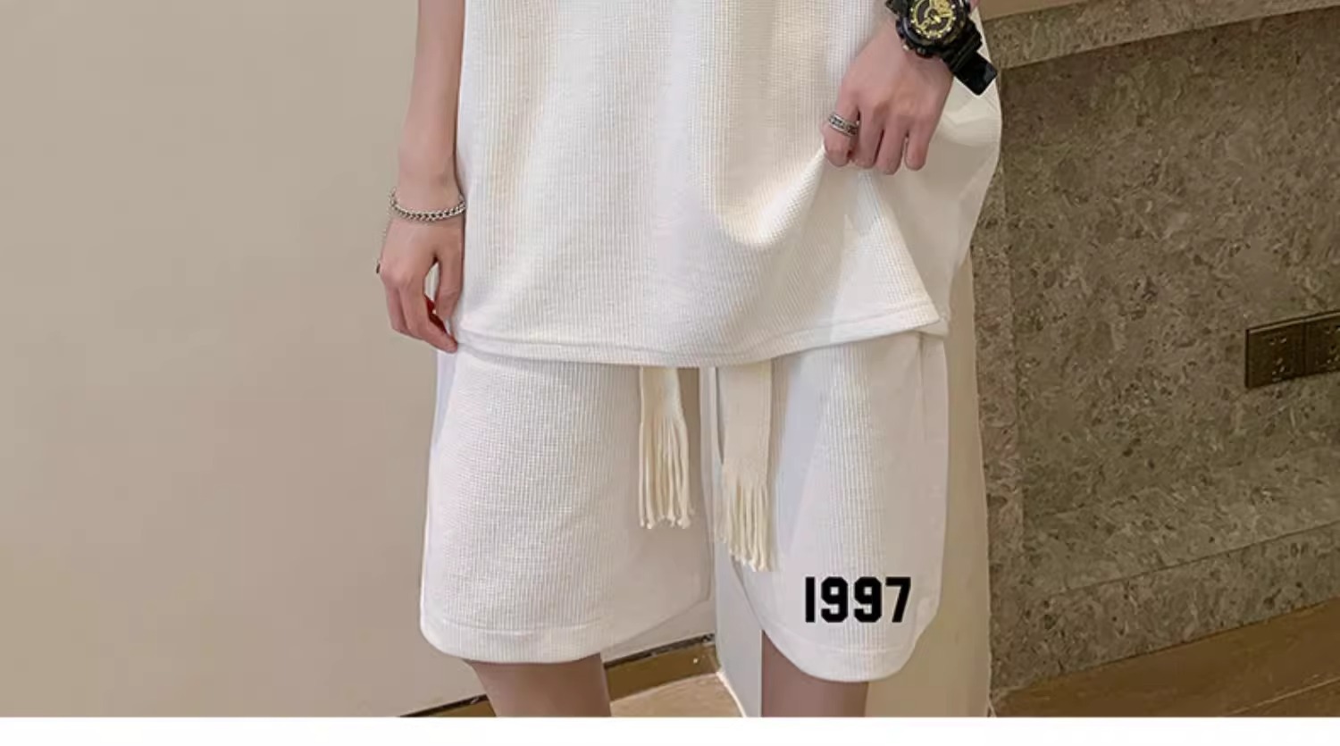 와플 반팔 티셔츠 남자 여름 스포츠 세트 느슨한 캐주얼 반바지 홍콩 스타일 Ins 트렌디 투피스 세트스토어 가기