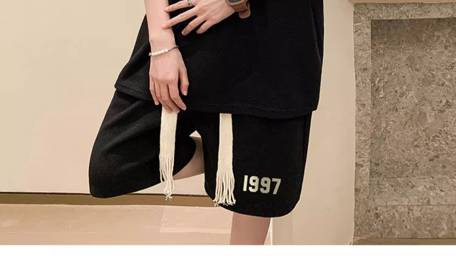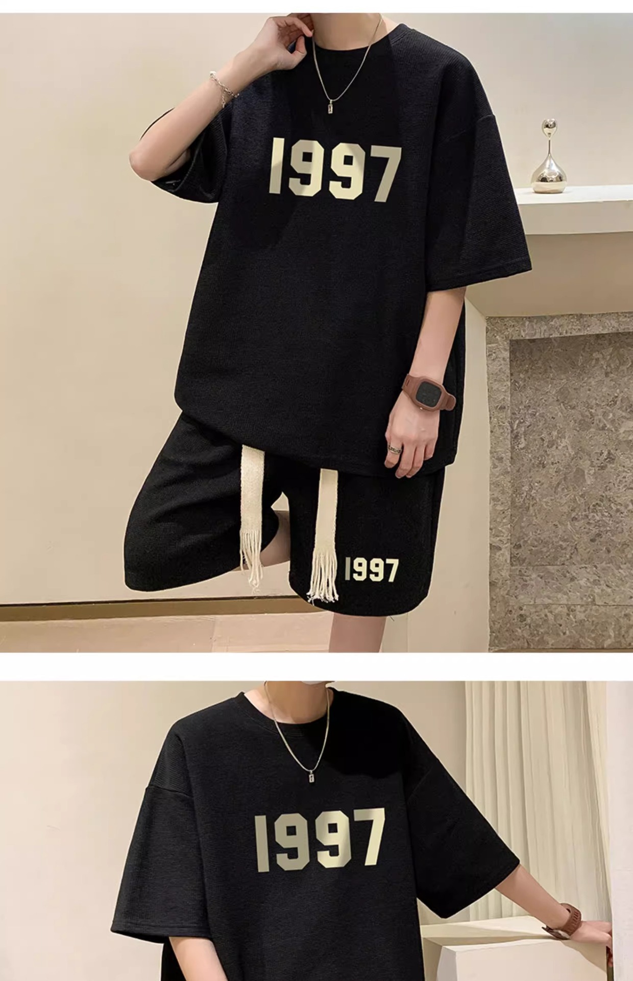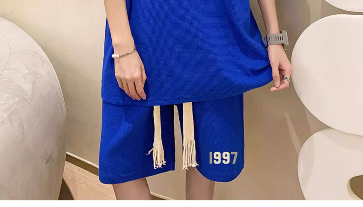와플 반팔 티셔츠 남자 여름 스포츠 세트 느슨한 캐주얼 반바지 홍콩 스타일 Ins 트렌디 투피스 세트스토어 가기