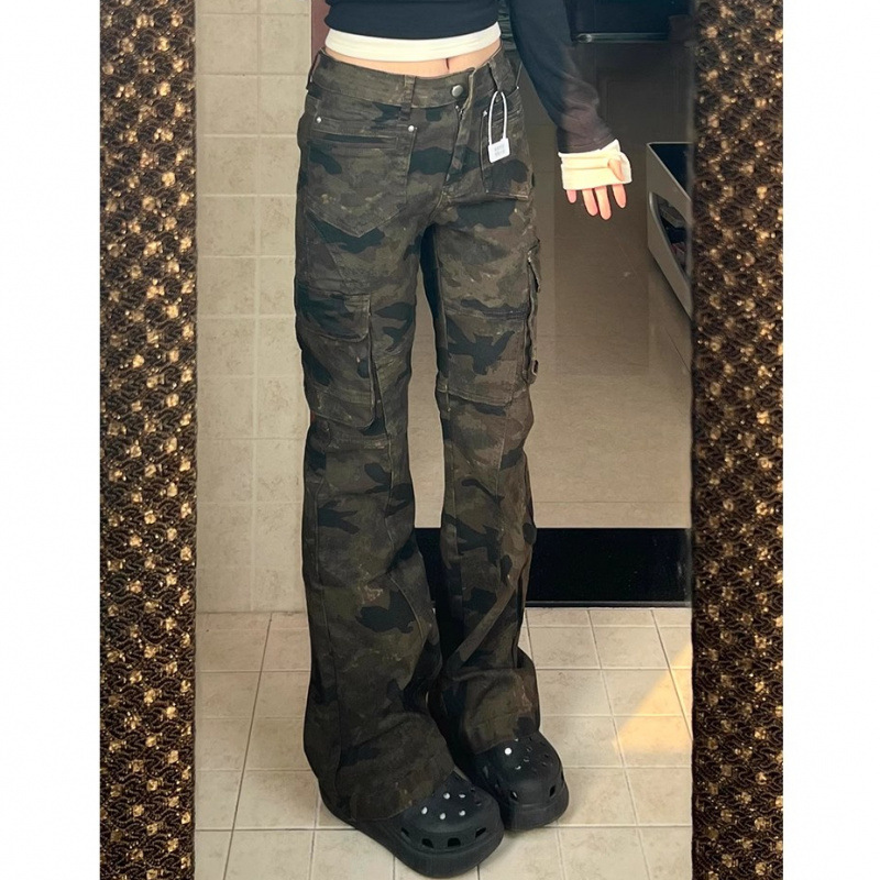 아메리칸 스타일 하이 스트리트 스타일 마이크로 위장 도구 청바지 여성의 2025 여름 새로운 슬리밍 스트레이트 하이 허리 와이드 다리 바지스토어 가기