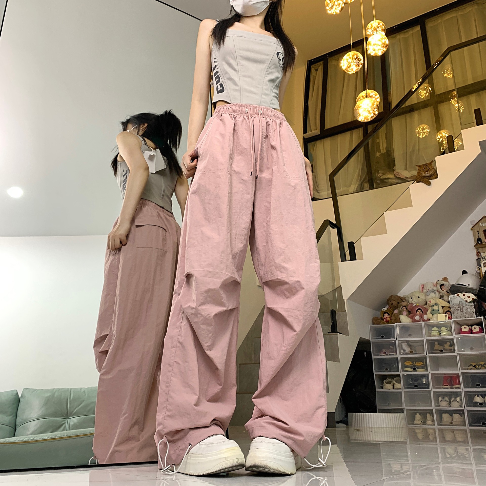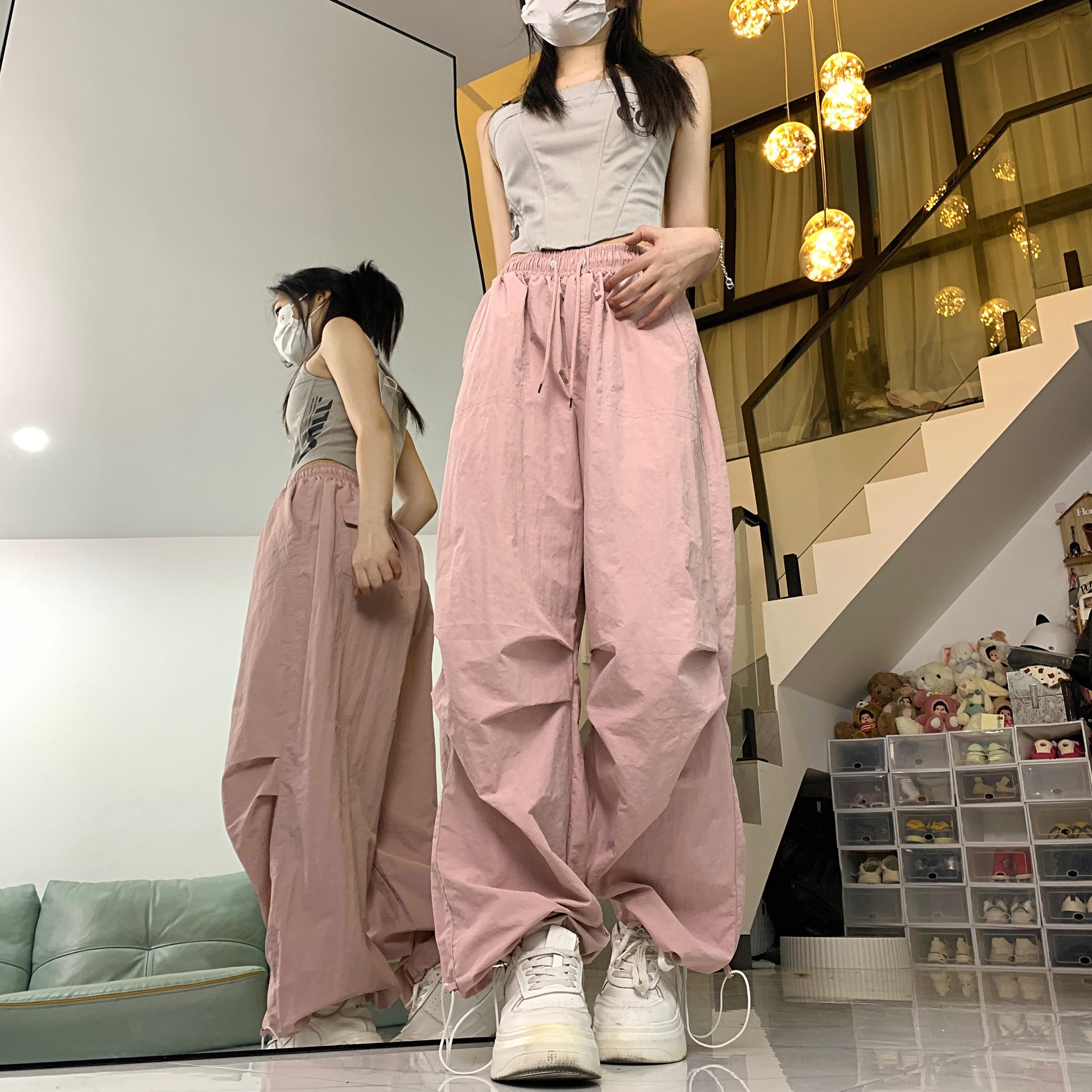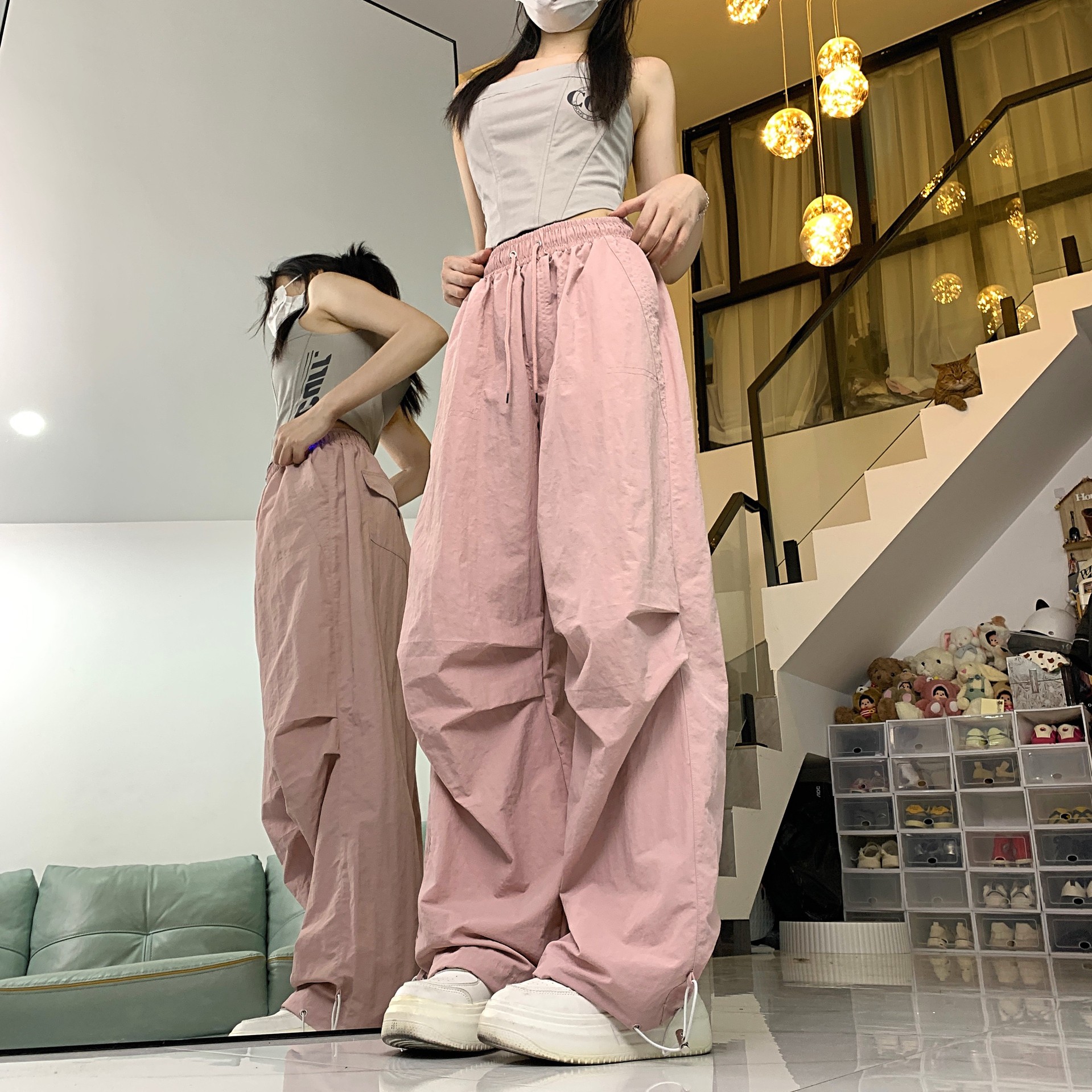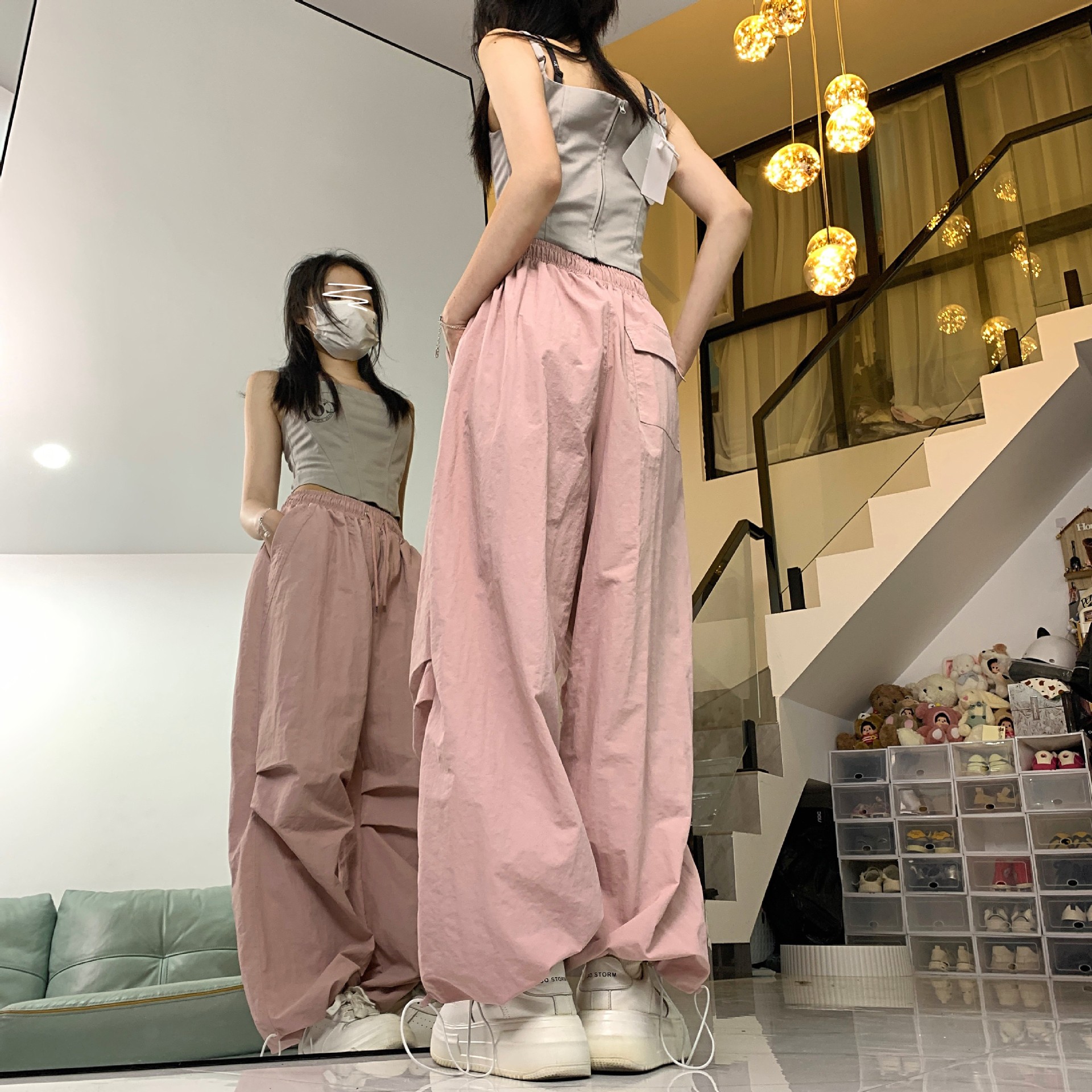 핑크 빠른 건조 크레인 바지 여성의 봄과 여름 얇은 높은 허리 슬리밍 넓은 다리 캐주얼 미국 낙하산 유행 바지