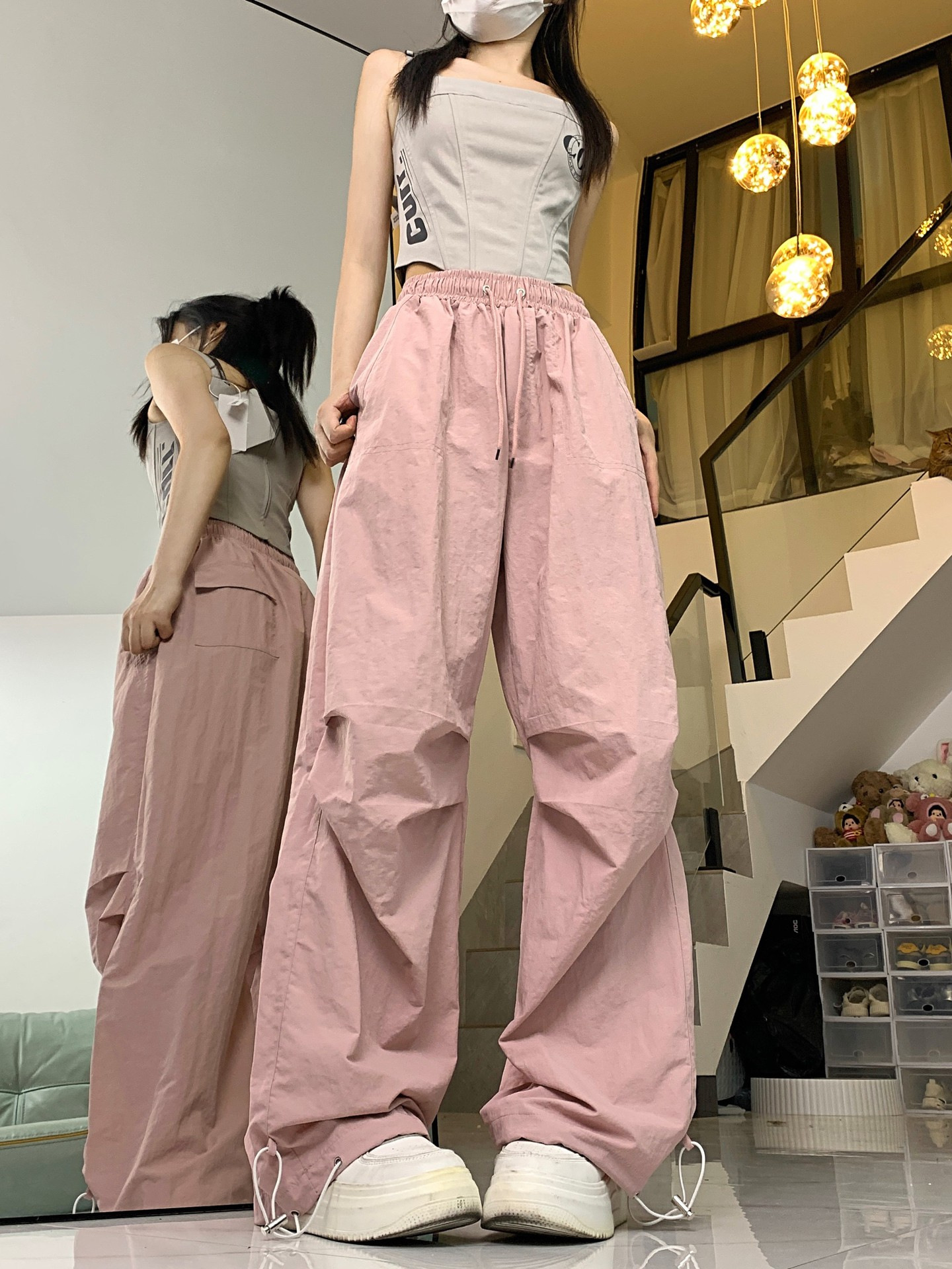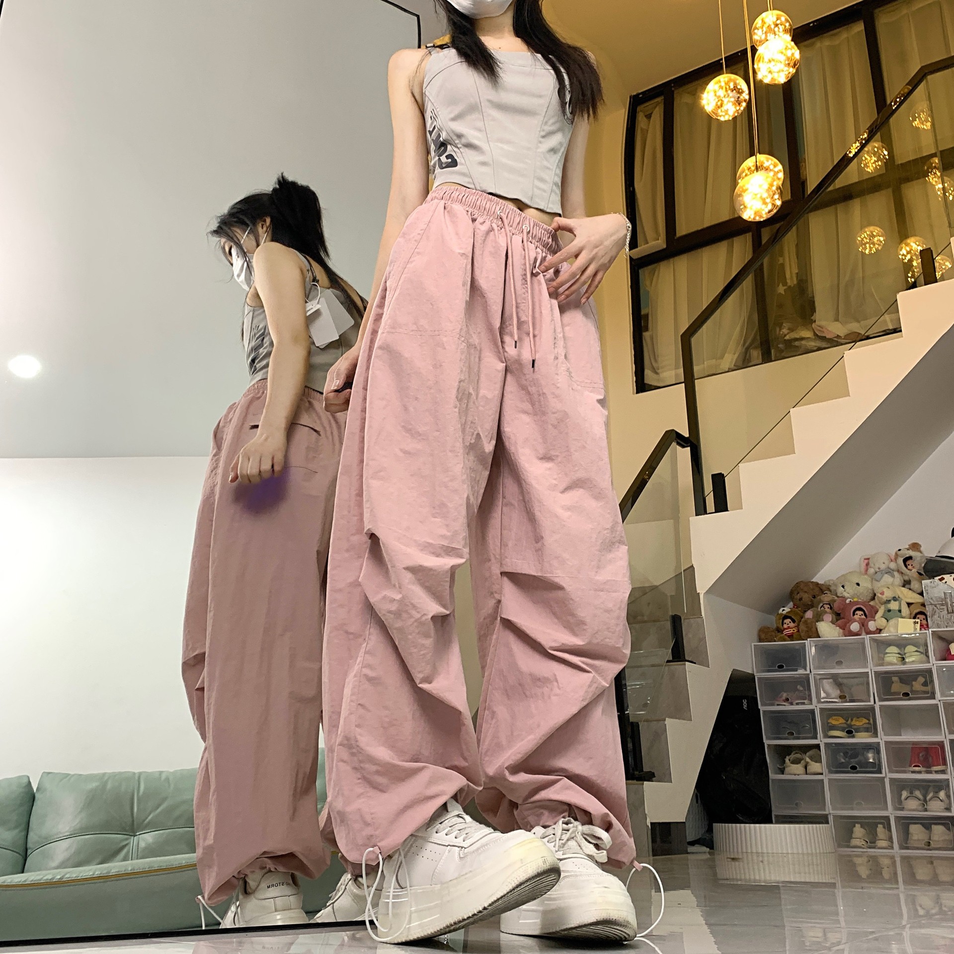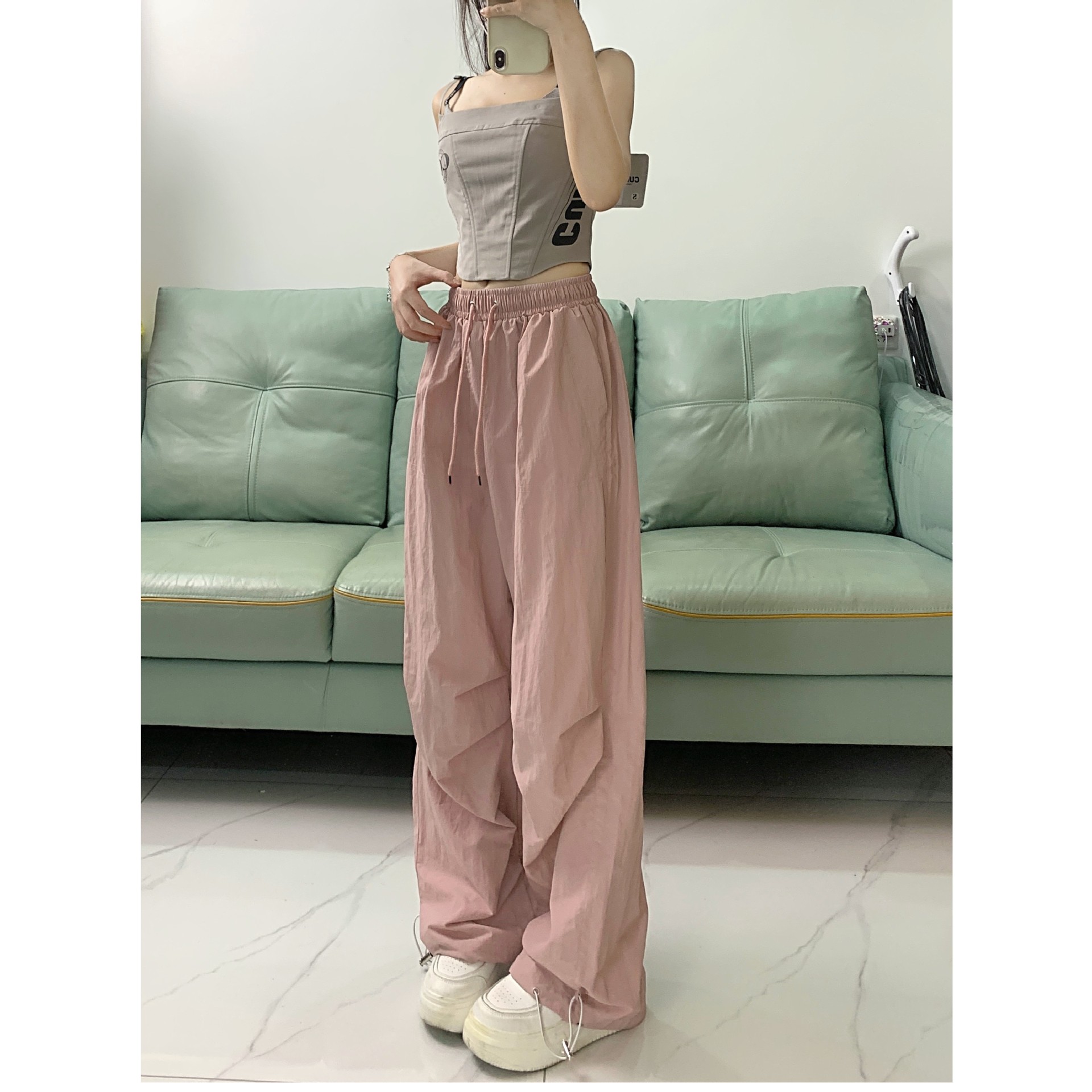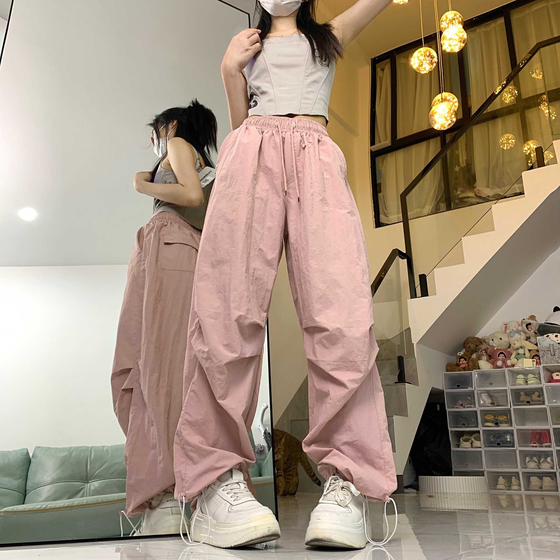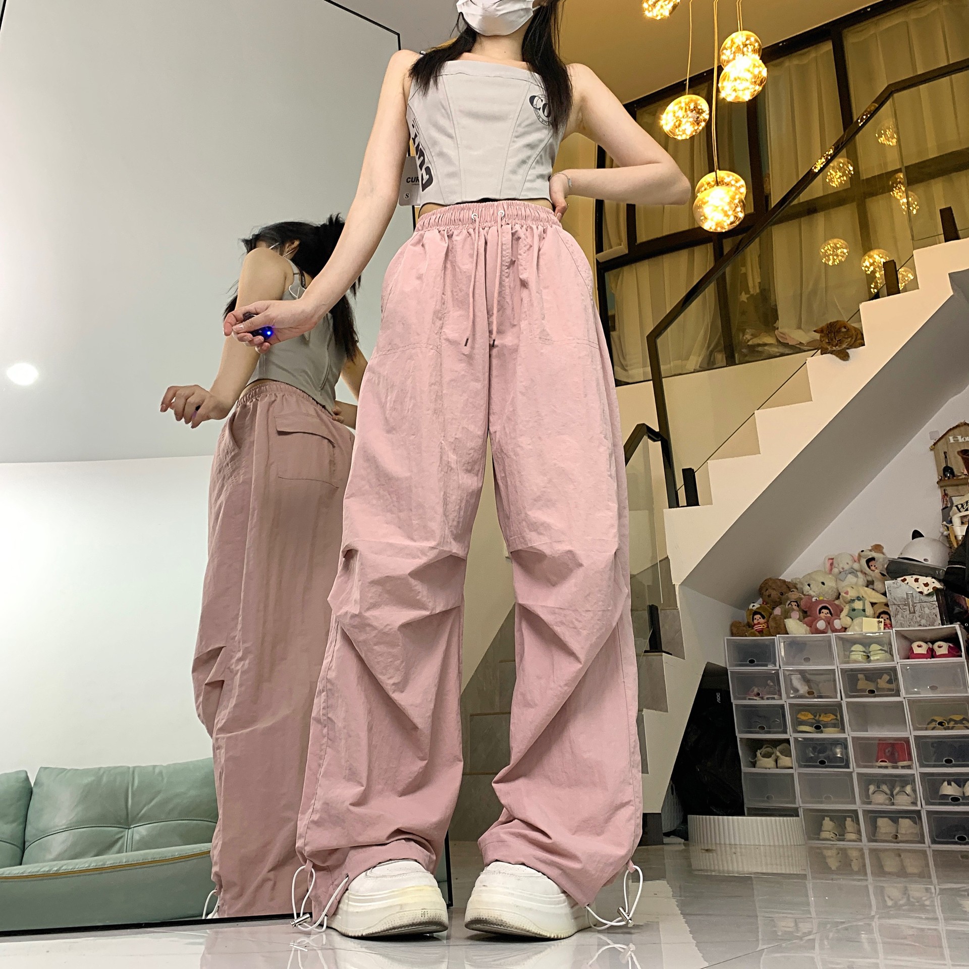 핑크 빠른 건조 크레인 바지 여성의 봄과 여름 얇은 높은 허리 슬리밍 넓은 다리 캐주얼 미국 낙하산 유행 바지