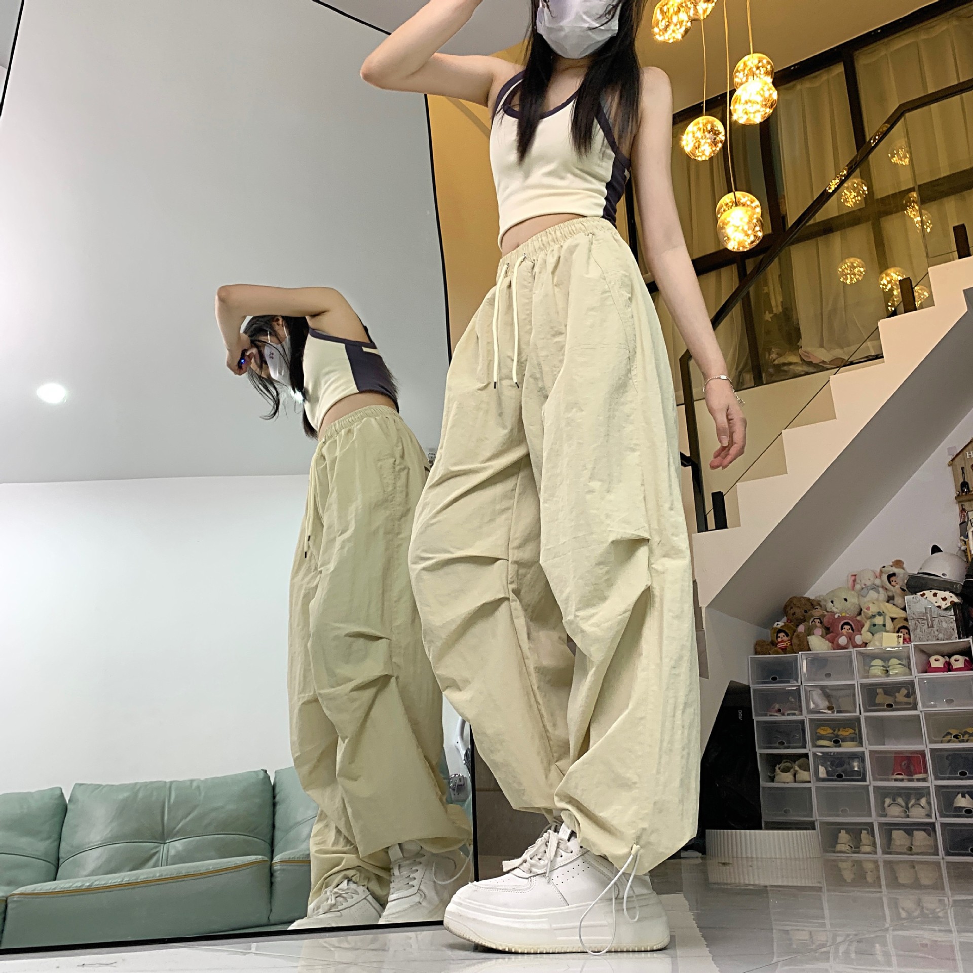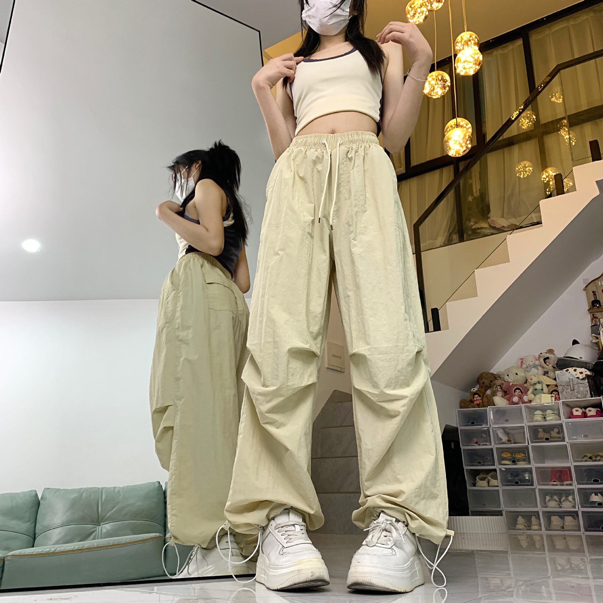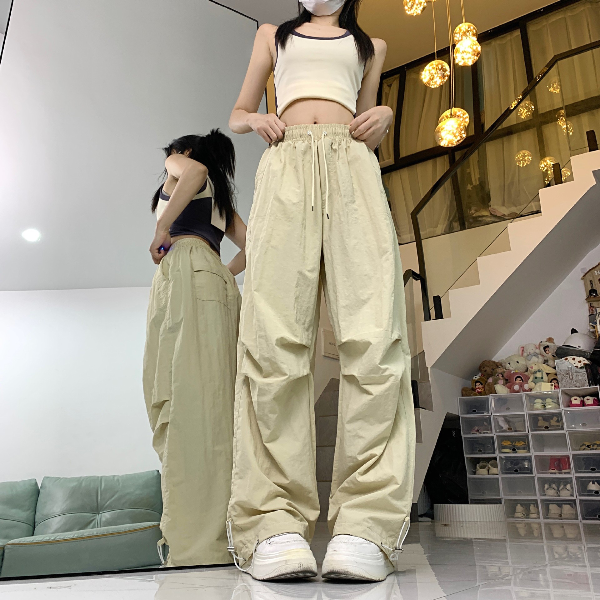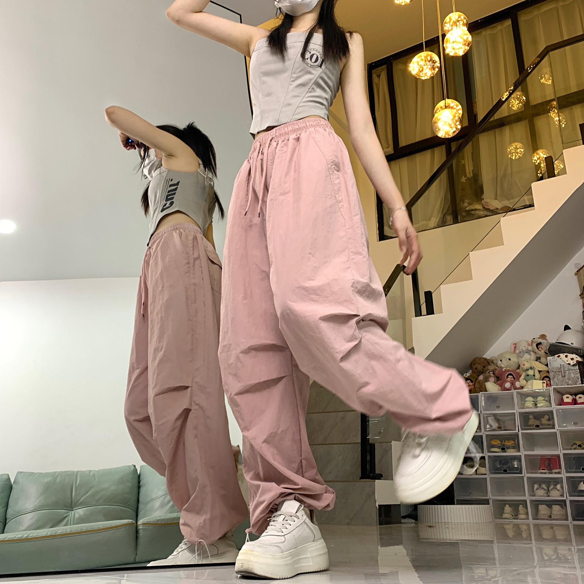 핑크 빠른 건조 크레인 바지 여성의 봄과 여름 얇은 높은 허리 슬리밍 넓은 다리 캐주얼 미국 낙하산 유행 바지