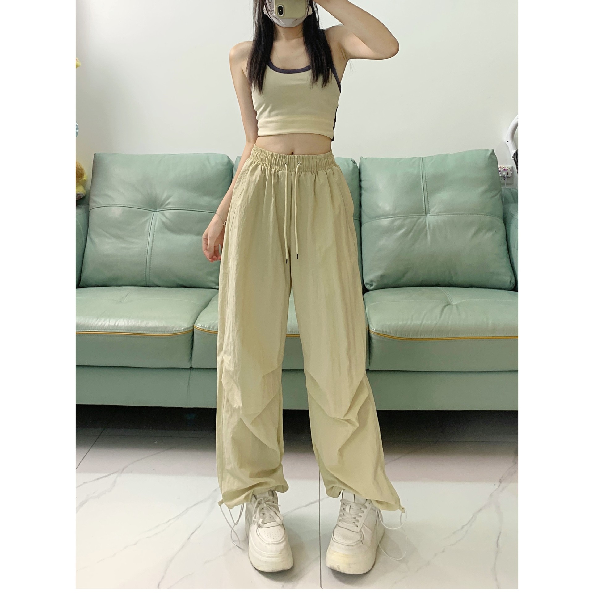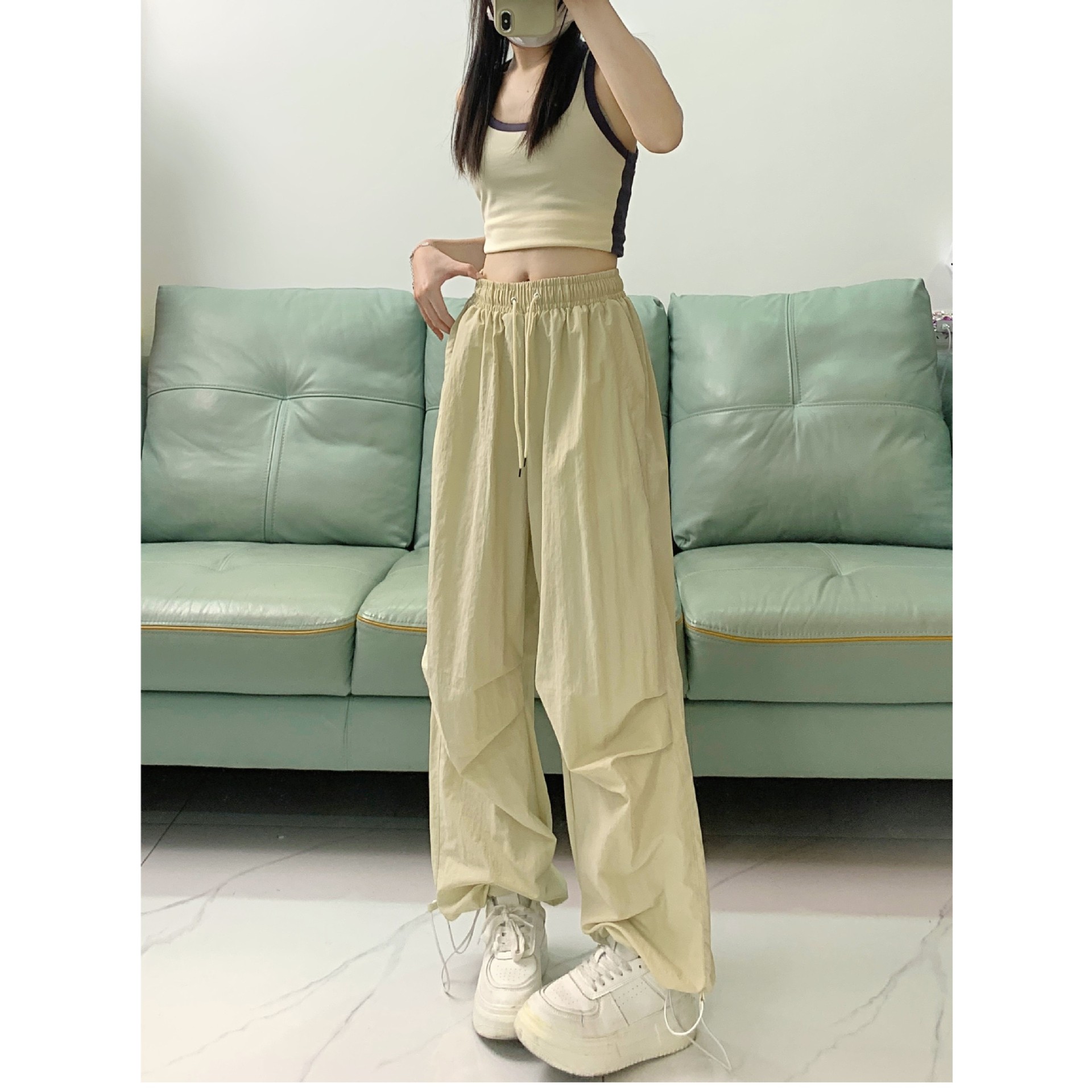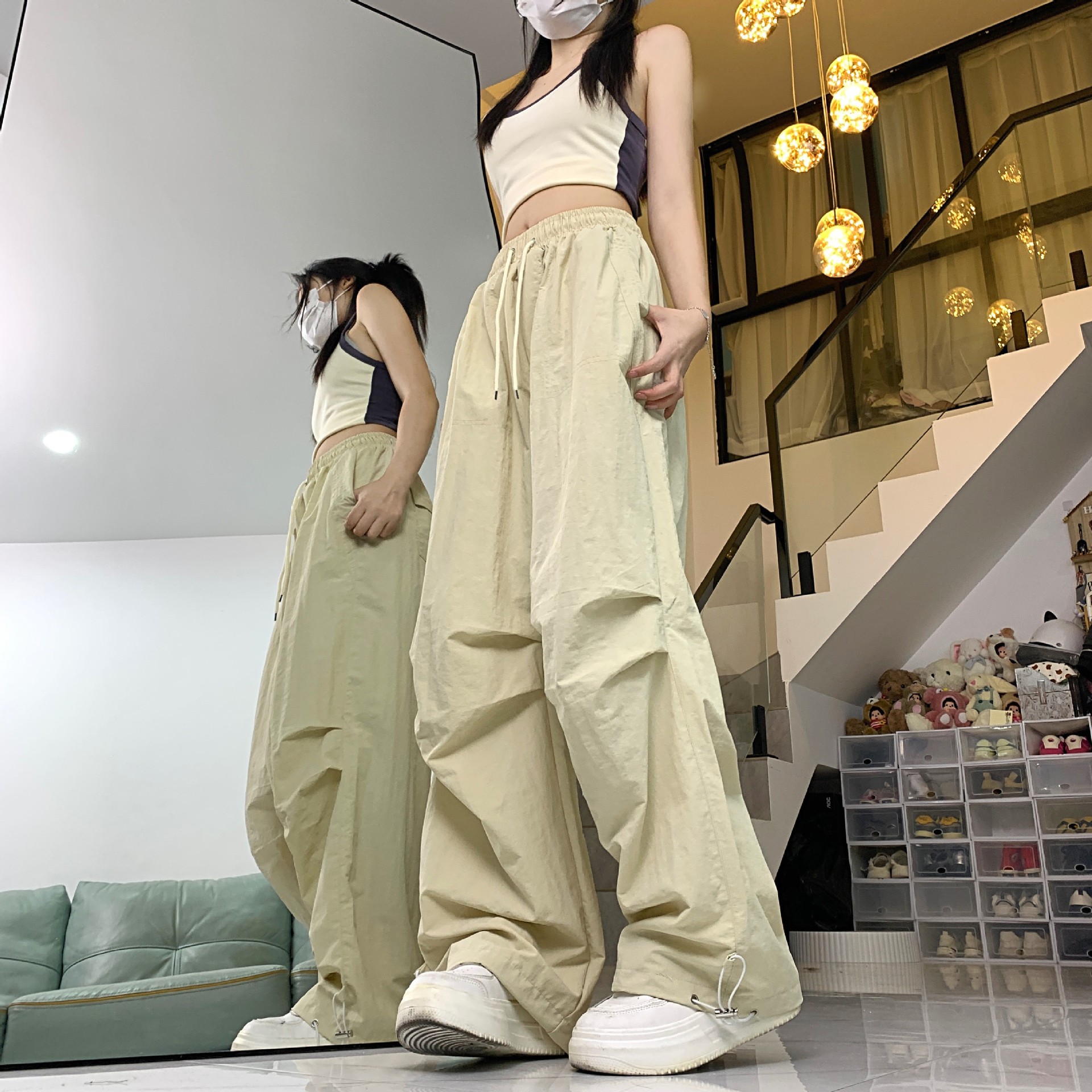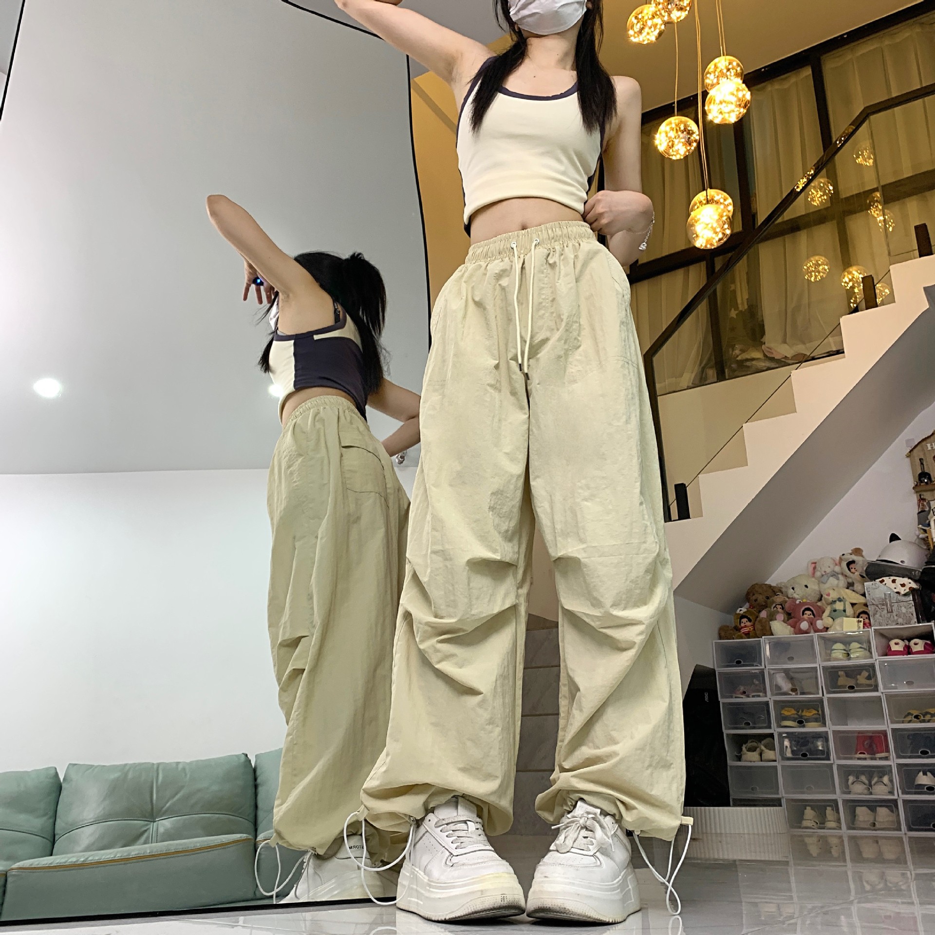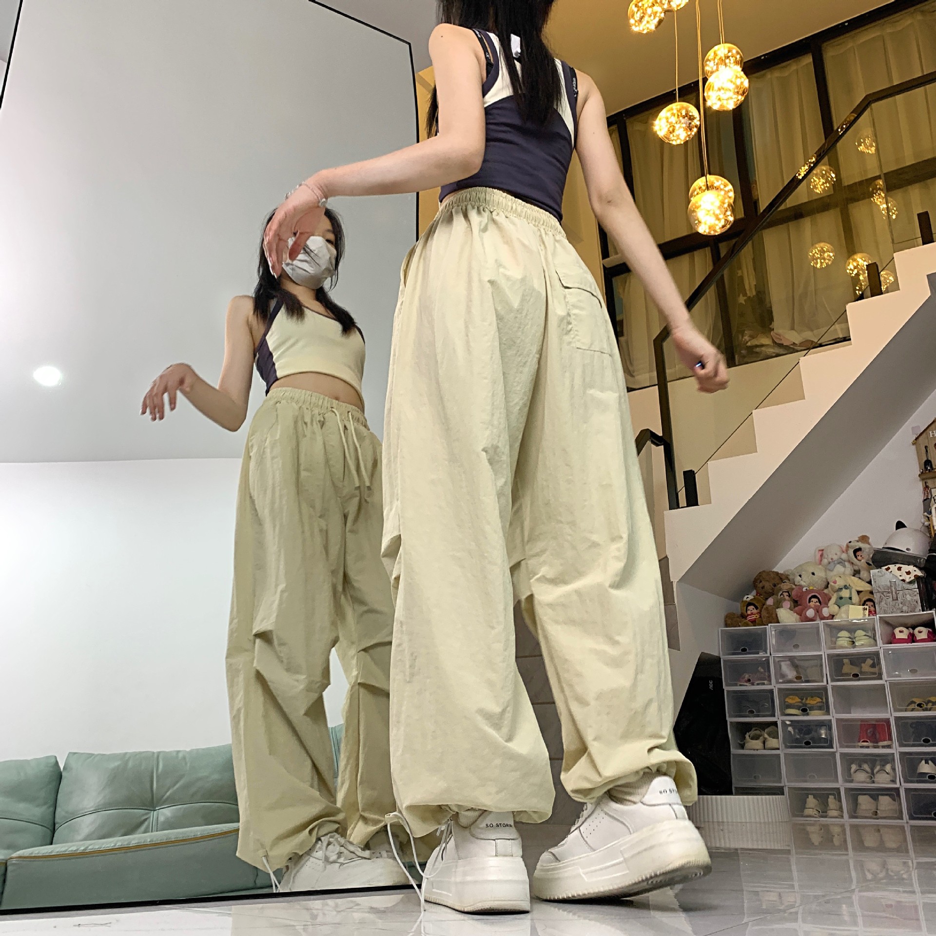 핑크 빠른 건조 크레인 바지 여성의 봄과 여름 얇은 높은 허리 슬리밍 넓은 다리 캐주얼 미국 낙하산 유행 바지