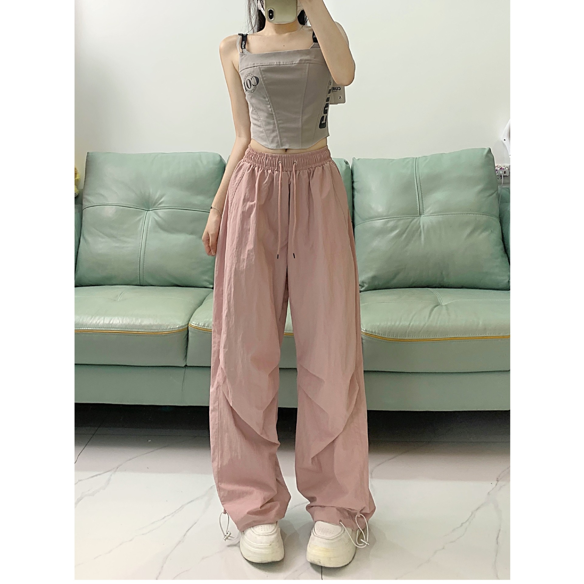 핑크 빠른 건조 크레인 바지 여성의 봄과 여름 얇은 높은 허리 슬리밍 넓은 다리 캐주얼 미국 낙하산 유행 바지스토어 가기