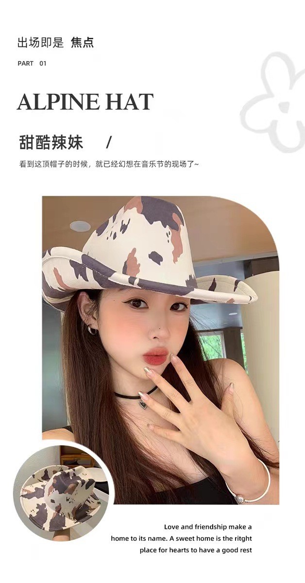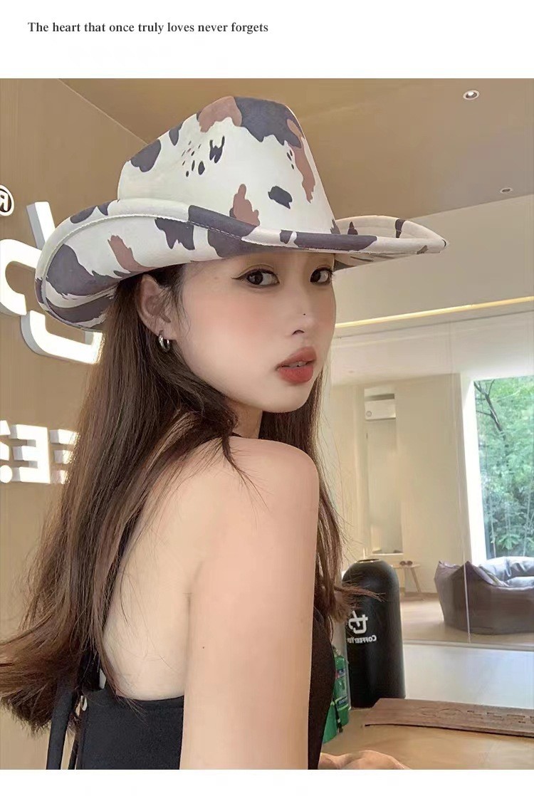 뜨거운 소녀 스타일 새로운 서양 카우보이 모자 유제품 암소 패턴 태양 보호 태양 모자 복고풍 모자 등산 기사 모자스토어 가기