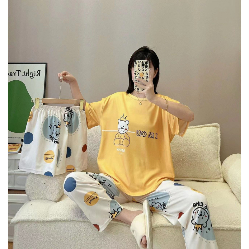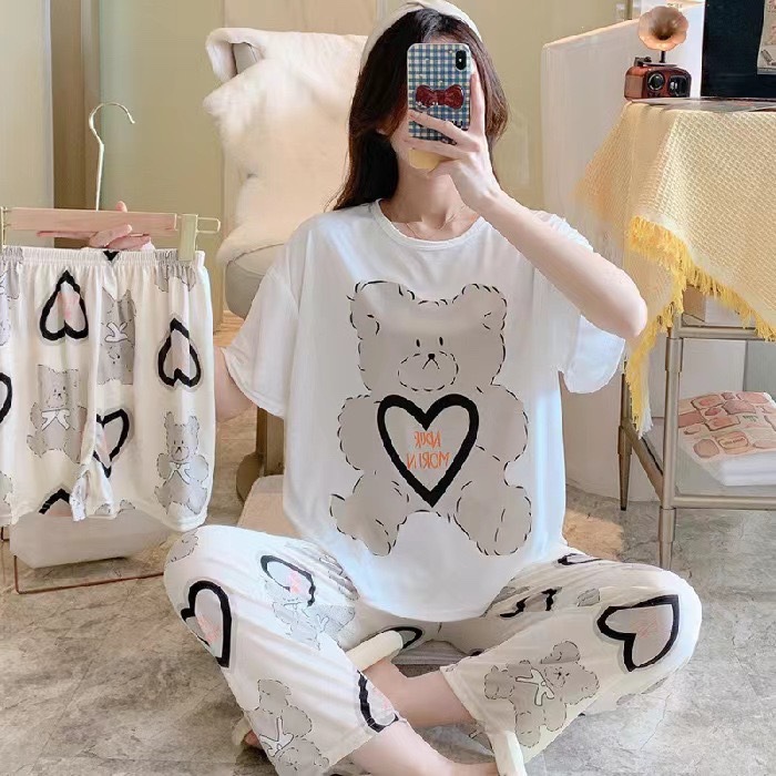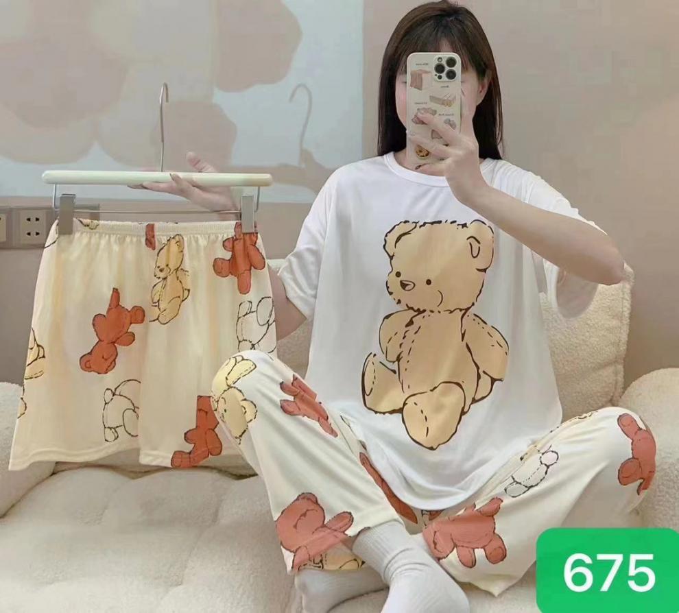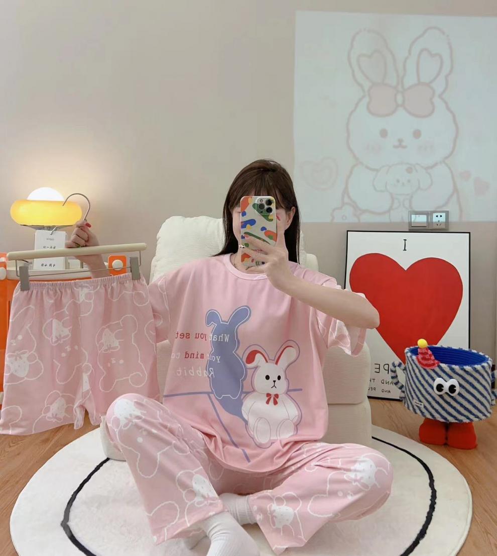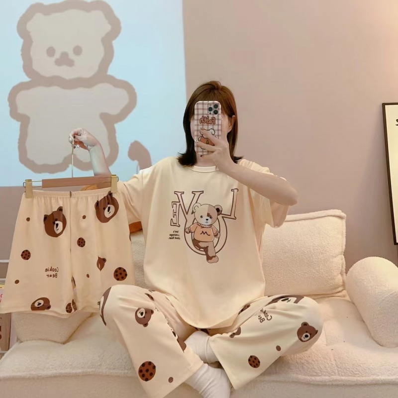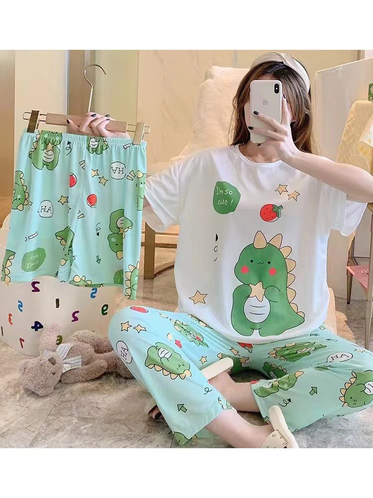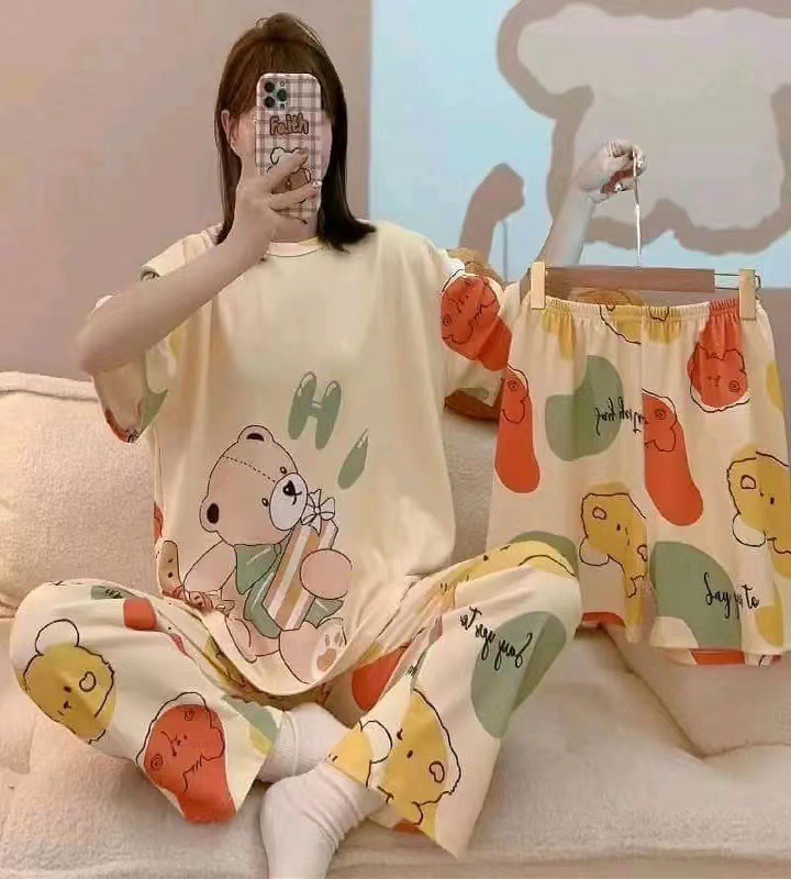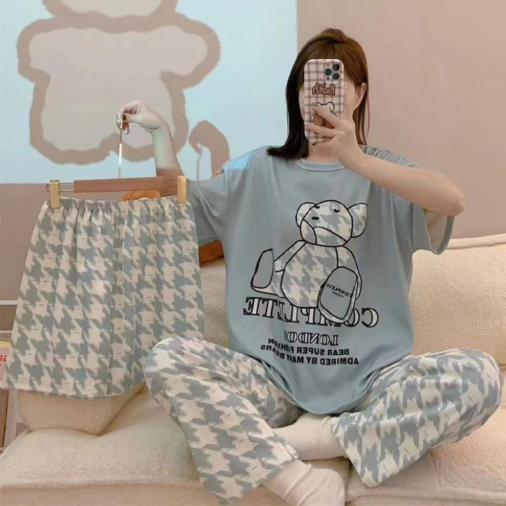 2024 새로운 여름 단면 우유 실크 귀여운 달콤한 만화 짧은 소매 3 피스 잠옷 세트스토어 가기