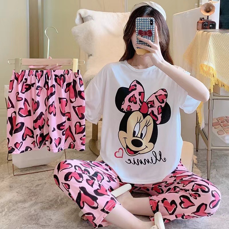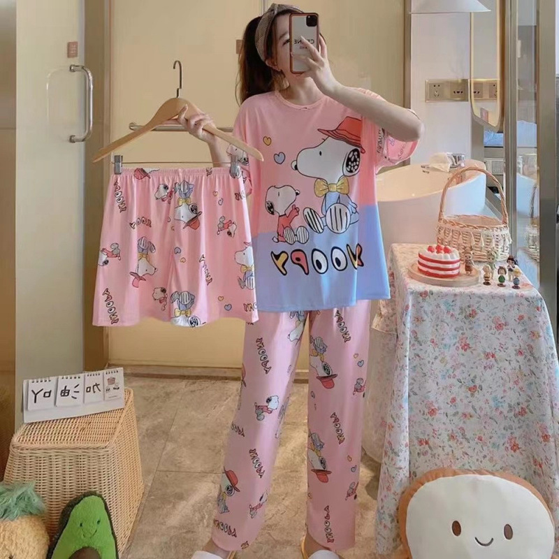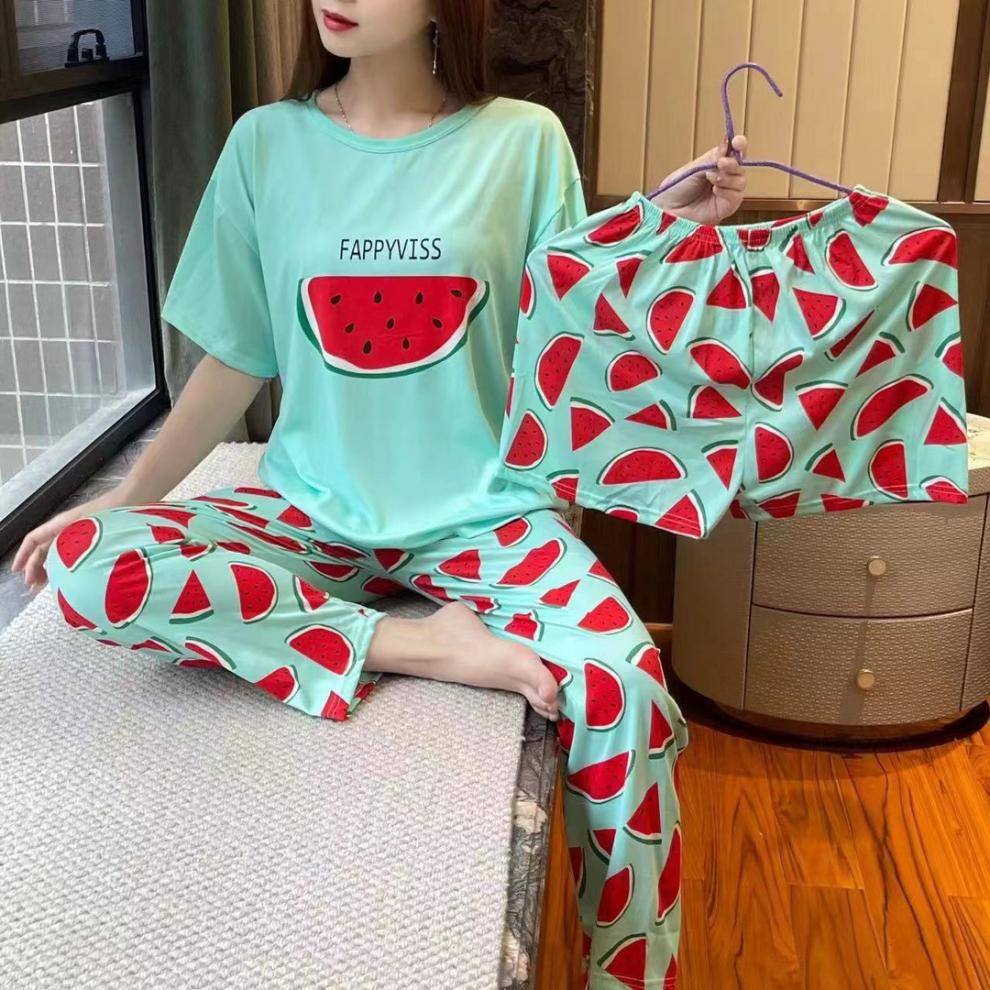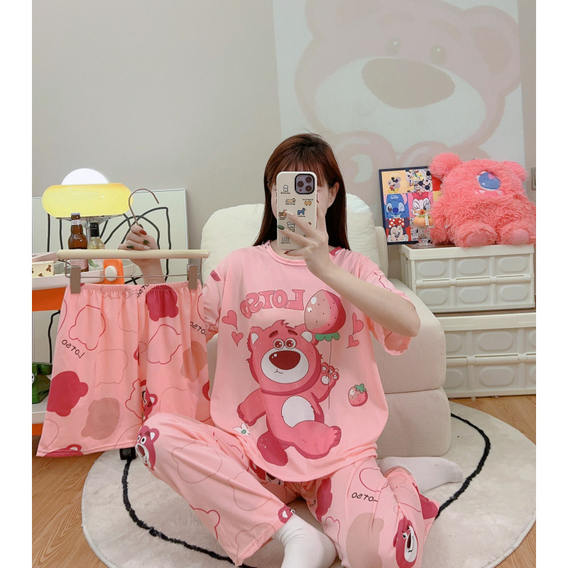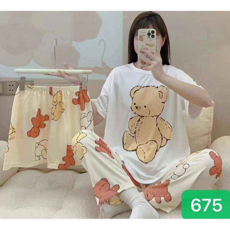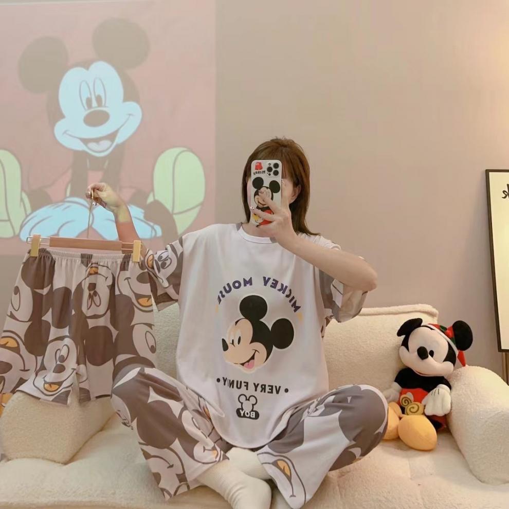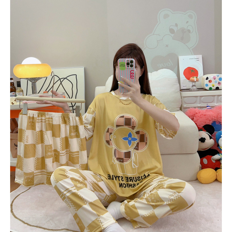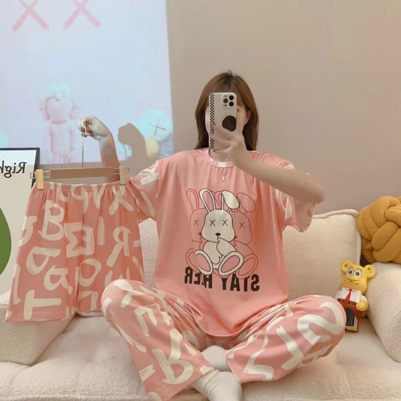 2024 새로운 여름 단면 우유 실크 귀여운 달콤한 만화 짧은 소매 3 피스 잠옷 세트스토어 가기
