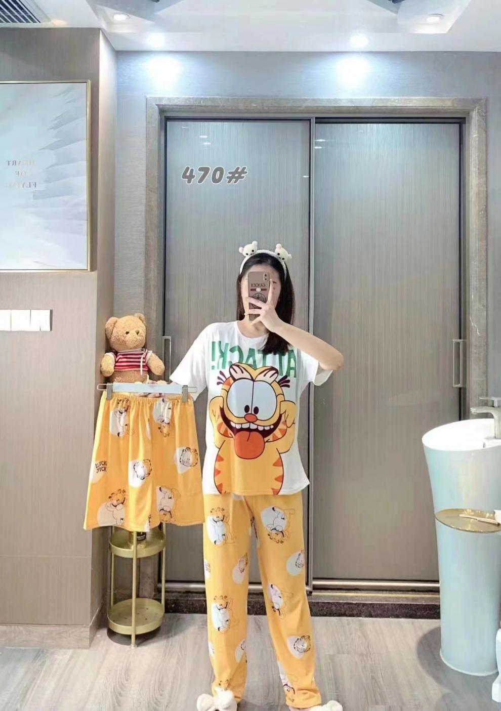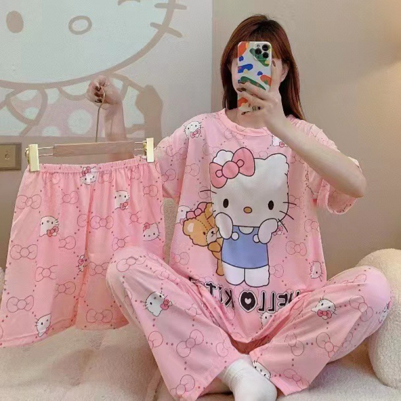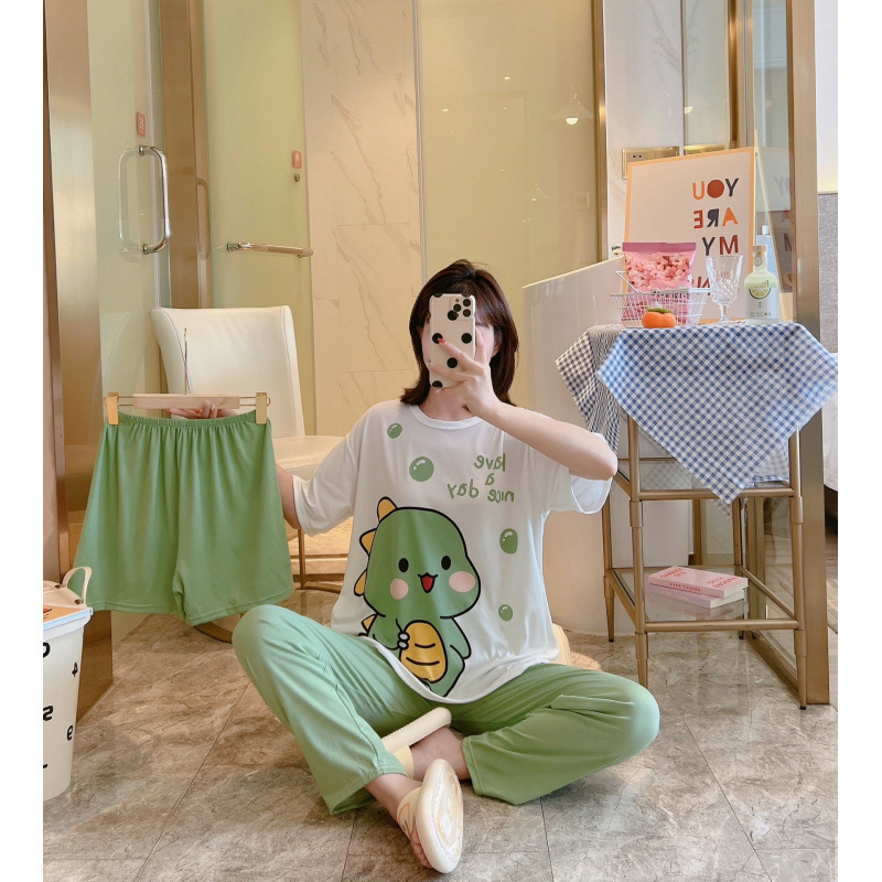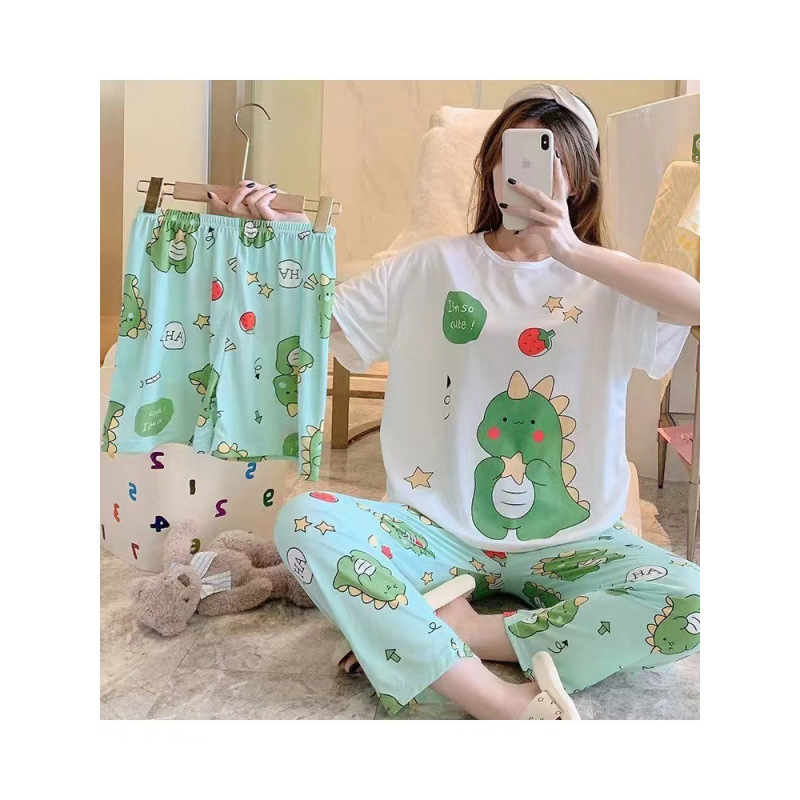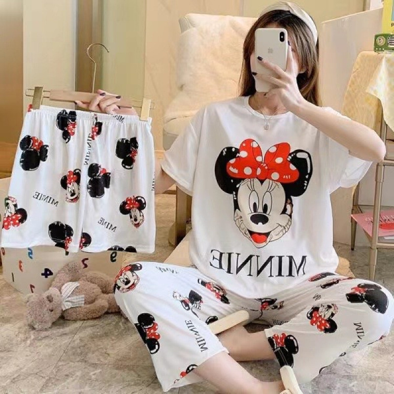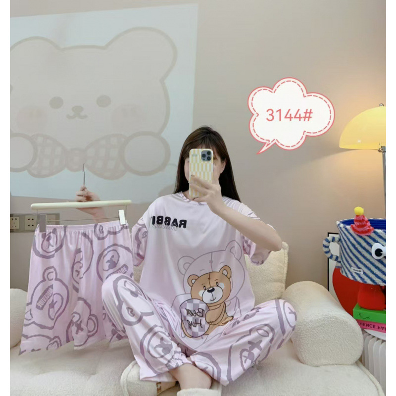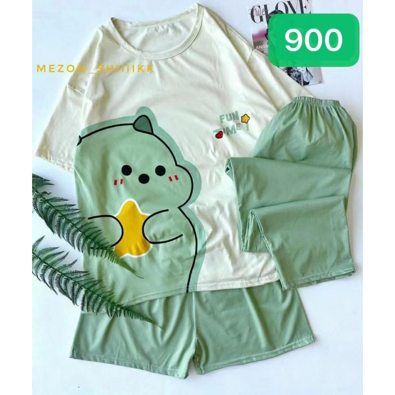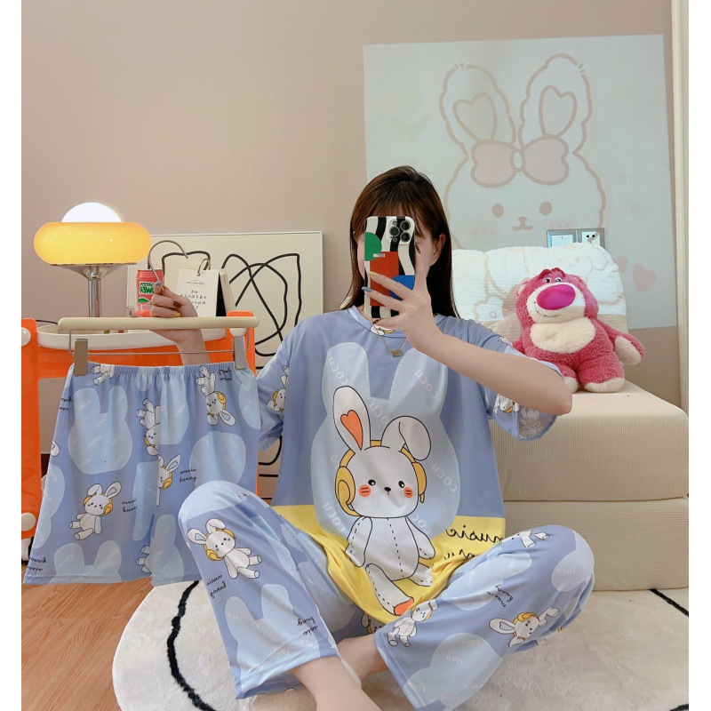 2024 새로운 여름 단면 우유 실크 귀여운 달콤한 만화 짧은 소매 3 피스 잠옷 세트스토어 가기