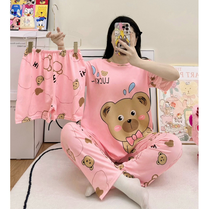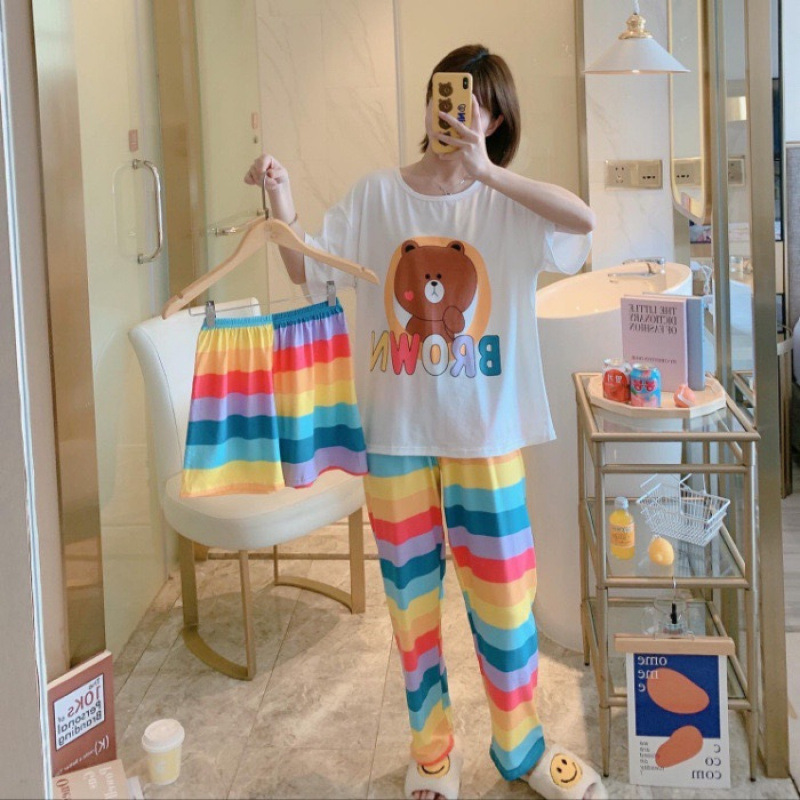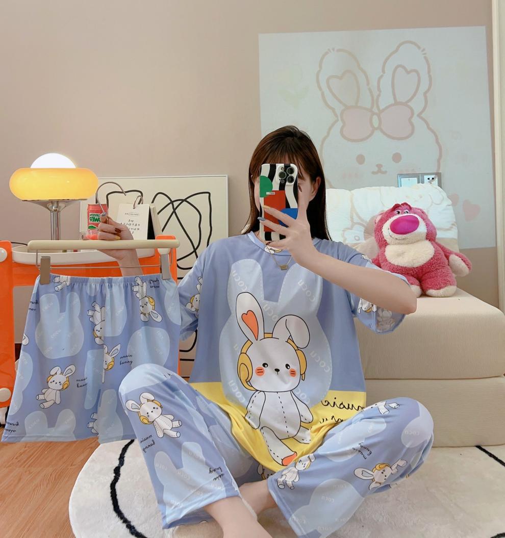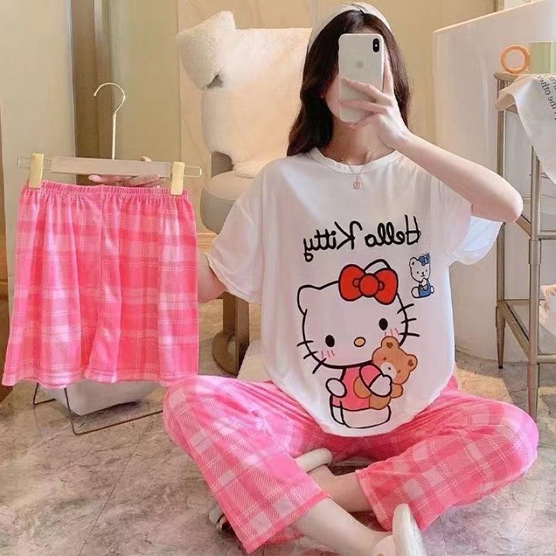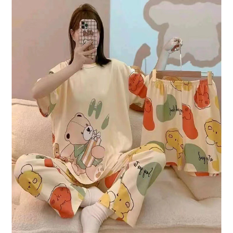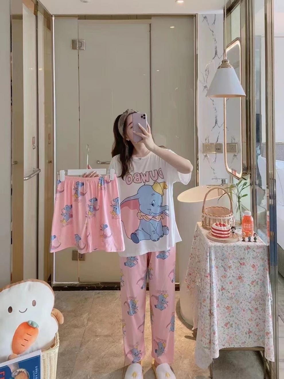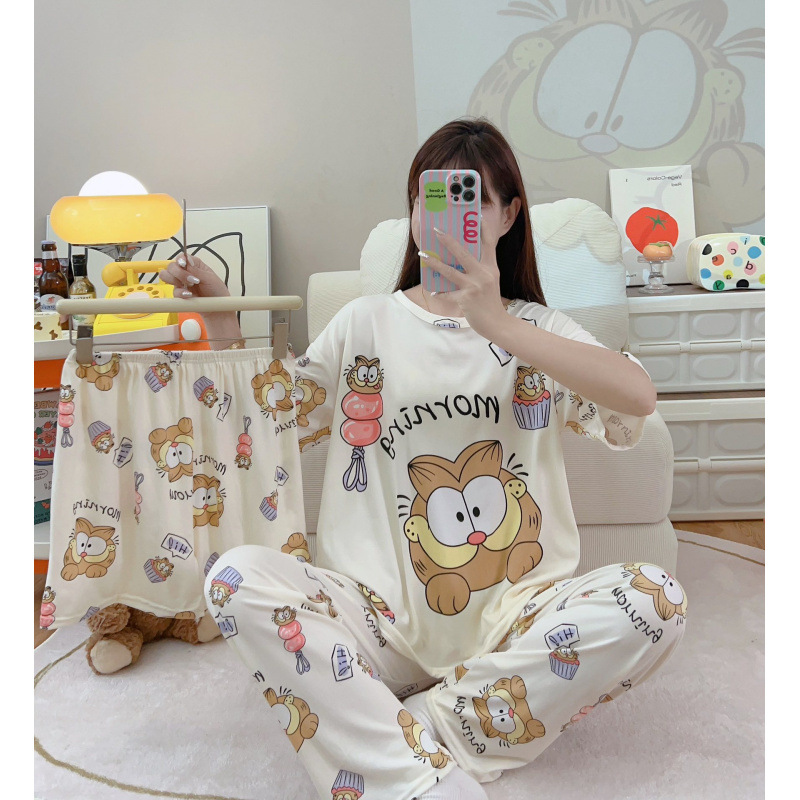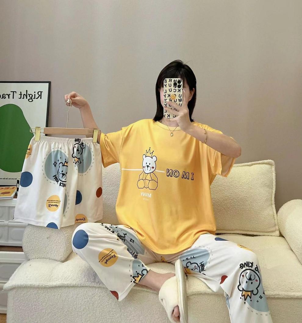 2024 새로운 여름 단면 우유 실크 귀여운 달콤한 만화 짧은 소매 3 피스 잠옷 세트스토어 가기