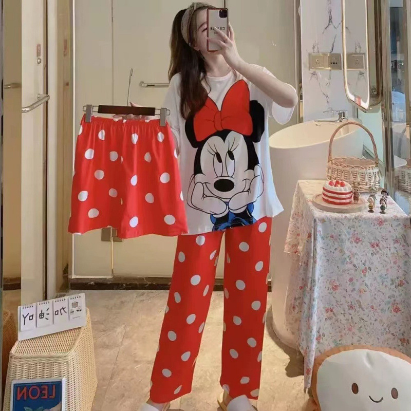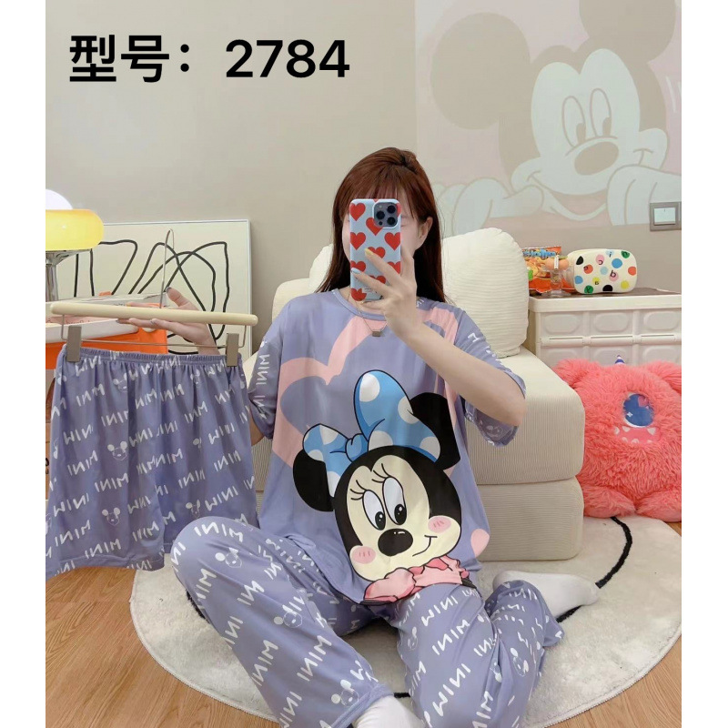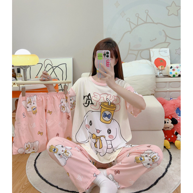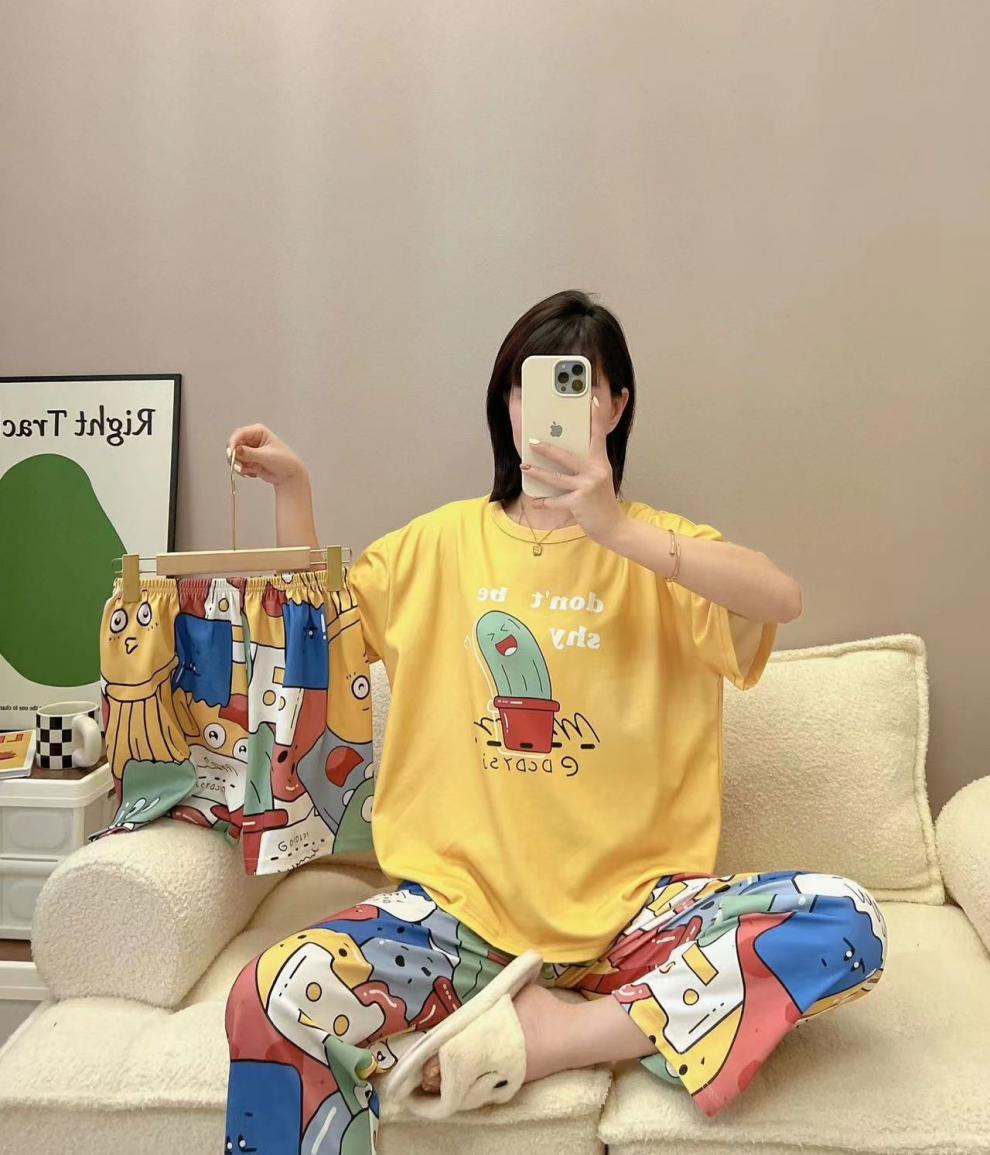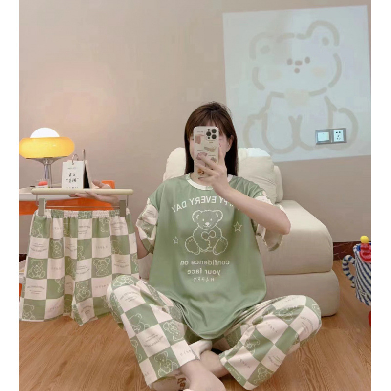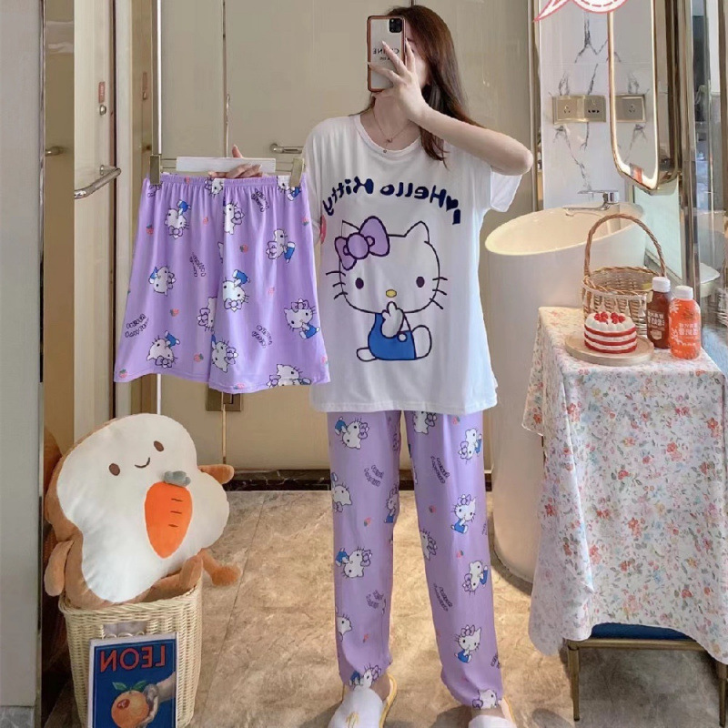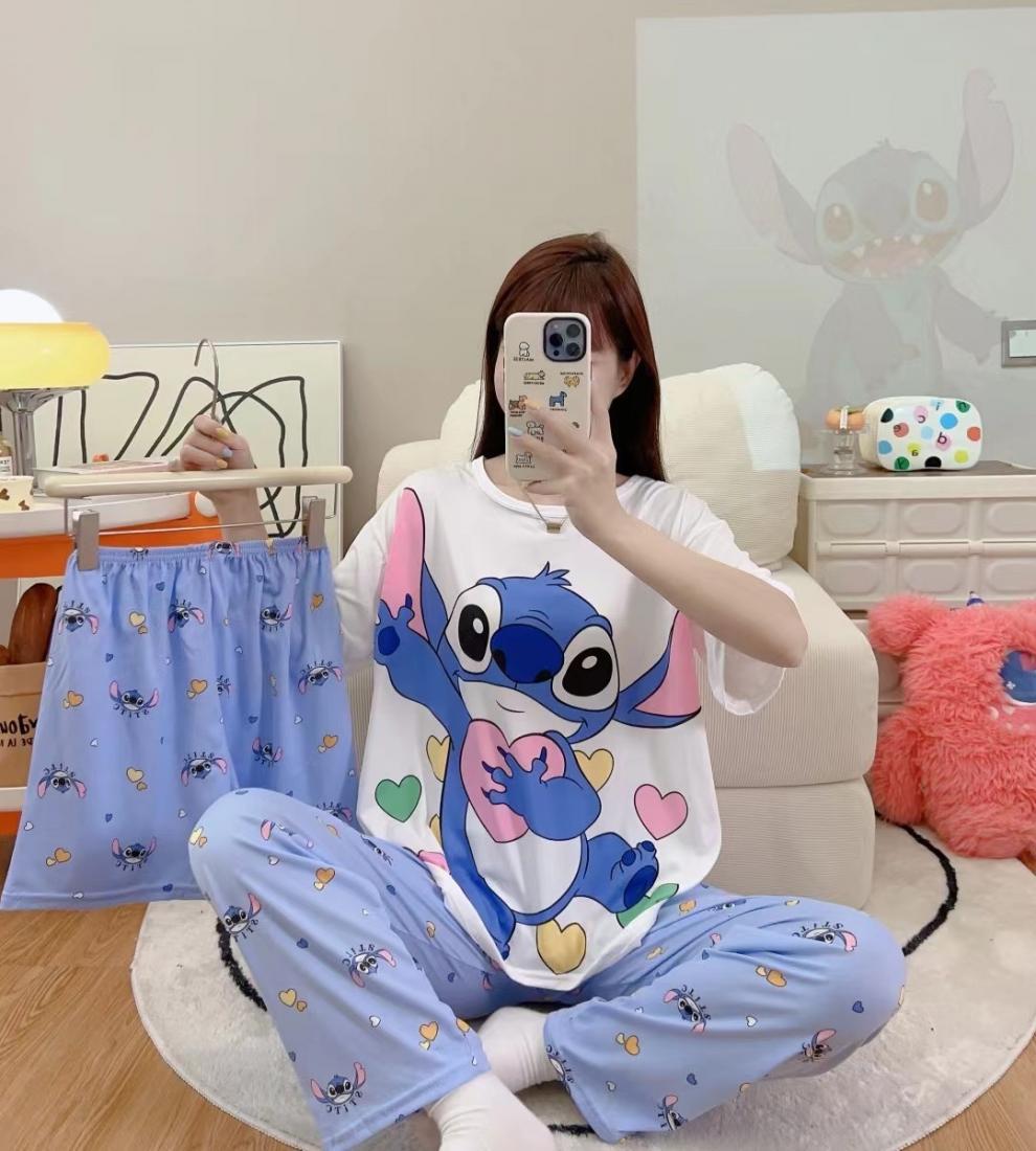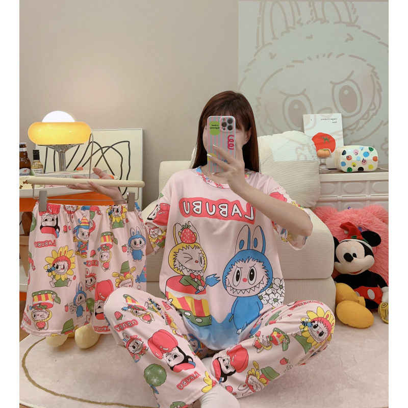 2024 새로운 여름 단면 우유 실크 귀여운 달콤한 만화 짧은 소매 3 피스 잠옷 세트스토어 가기