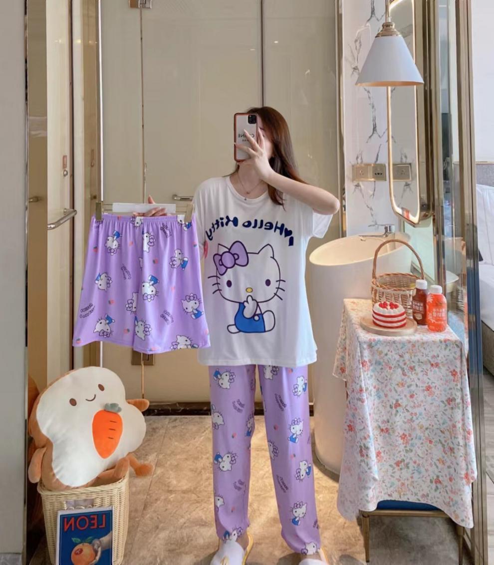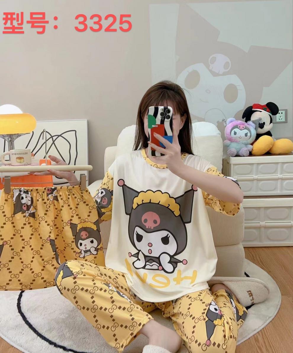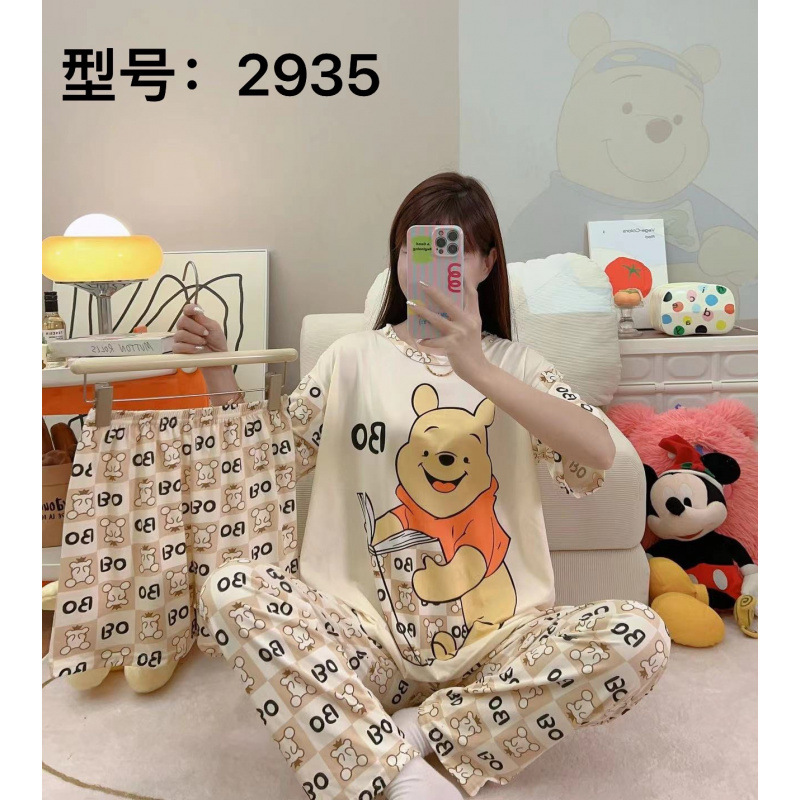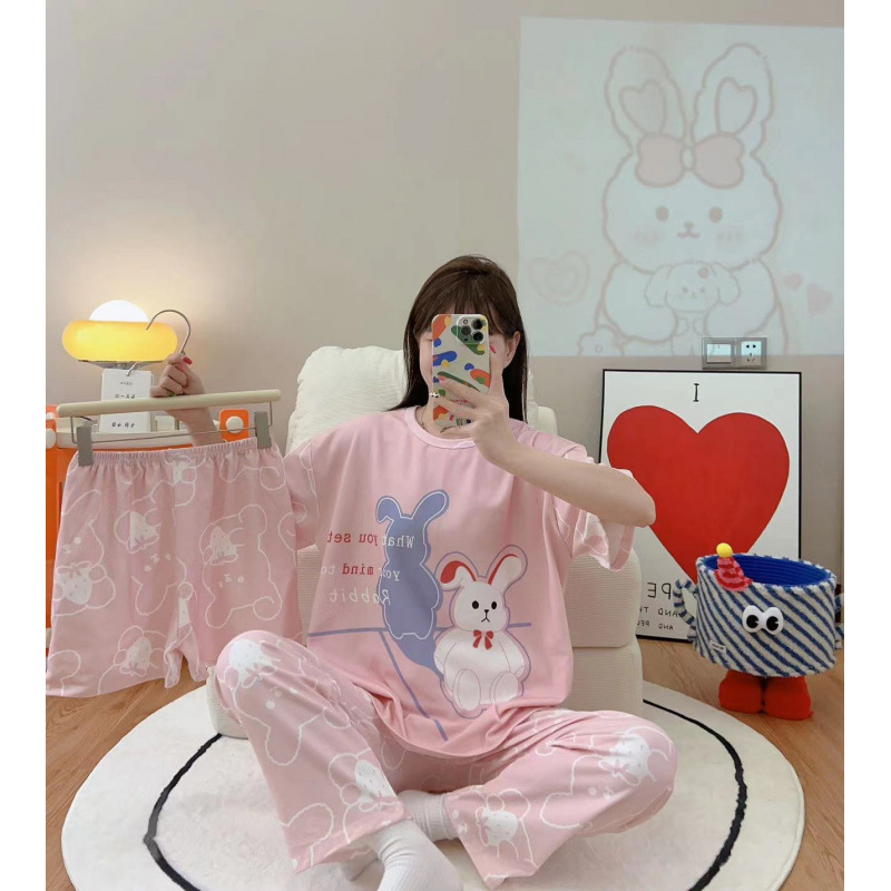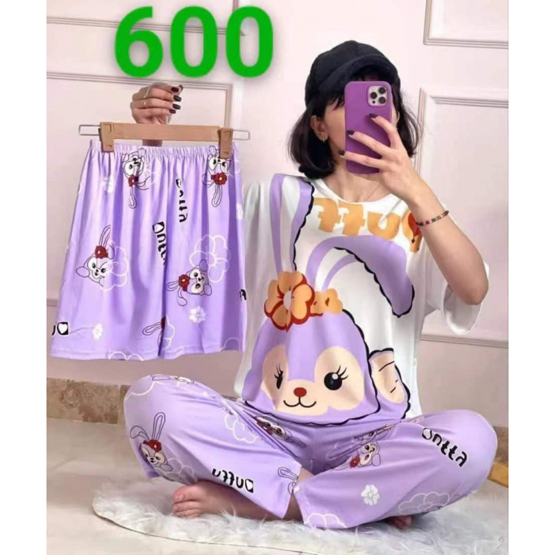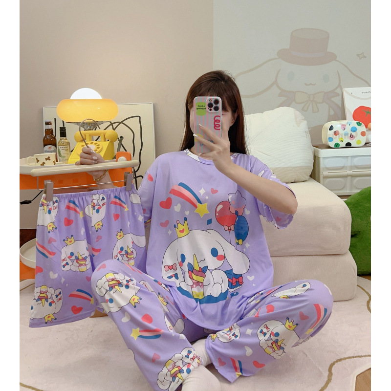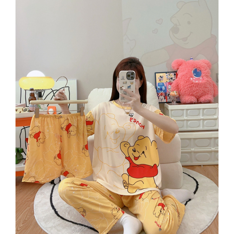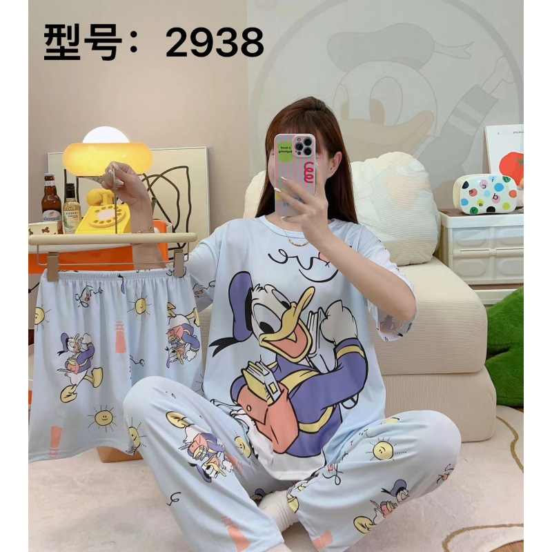2024 새로운 여름 단면 우유 실크 귀여운 달콤한 만화 짧은 소매 3 피스 잠옷 세트스토어 가기