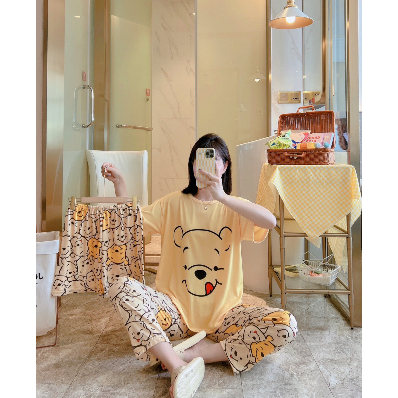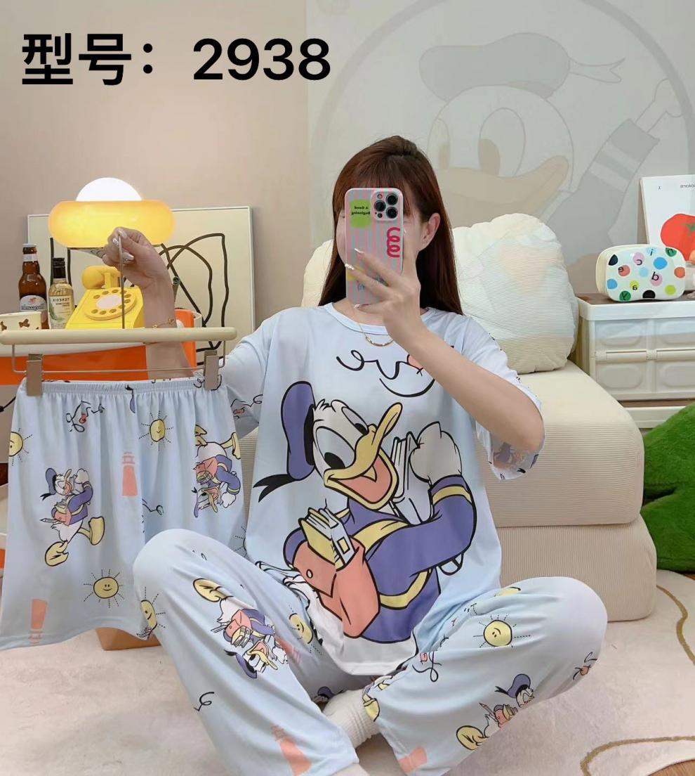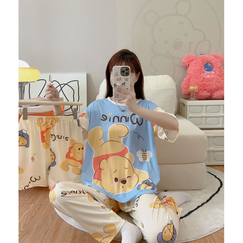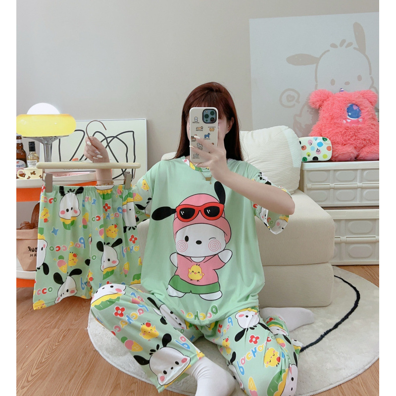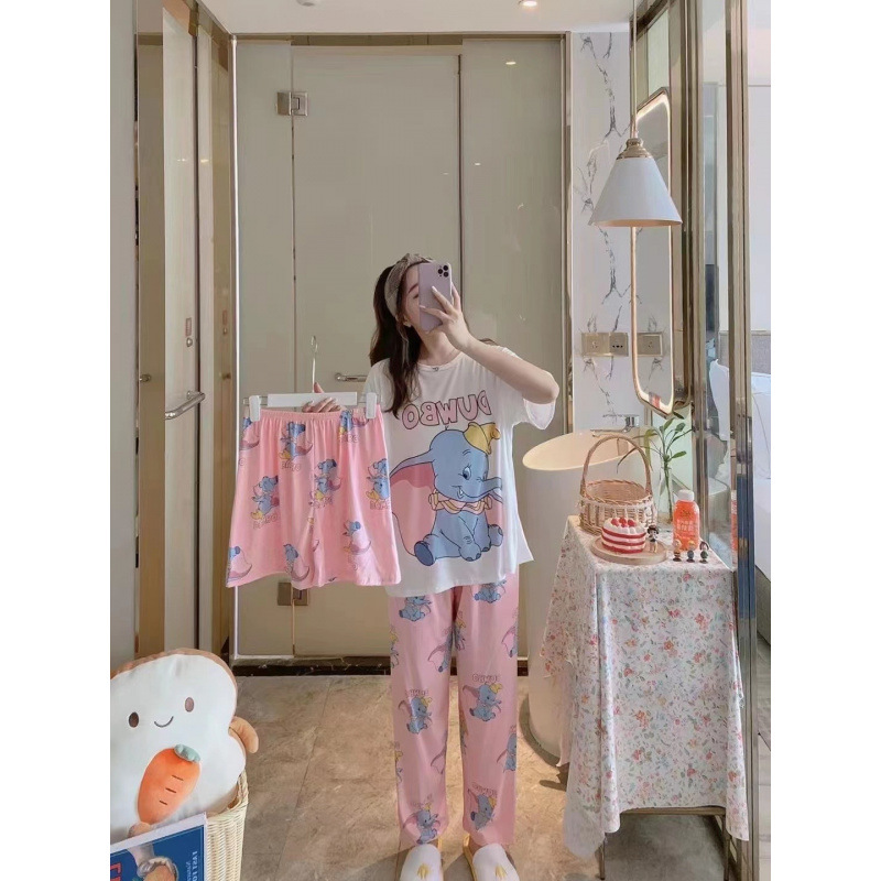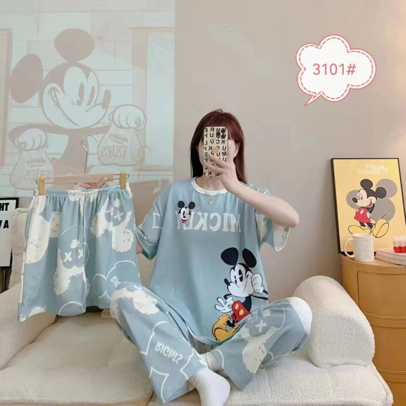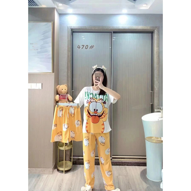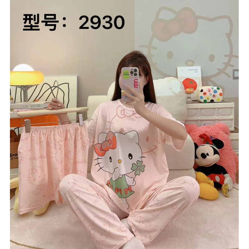 2024 새로운 여름 단면 우유 실크 귀여운 달콤한 만화 짧은 소매 3 피스 잠옷 세트스토어 가기
