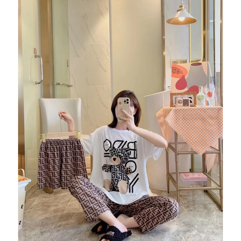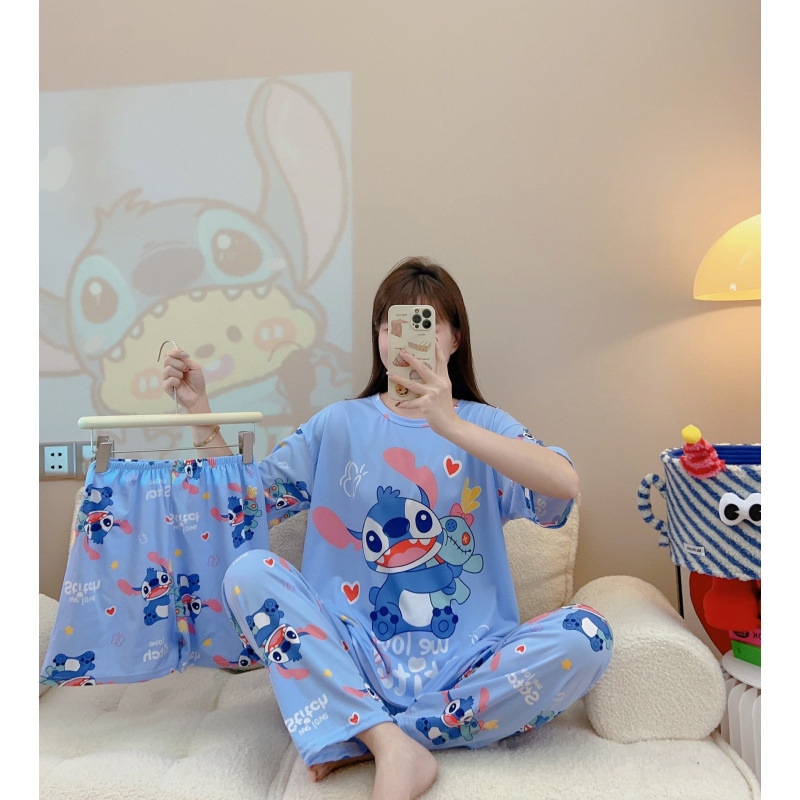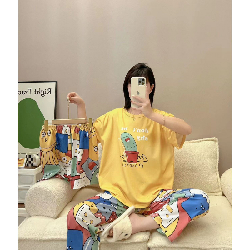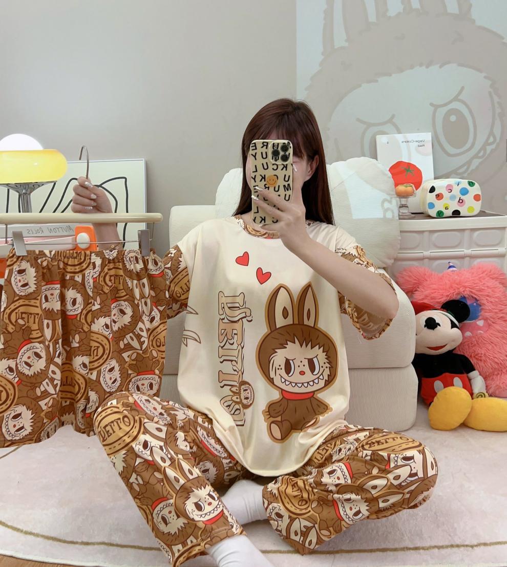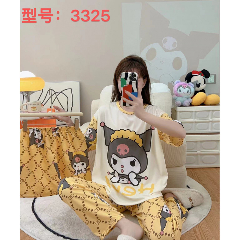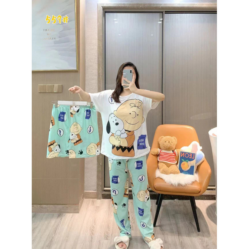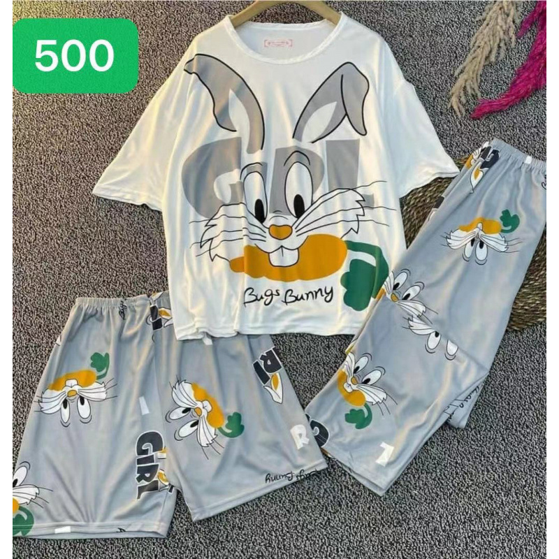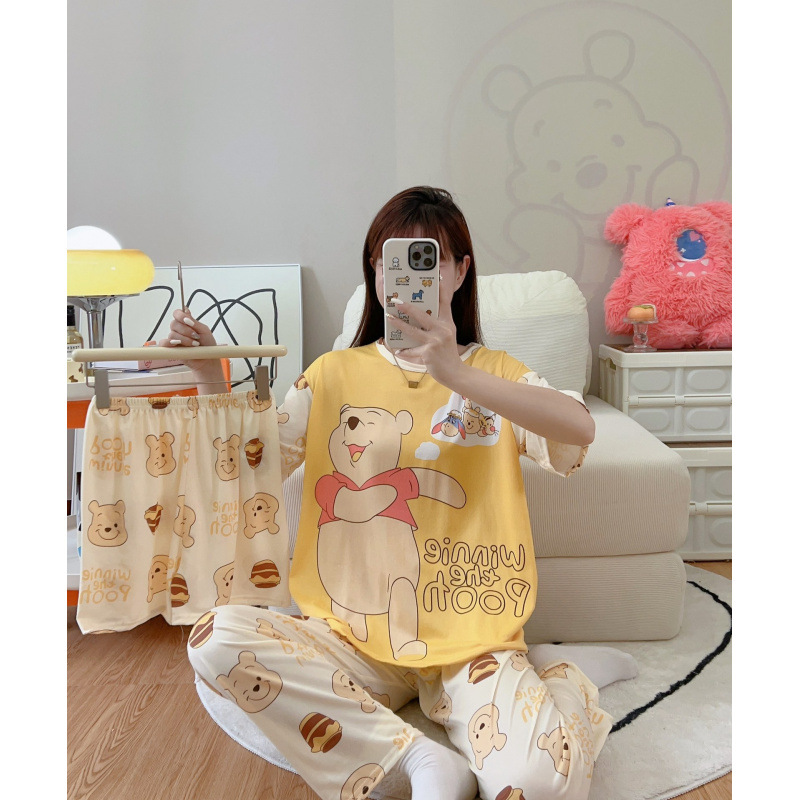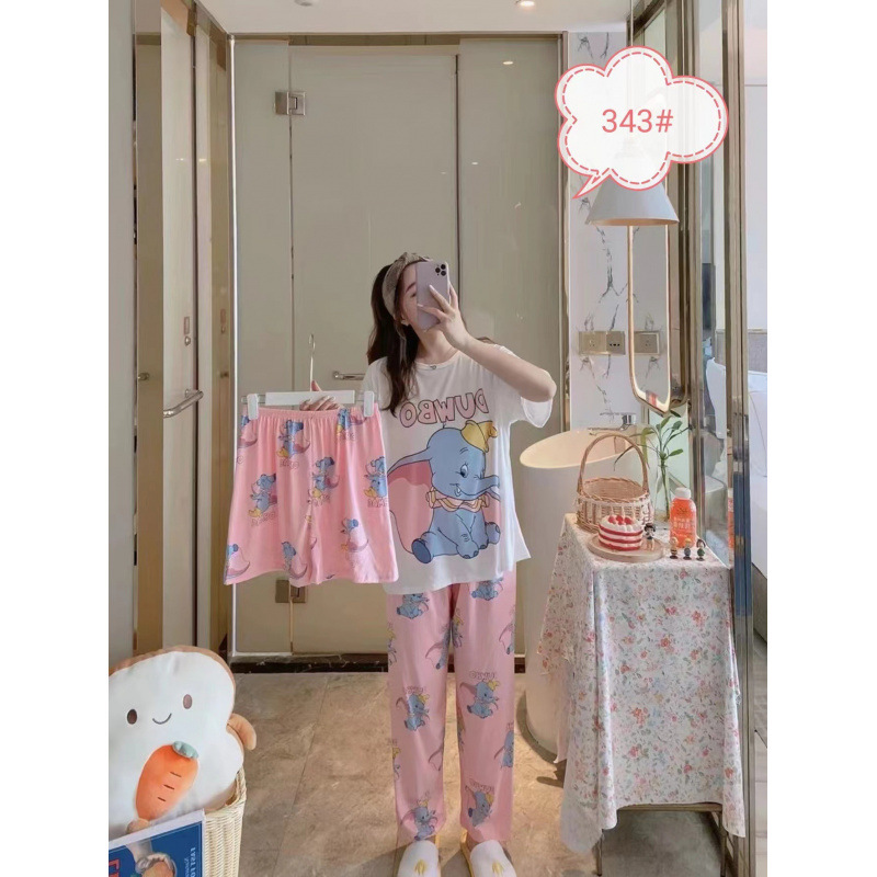 2024 새로운 여름 단면 우유 실크 귀여운 달콤한 만화 짧은 소매 3 피스 잠옷 세트스토어 가기