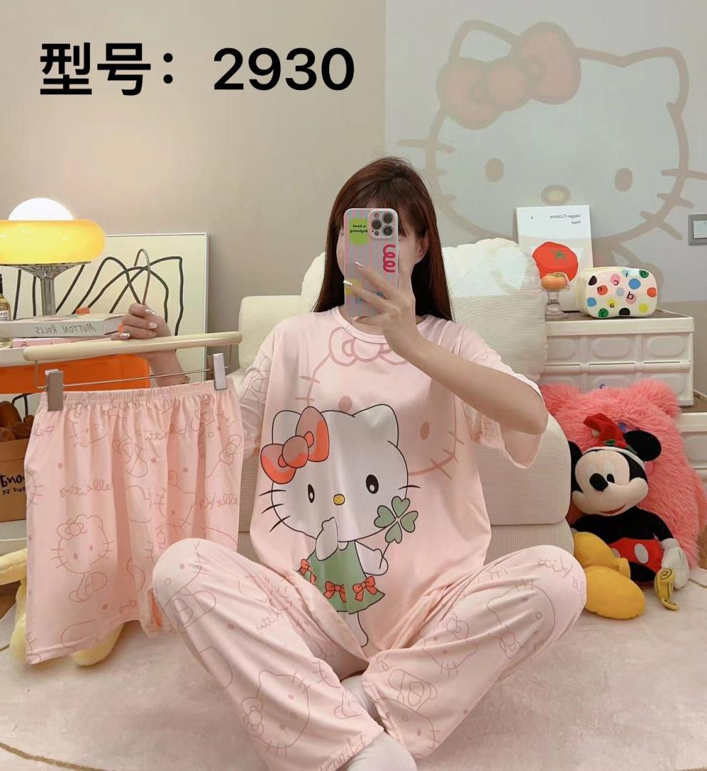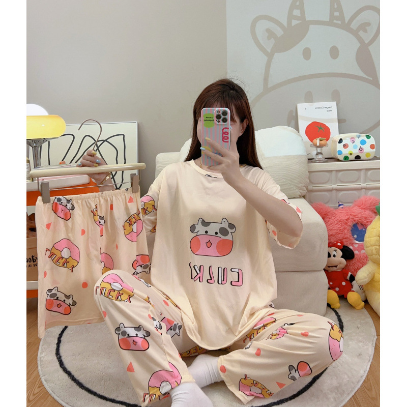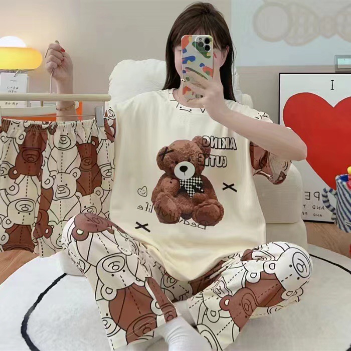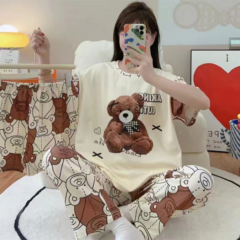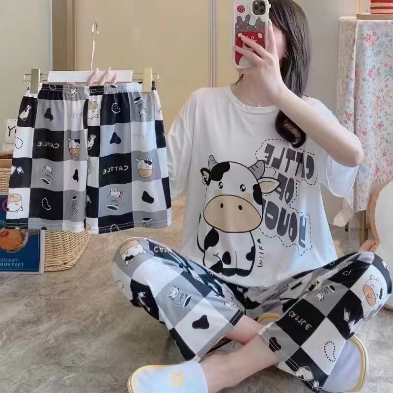 2024 새로운 여름 단면 우유 실크 귀여운 달콤한 만화 짧은 소매 3 피스 잠옷 세트