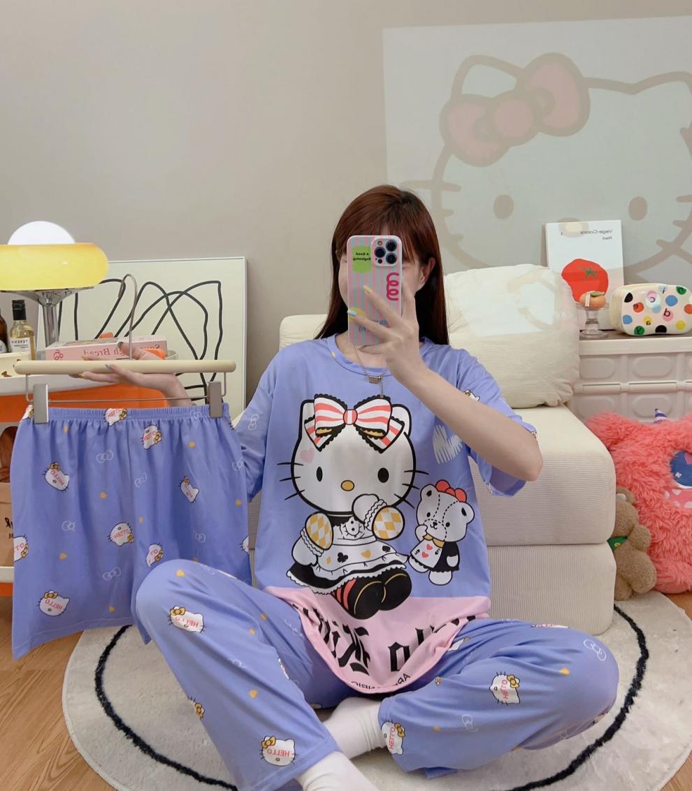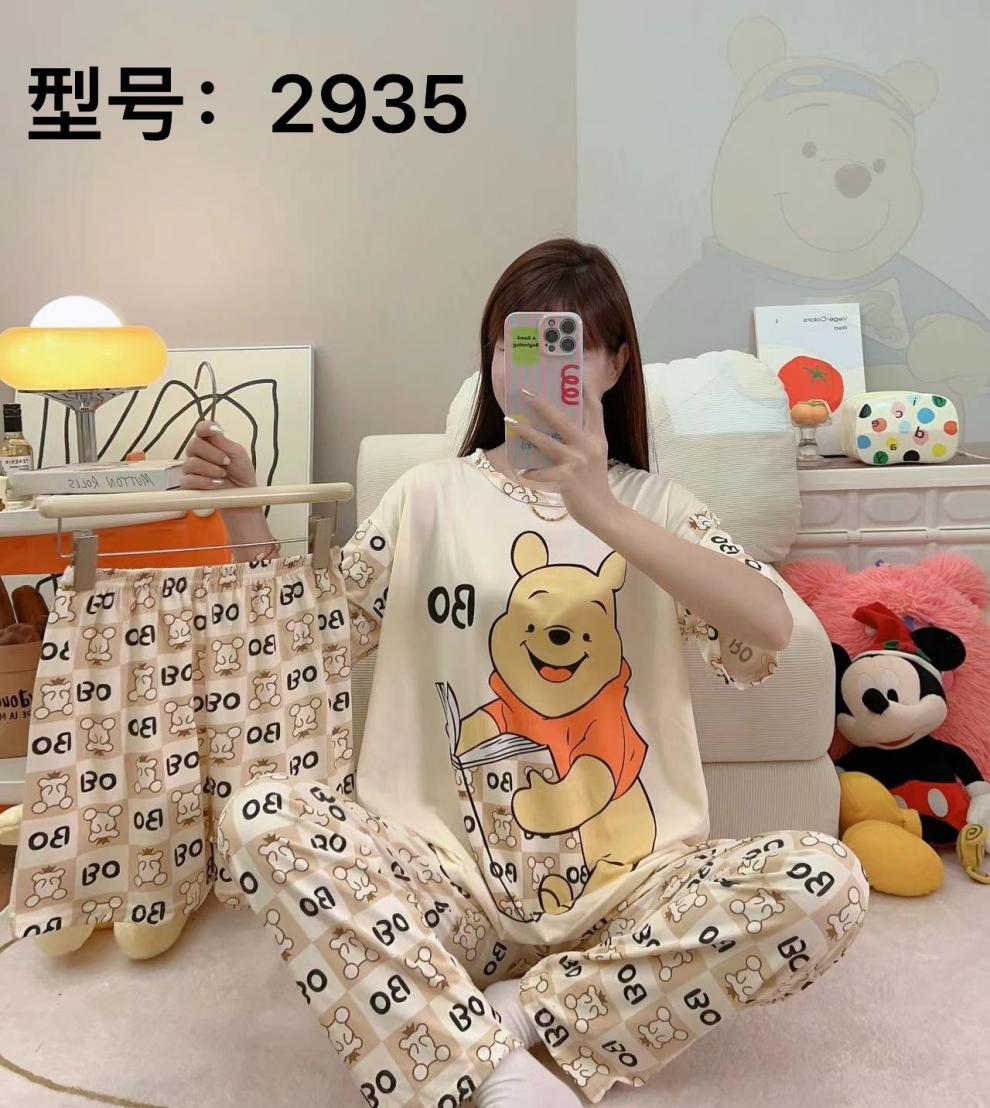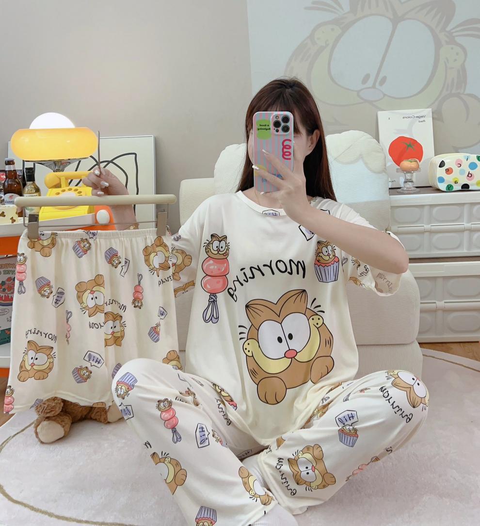 2024 새로운 여름 단면 우유 실크 귀여운 달콤한 만화 짧은 소매 3 피스 잠옷 세트