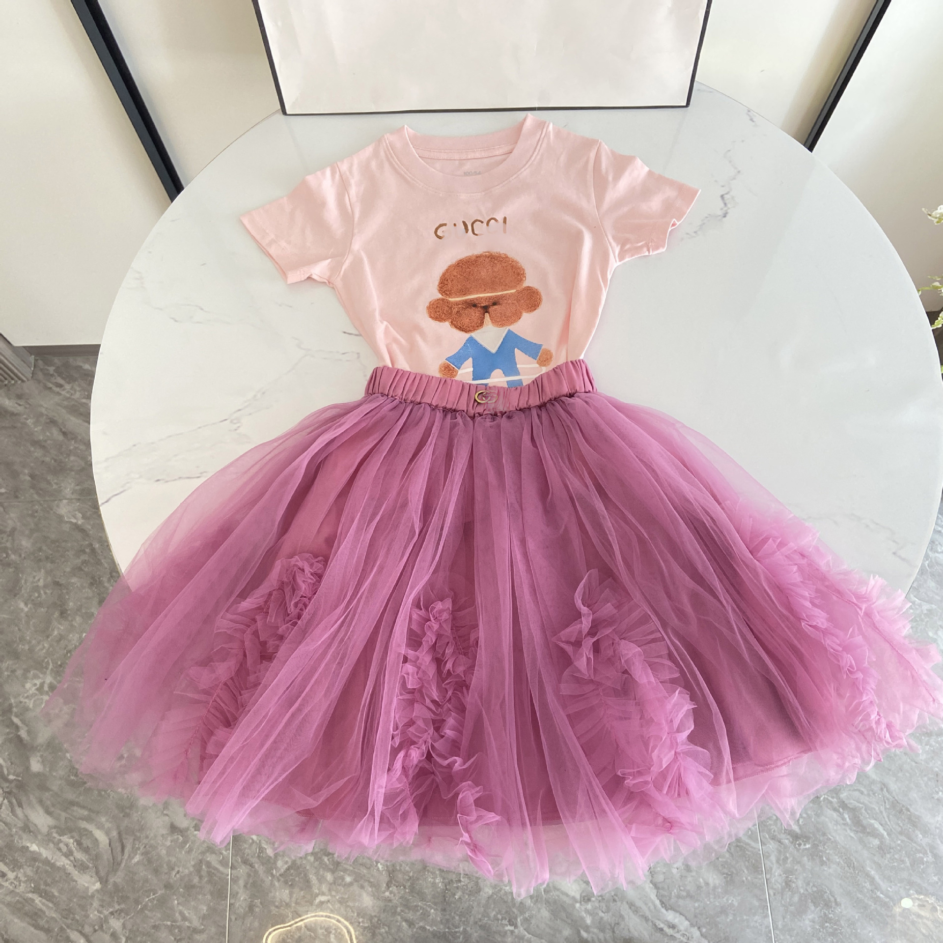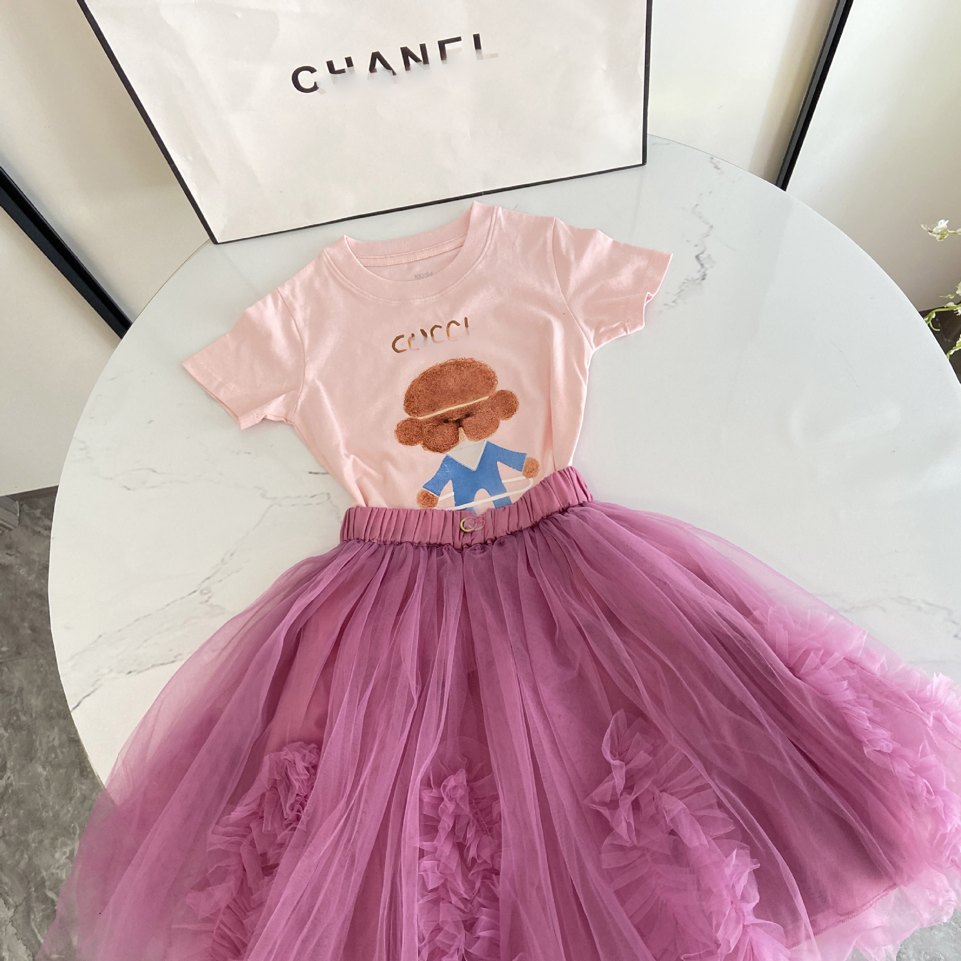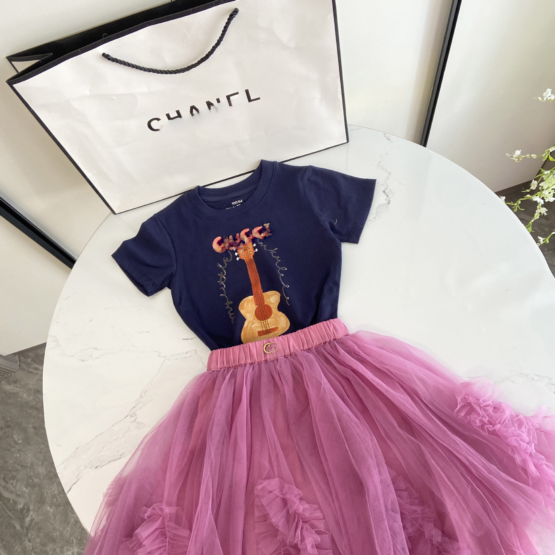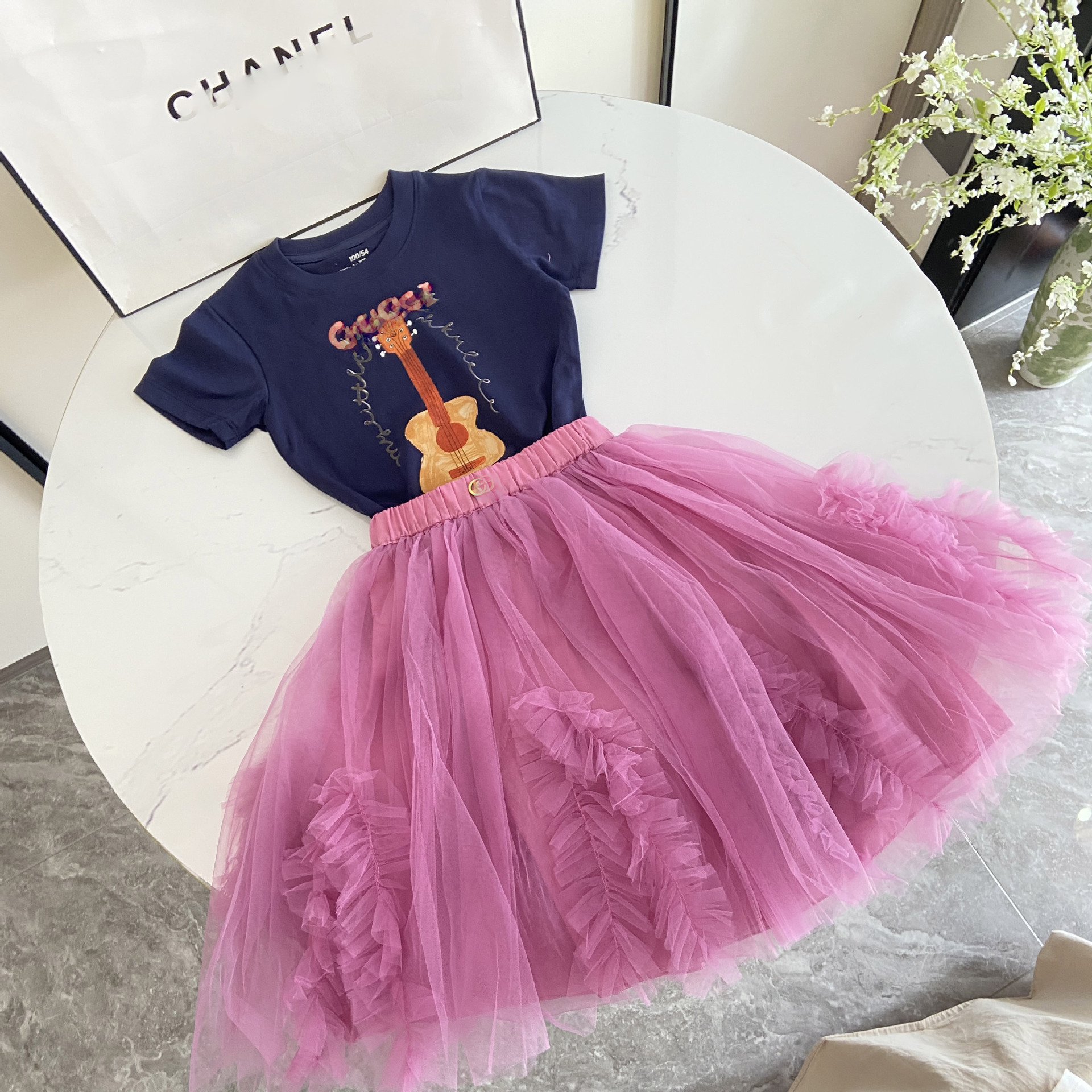 2025 새로운 여름 소녀 티셔츠 + 보라색 스커트 순수 코튼 반팔 프린트 탑 퍼프 스커트 유행 여성스토어 가기